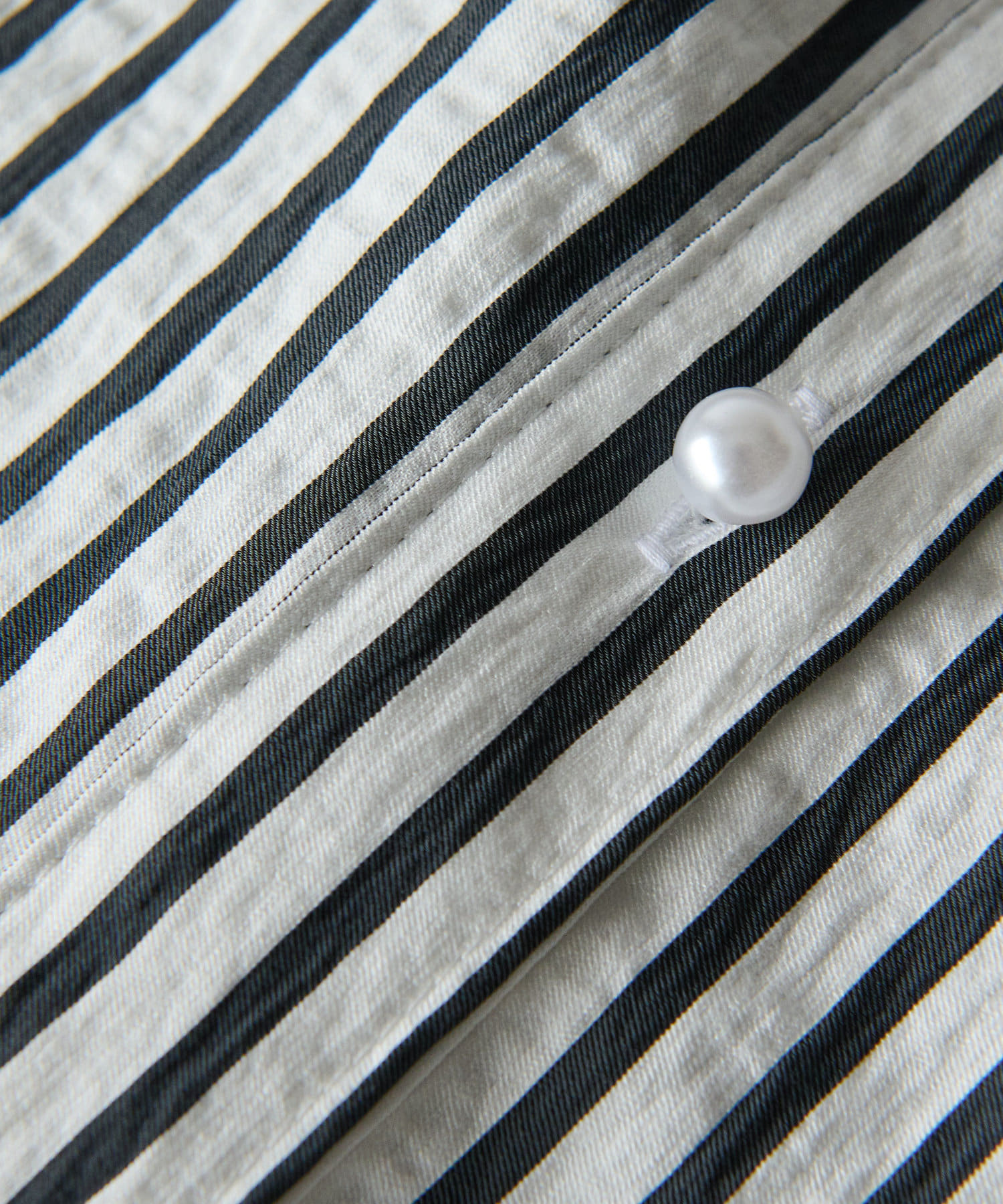 甘めイメージのパール釦をストライプ柄が引き締める