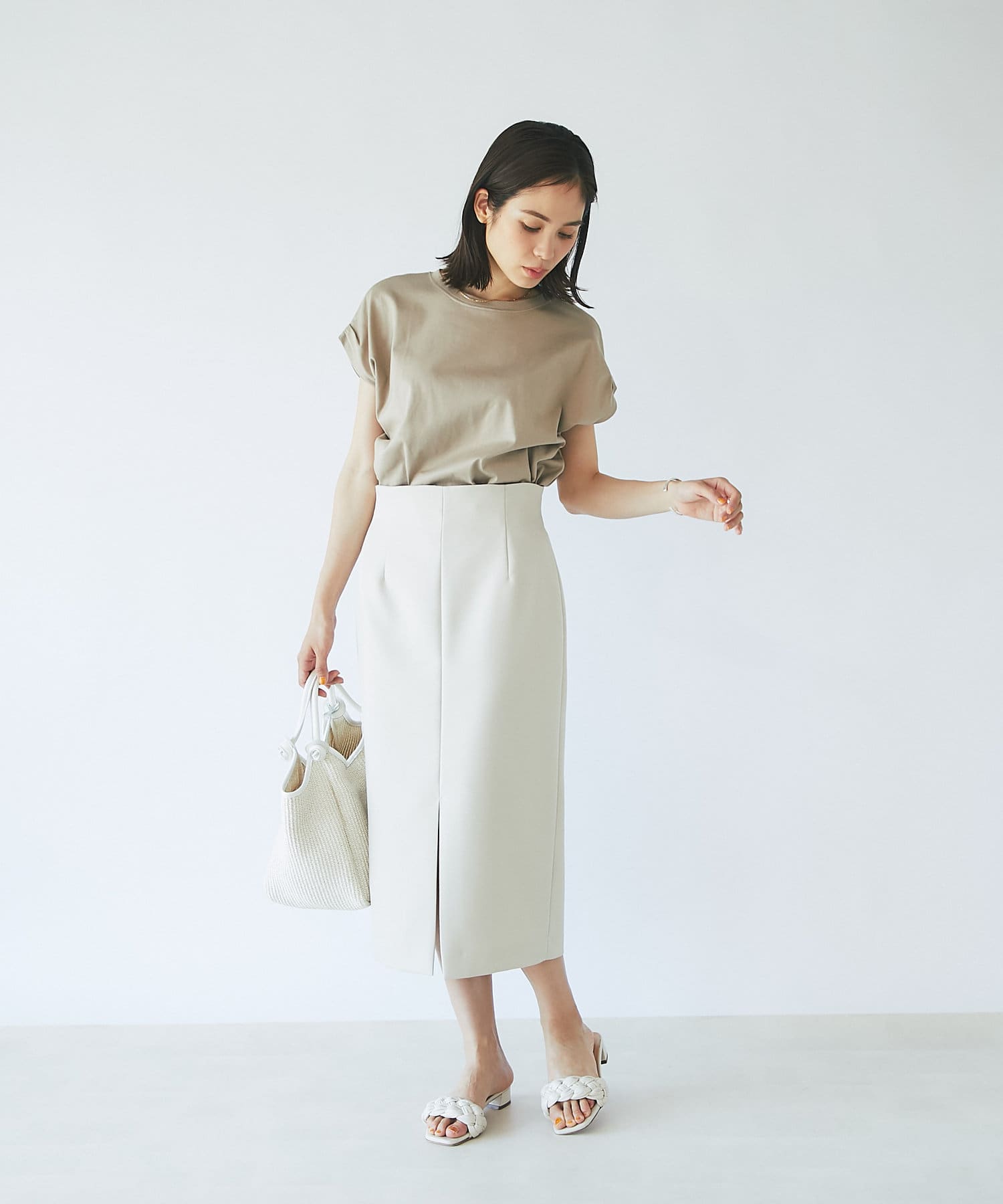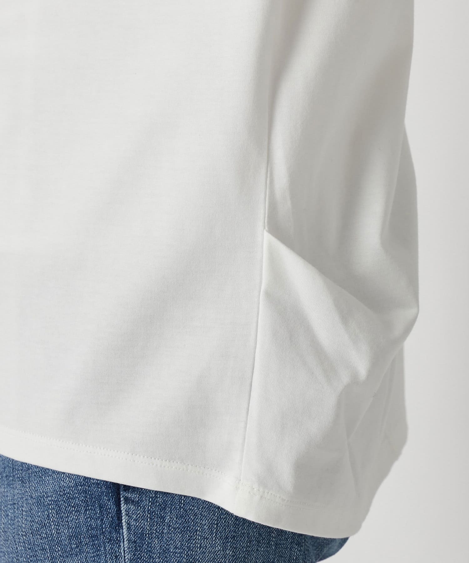 シンプルなデザインで着回しやすく、裾は後ろがやや長めになっているので、さり気なく腰まわりもカバーして、ボトムを選ばない使いやすいシルエットです。