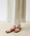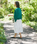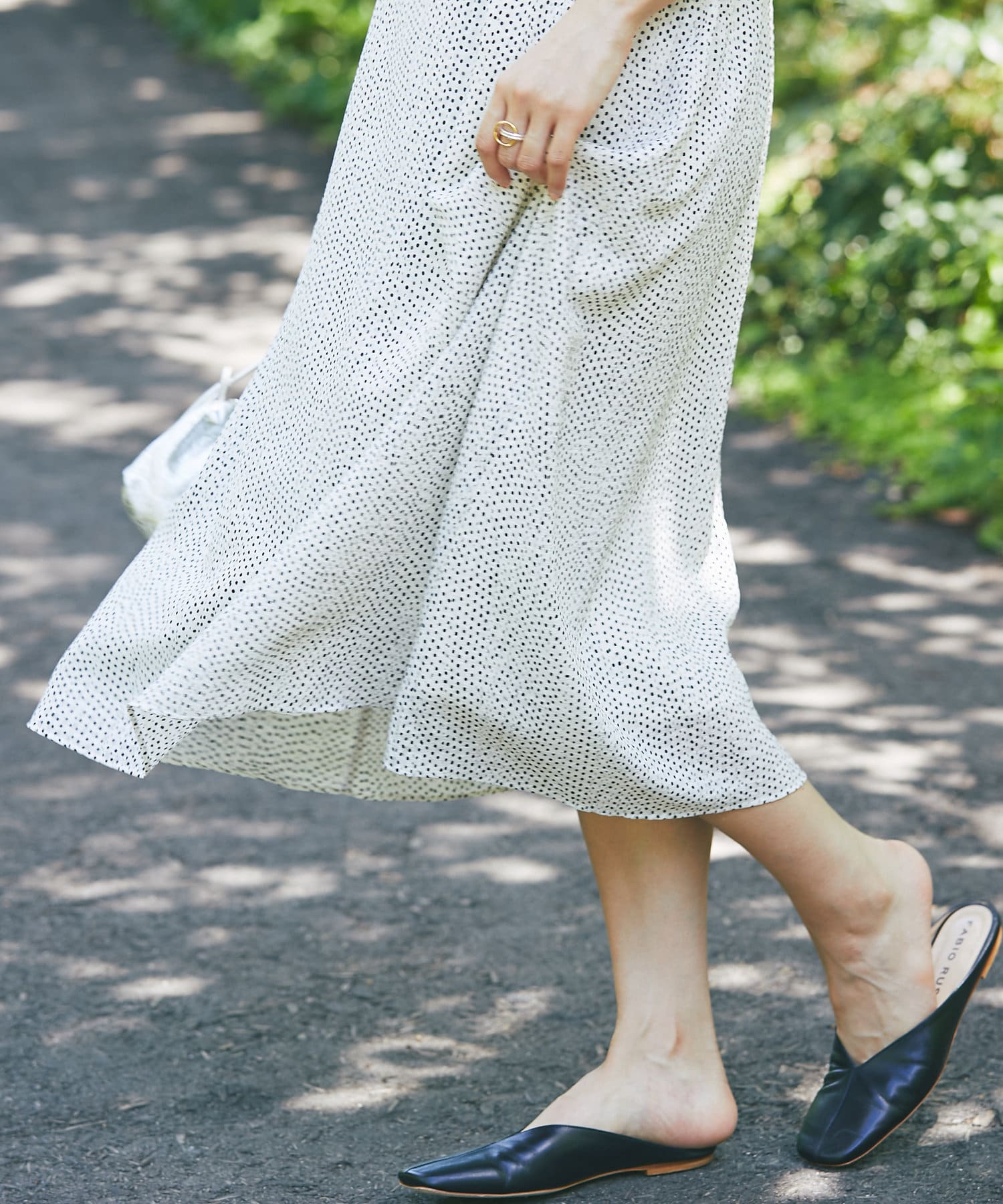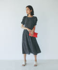 ウエストにはゴムを入れてギャザーを寄せているので、ウエストの細さを引き立ててこちらも女性らしく、スタイルアップにも一役買ってくれるシルエット。