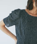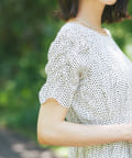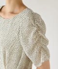 ギャザーでふんわりと膨らむ袖と、バックのVネックが女性らしさを演出。