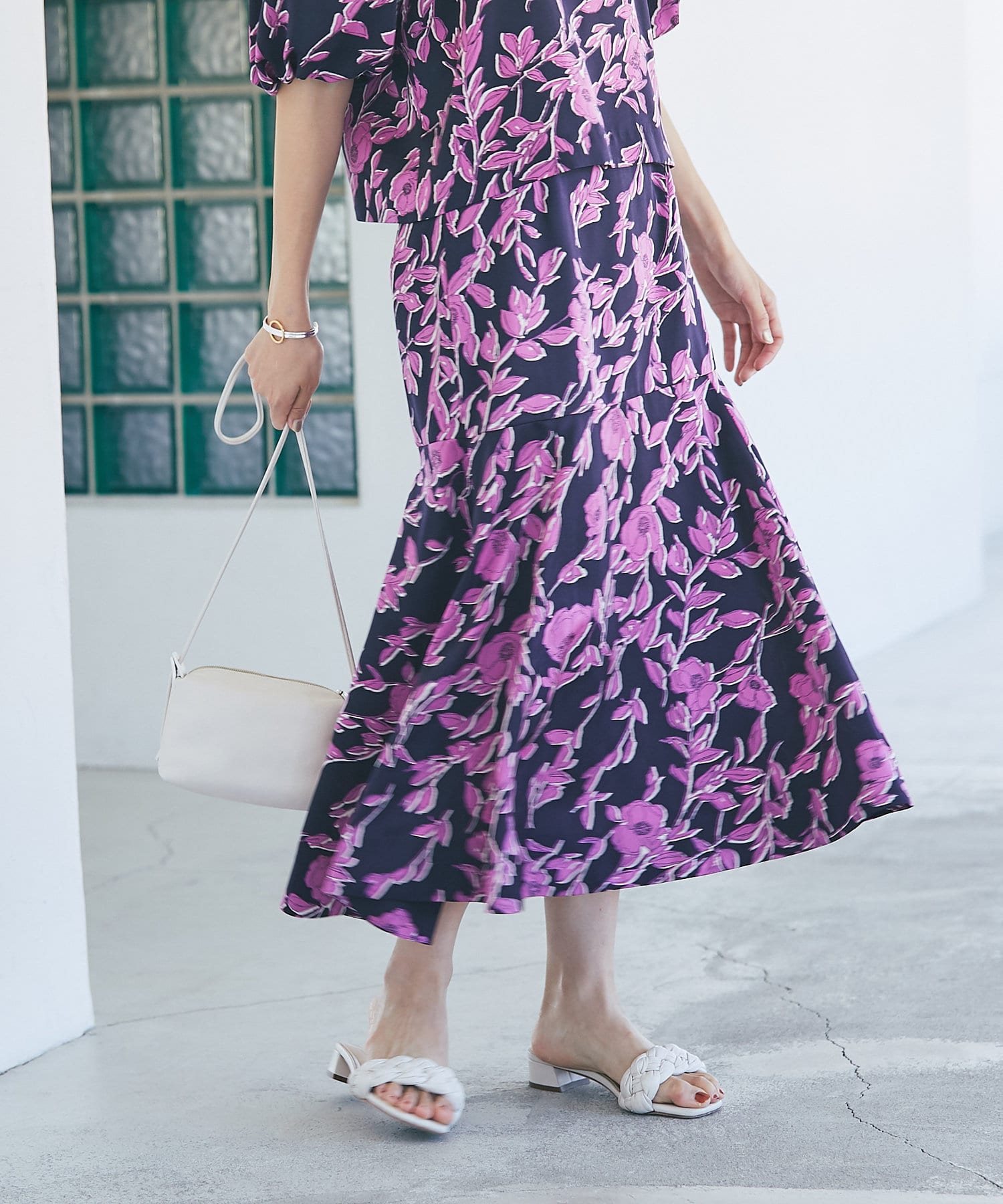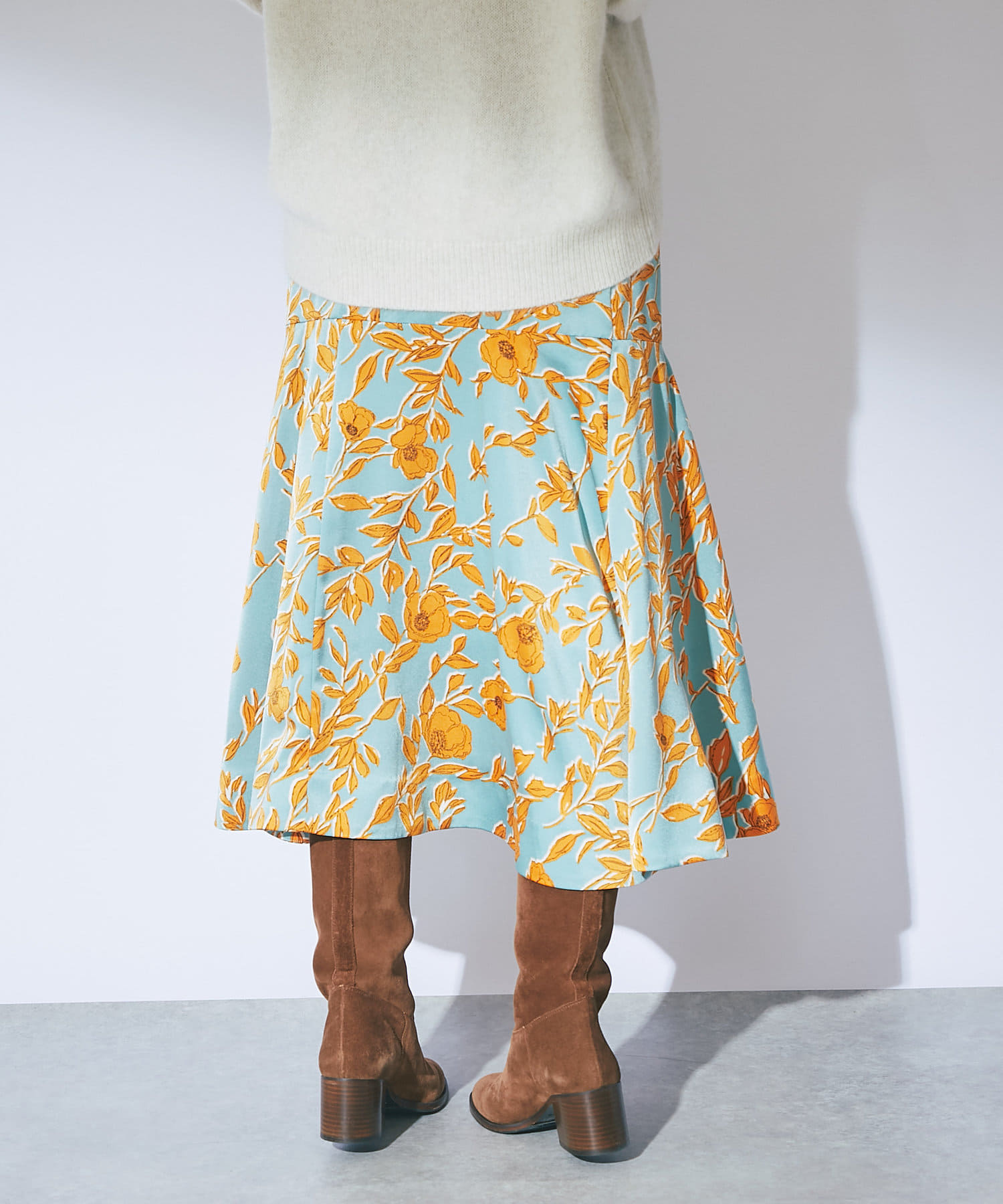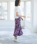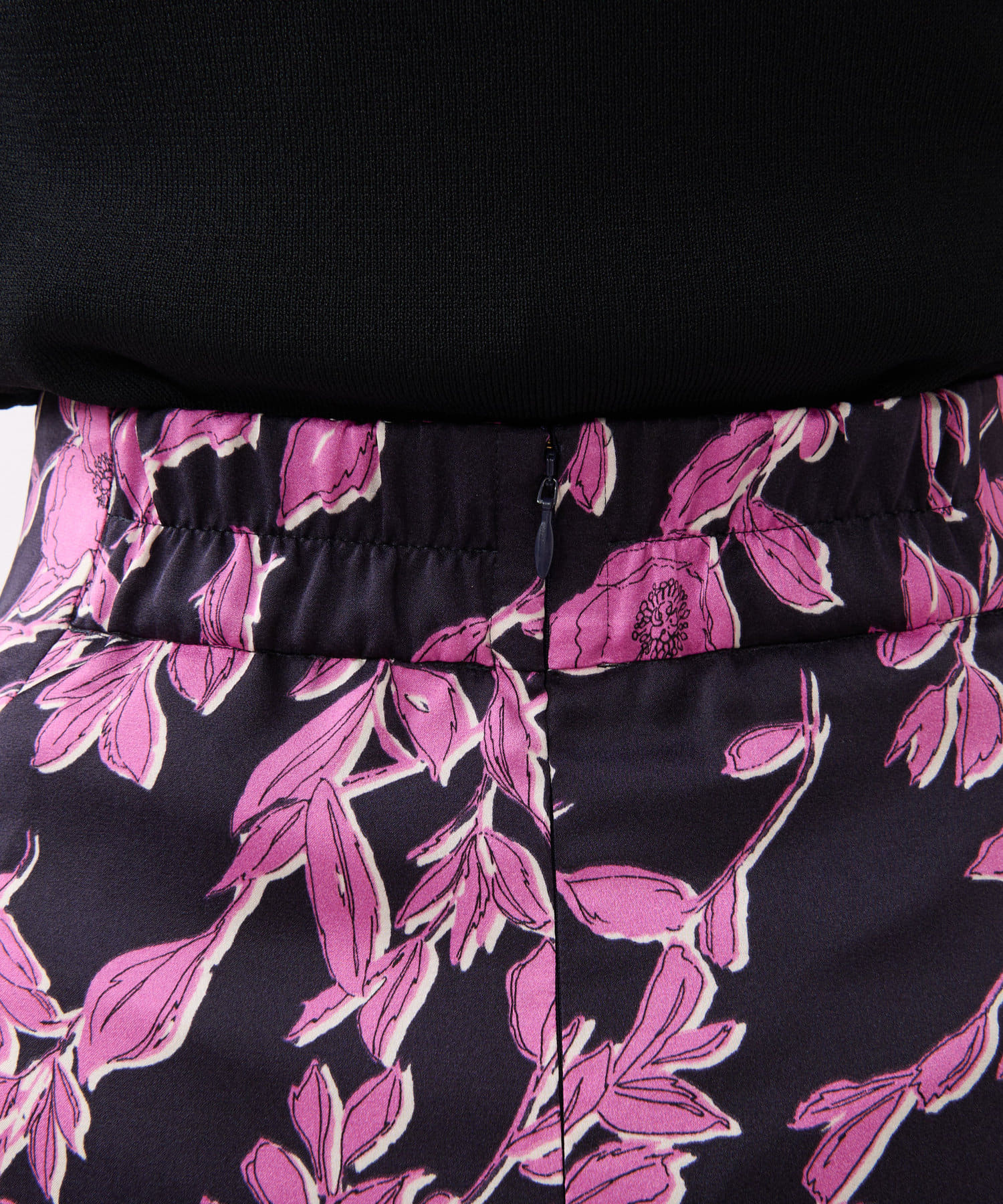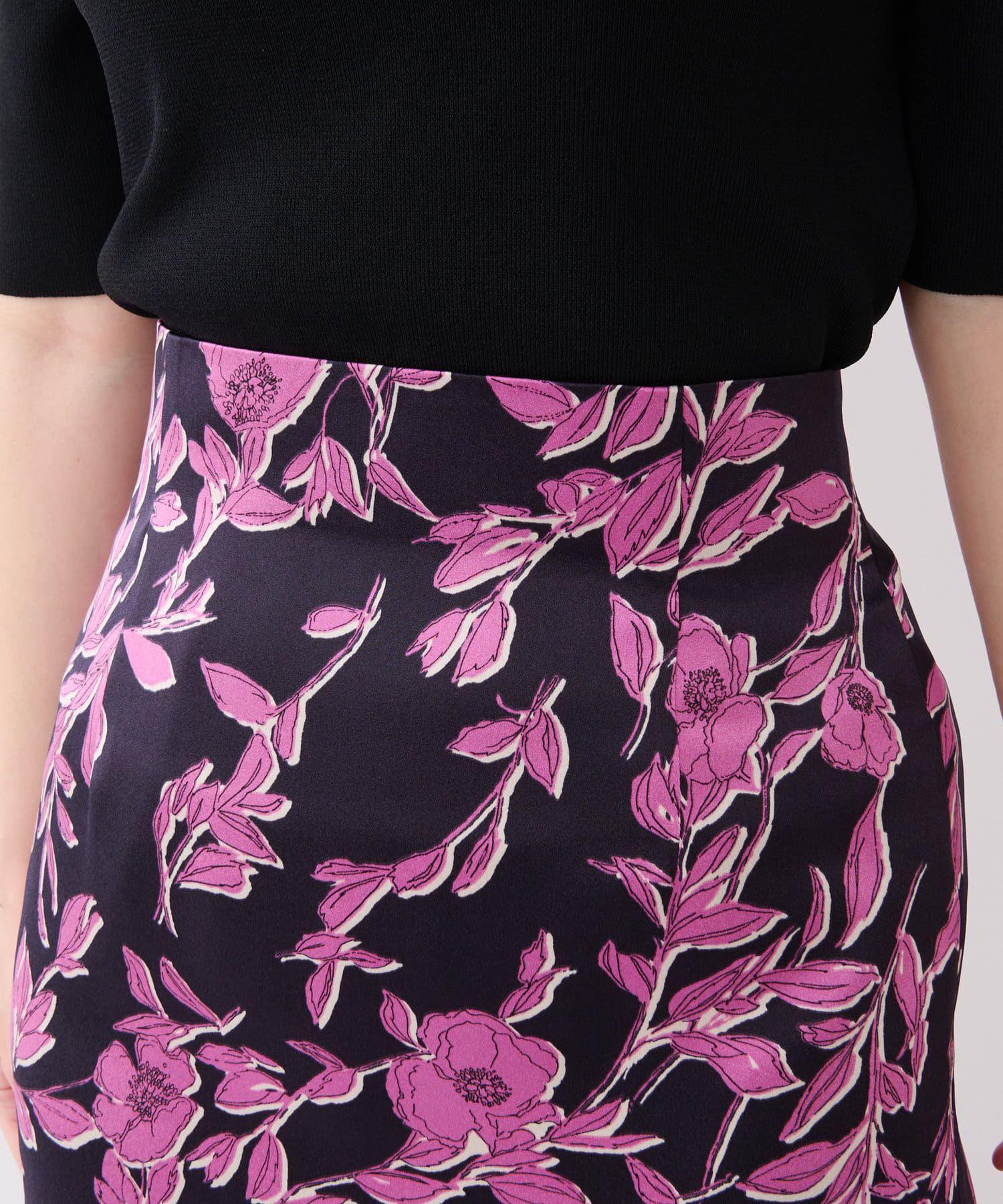 華やかな配色の中花プリントのサテン地を使用しており、同素材のブラウスとのセットアップも可能。