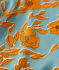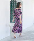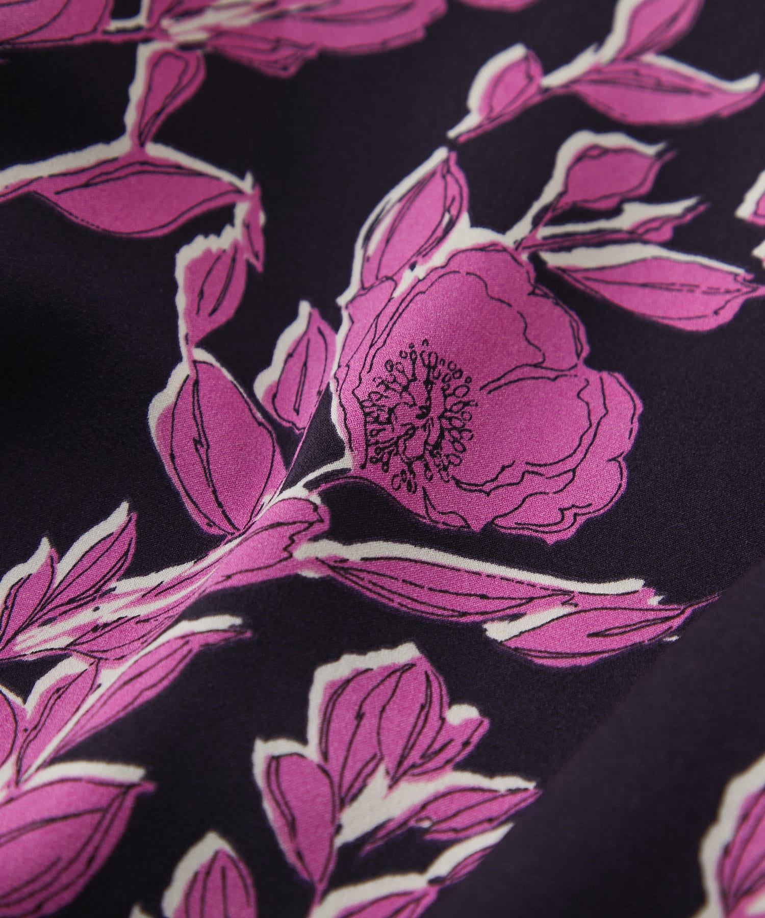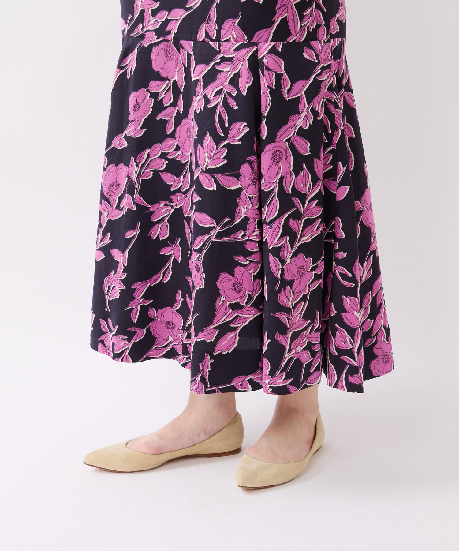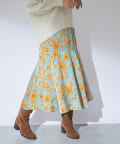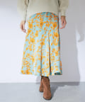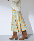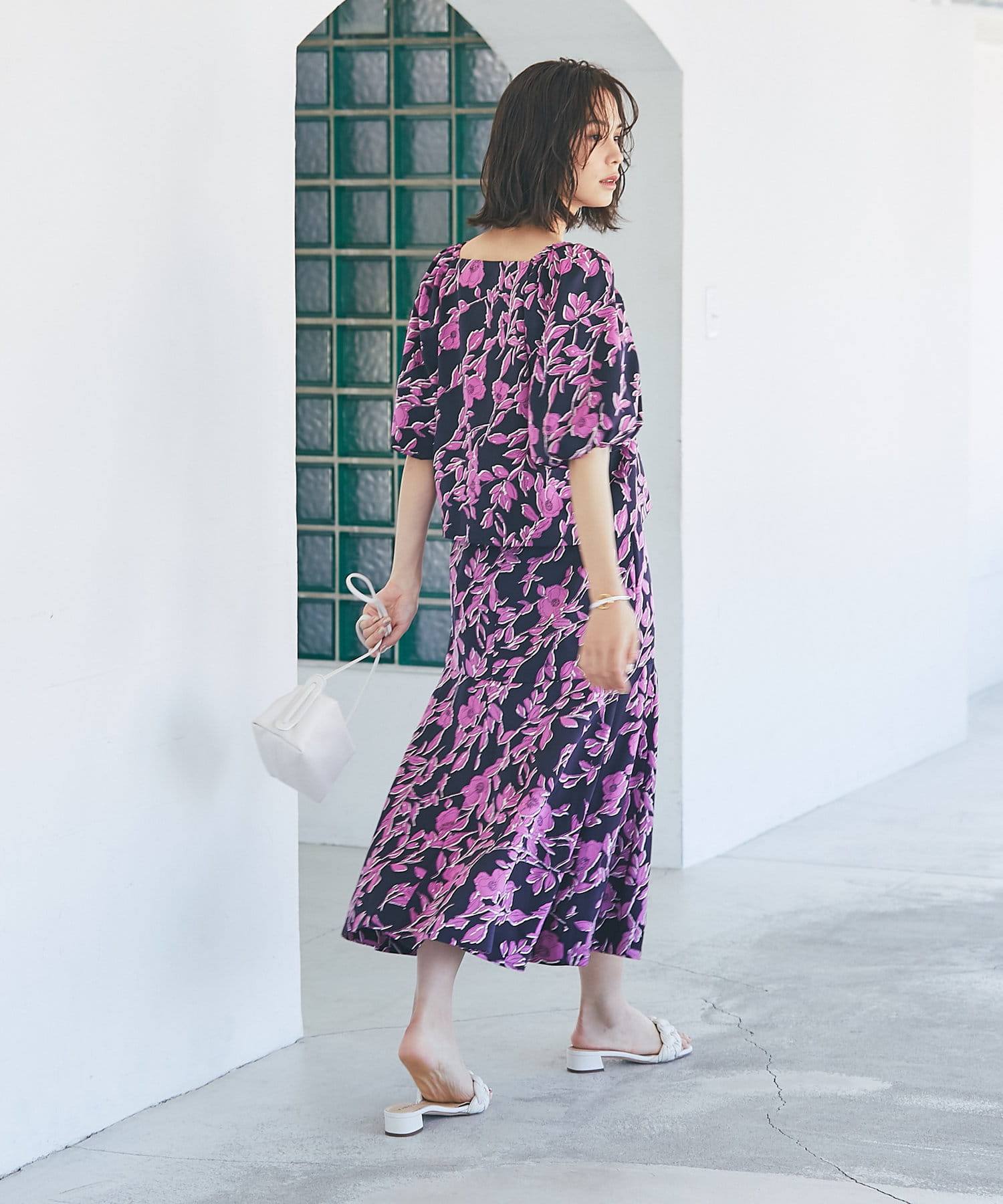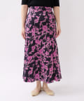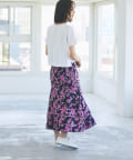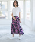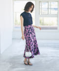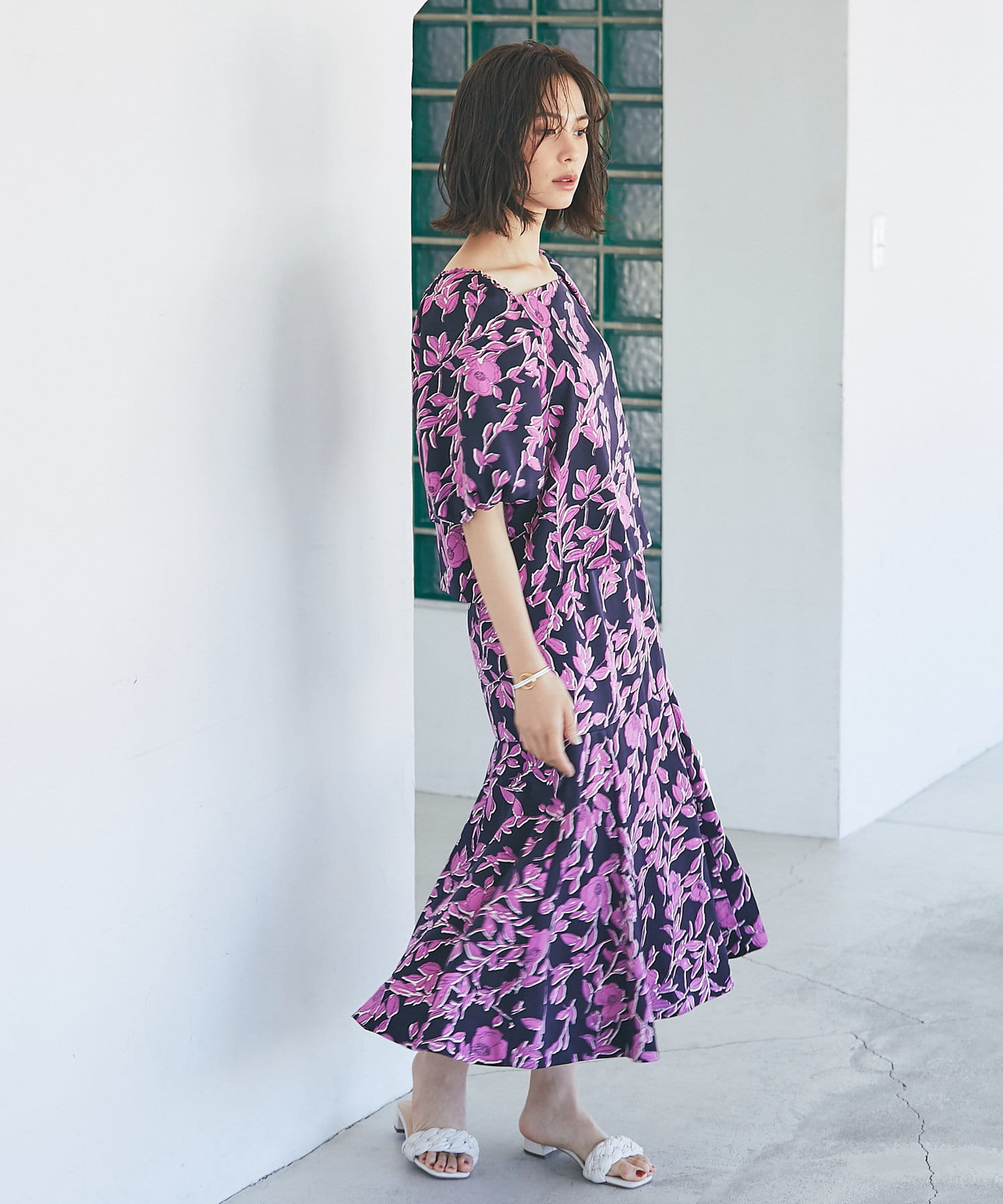 華やかな配色の中花プリントのサテン地を使用しており、同素材のブラウスとのセットアップも可能。