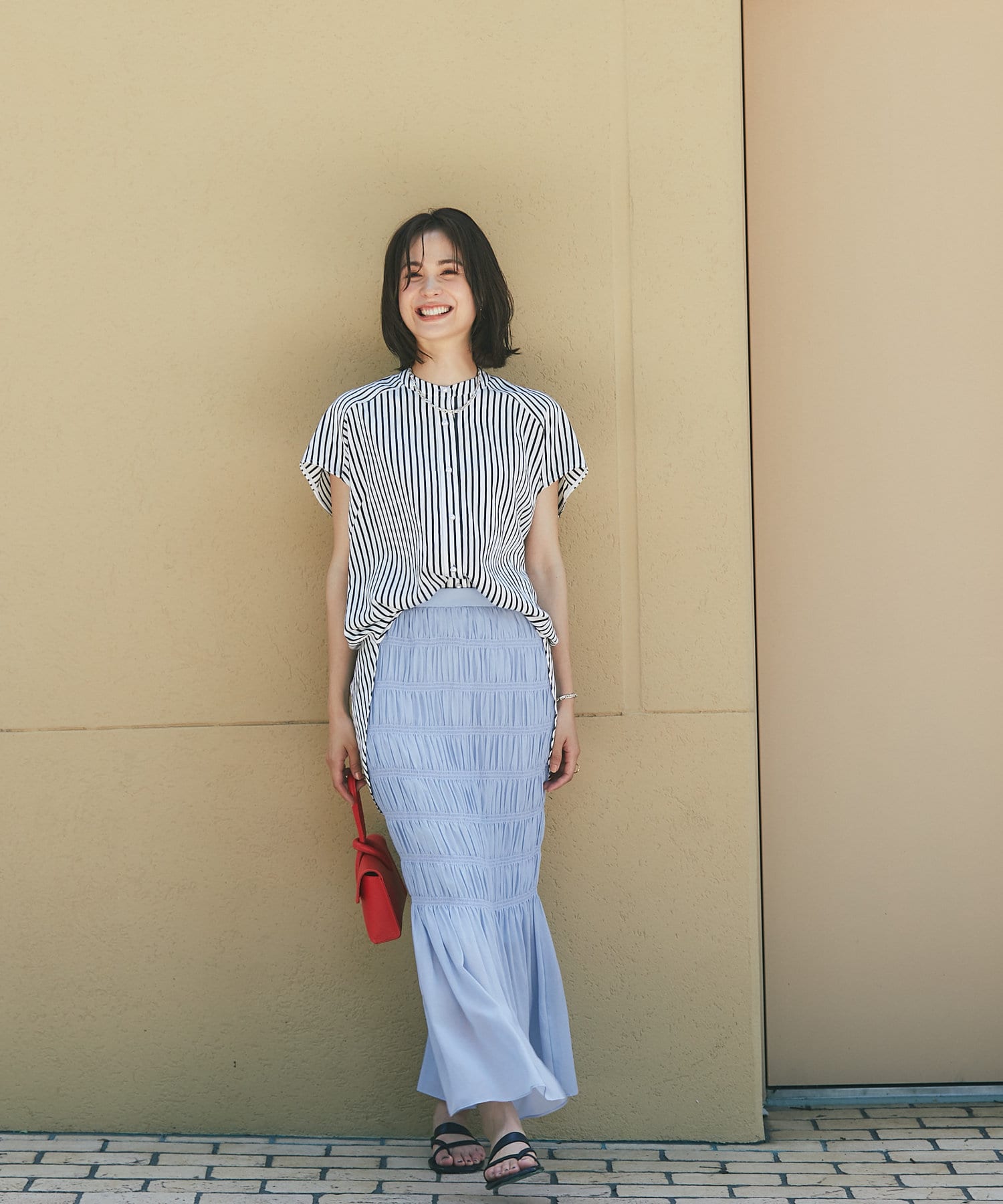 シャーリングのデザインがポイントのマーメイドスカートは細見えする上に履き心地も楽ちんです。