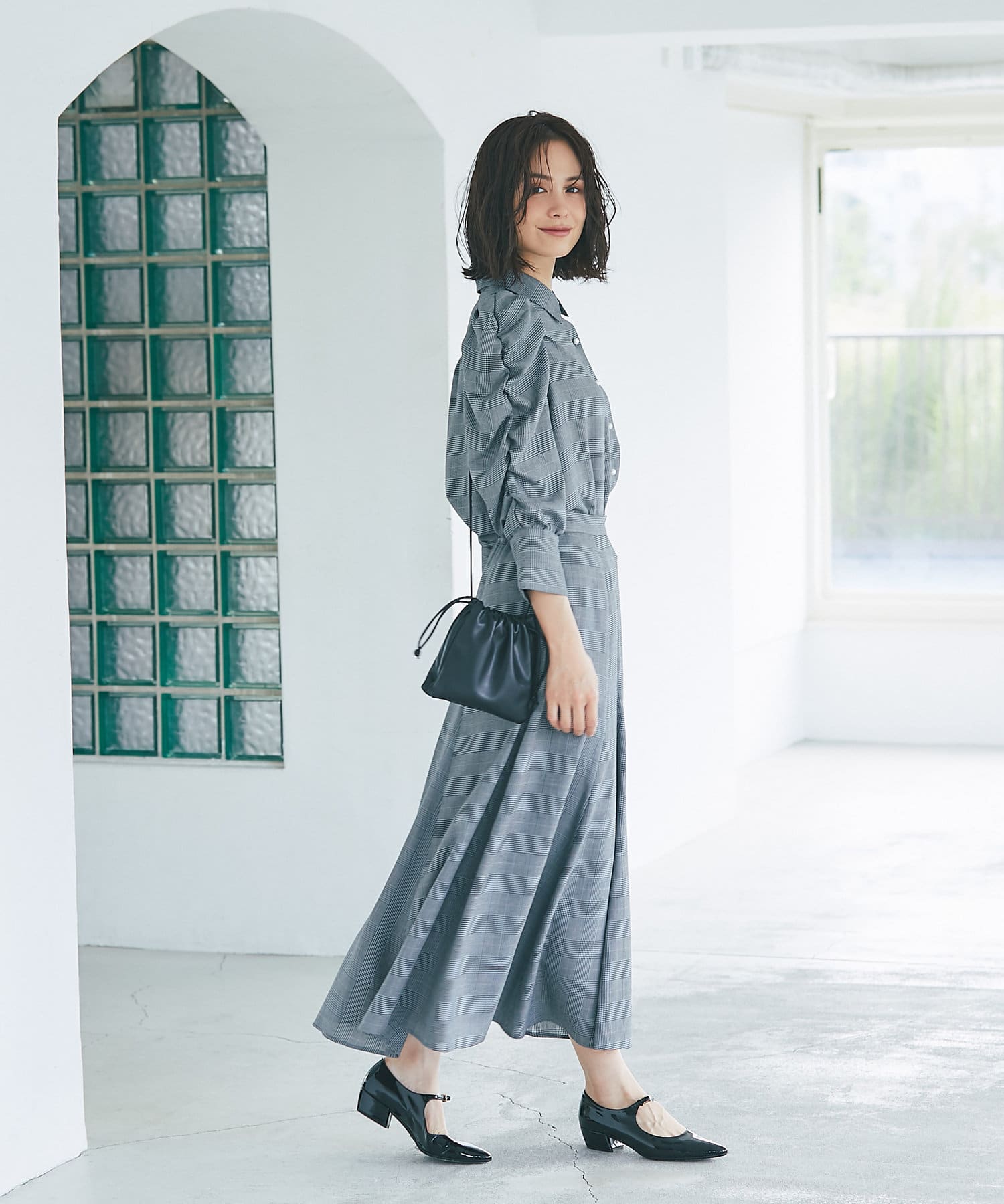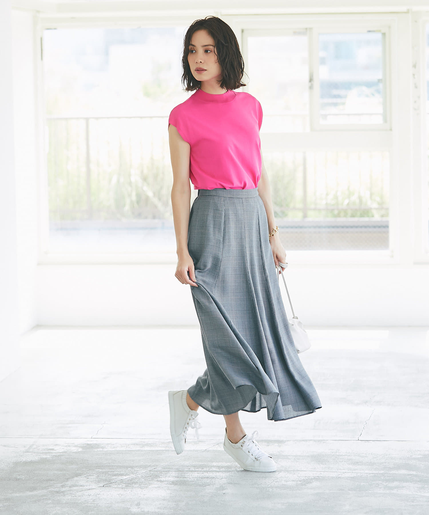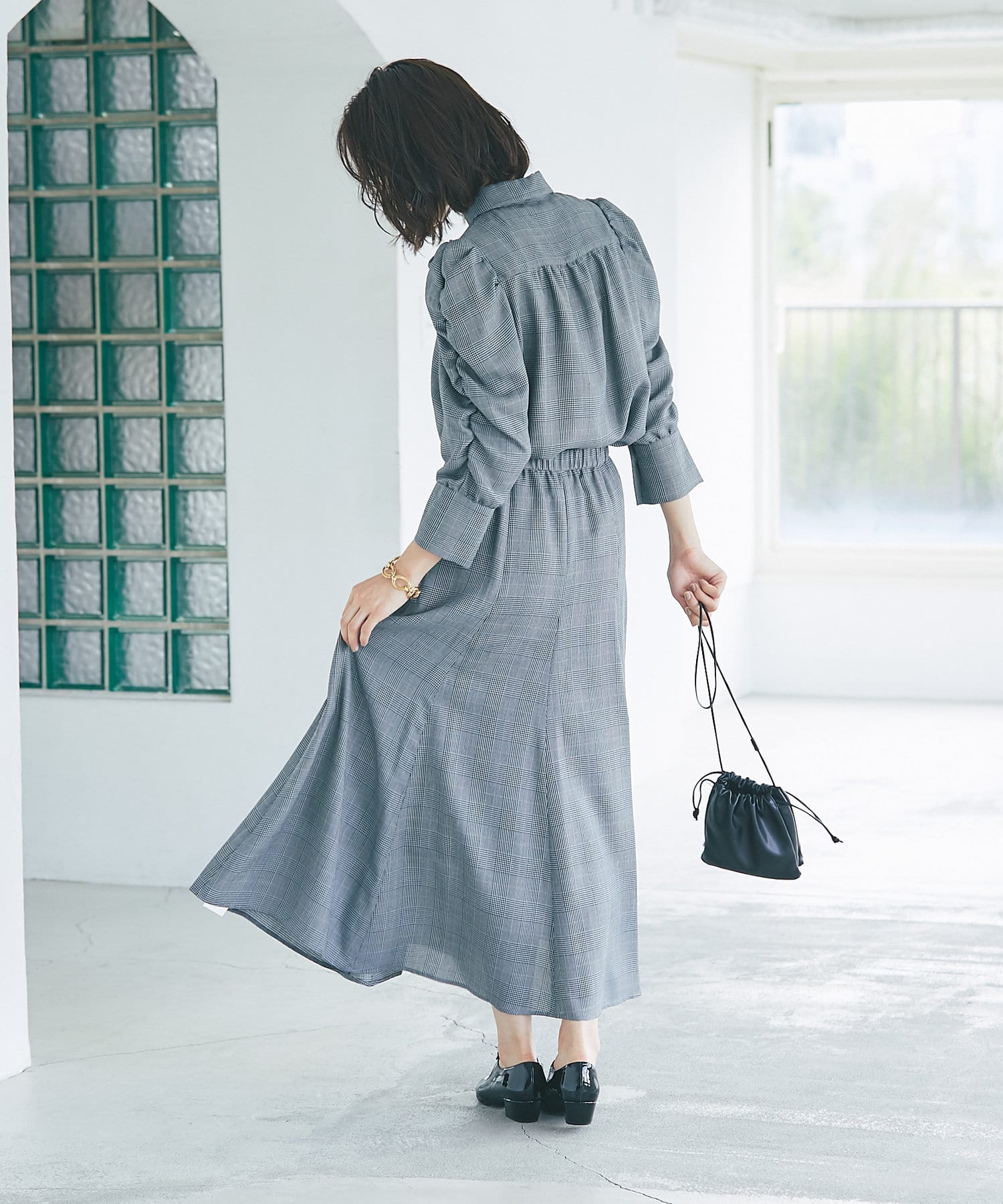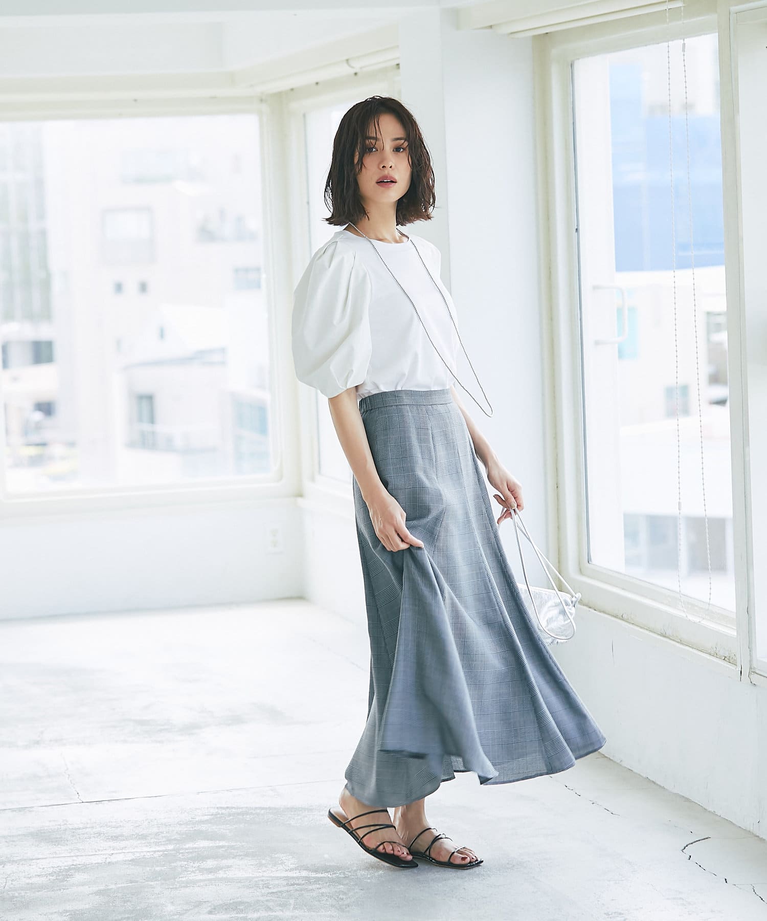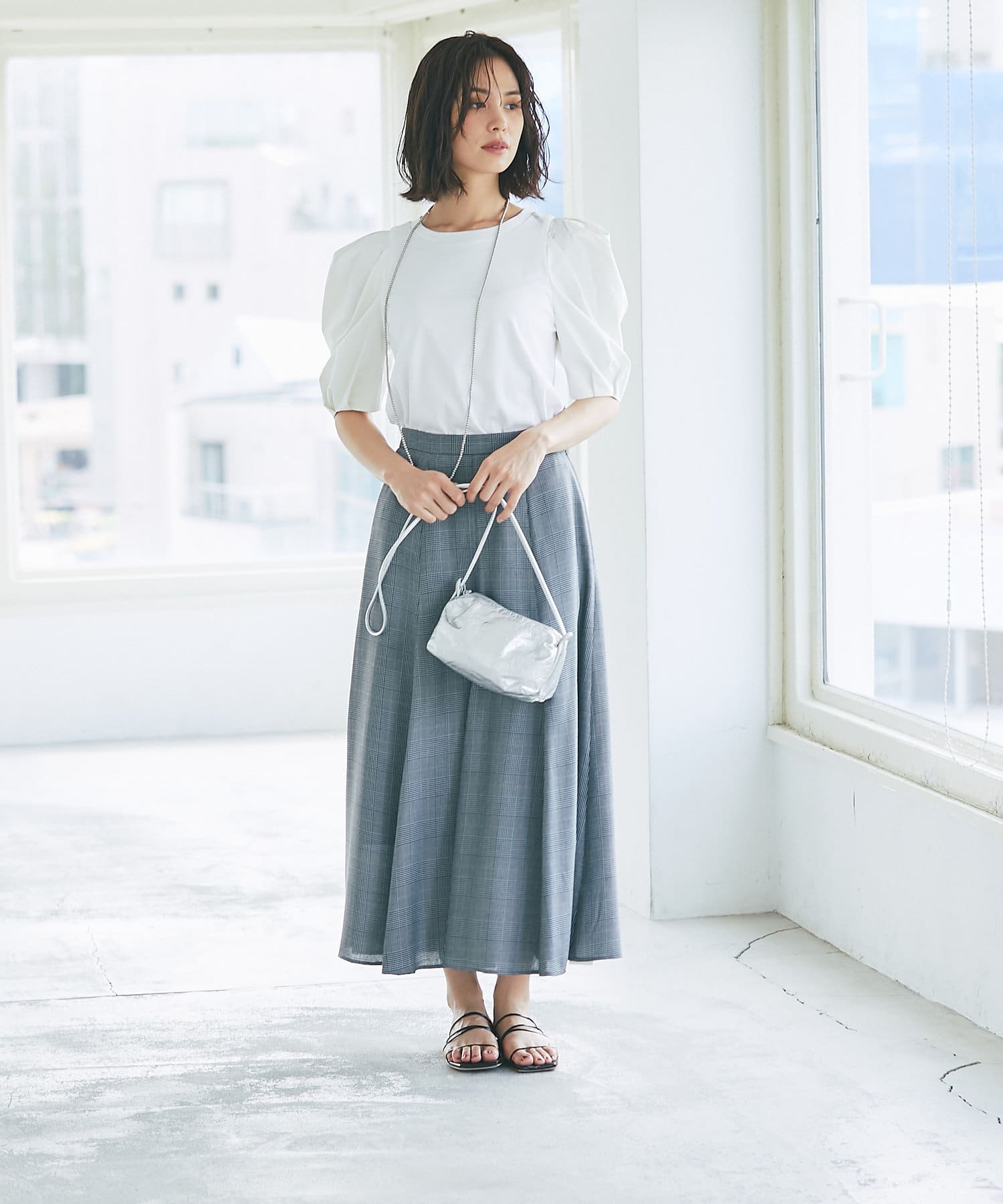 グレンチェックでより上品な印象に仕上げたマーメイドスカート。