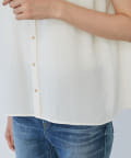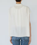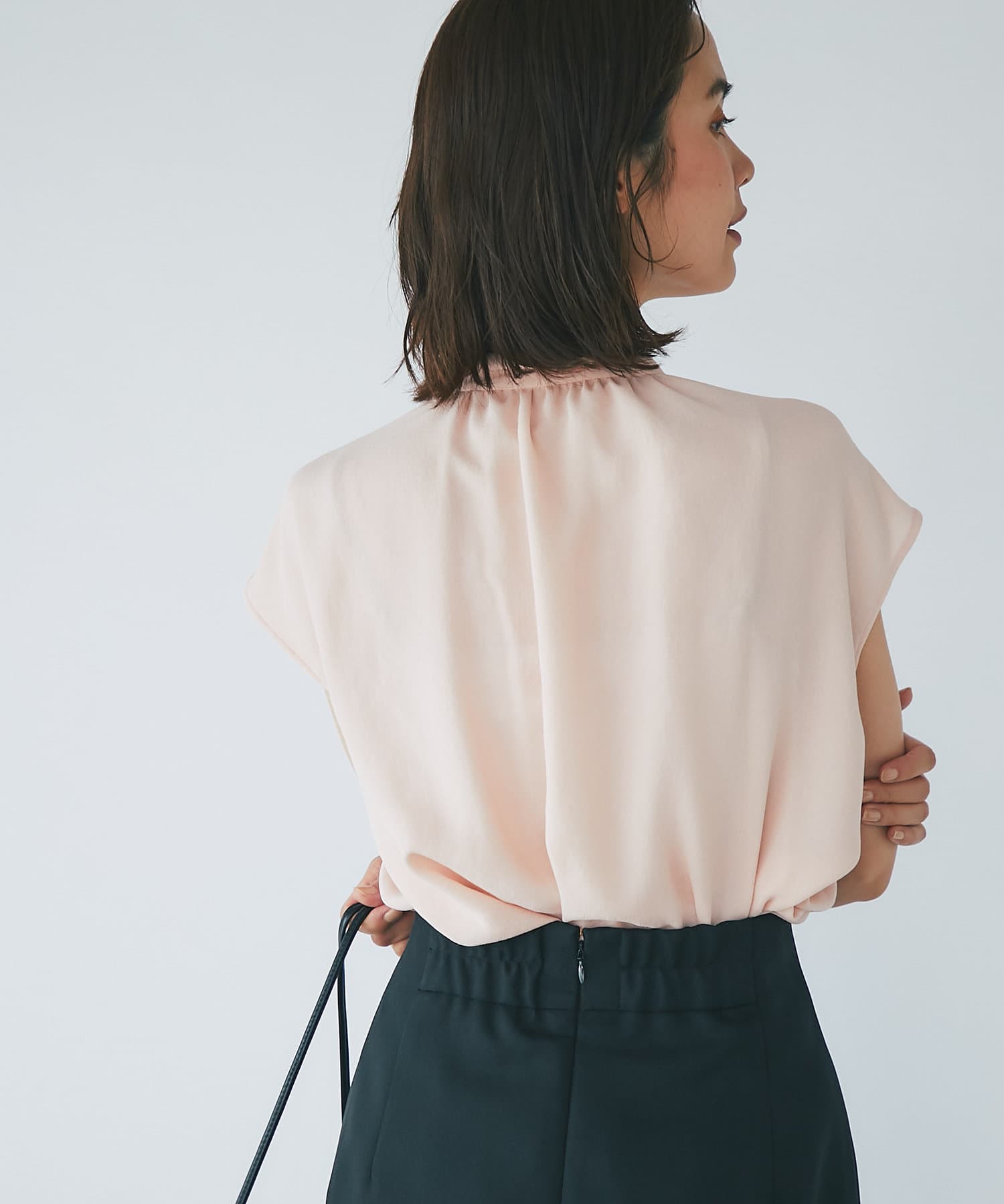 配色のメローと小さなゴールド釦がデザインポイントになったボウタイブラウス。