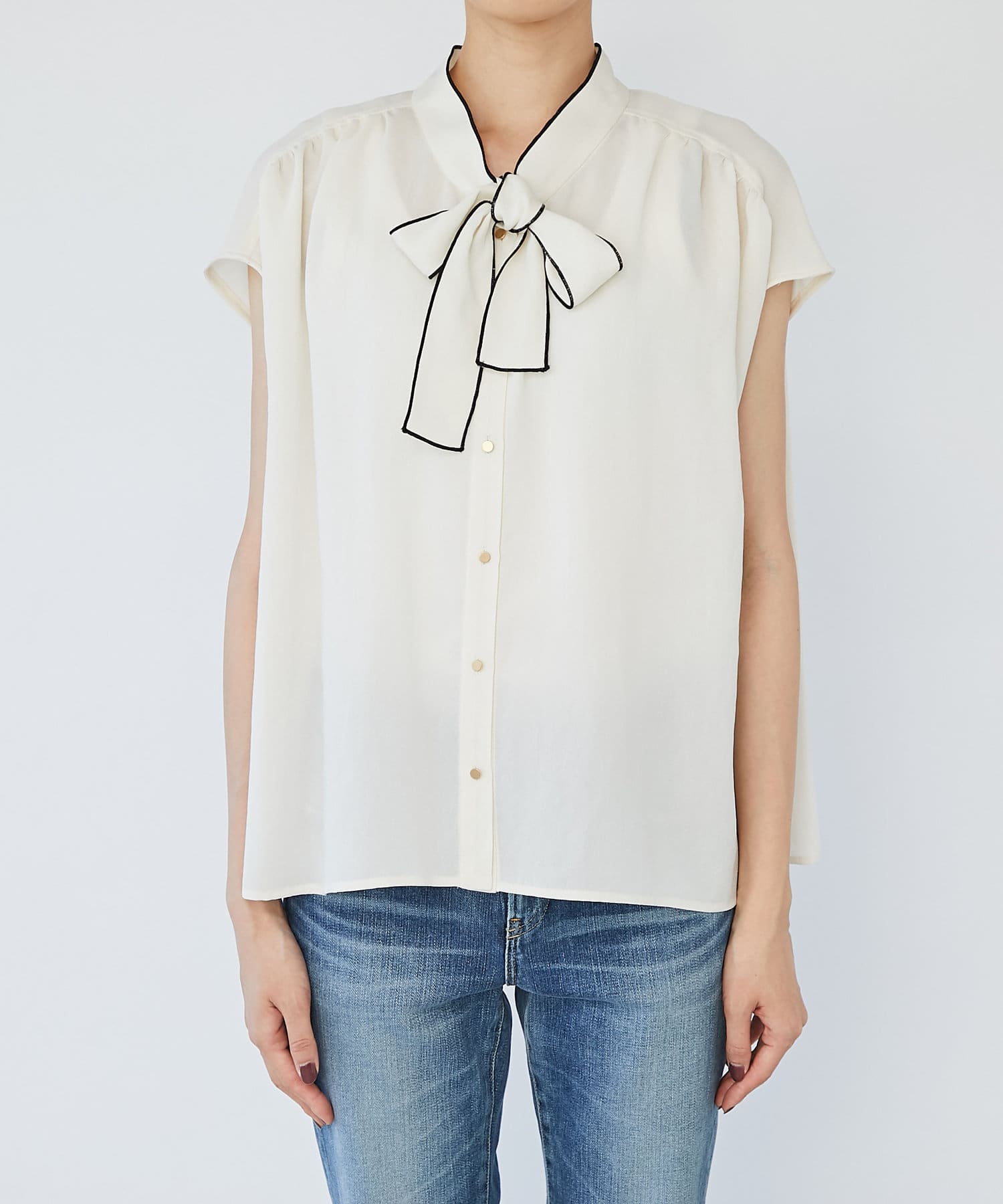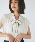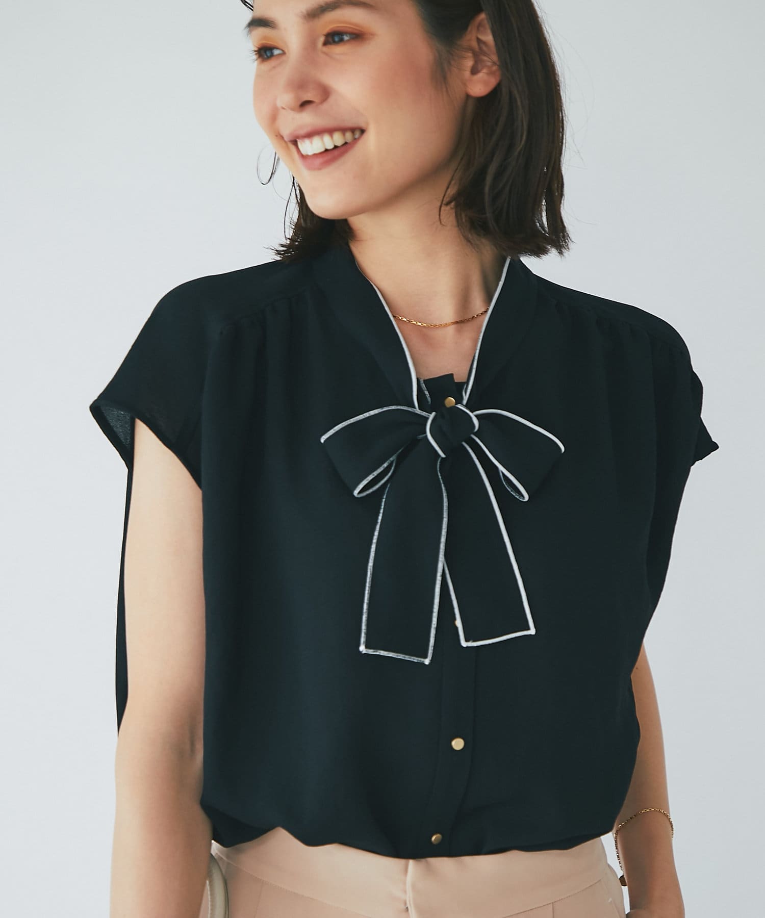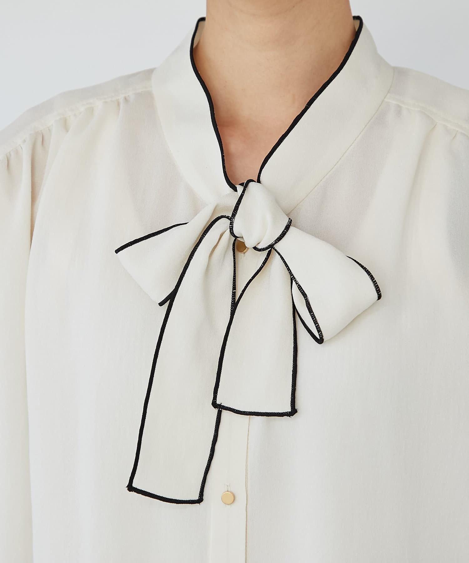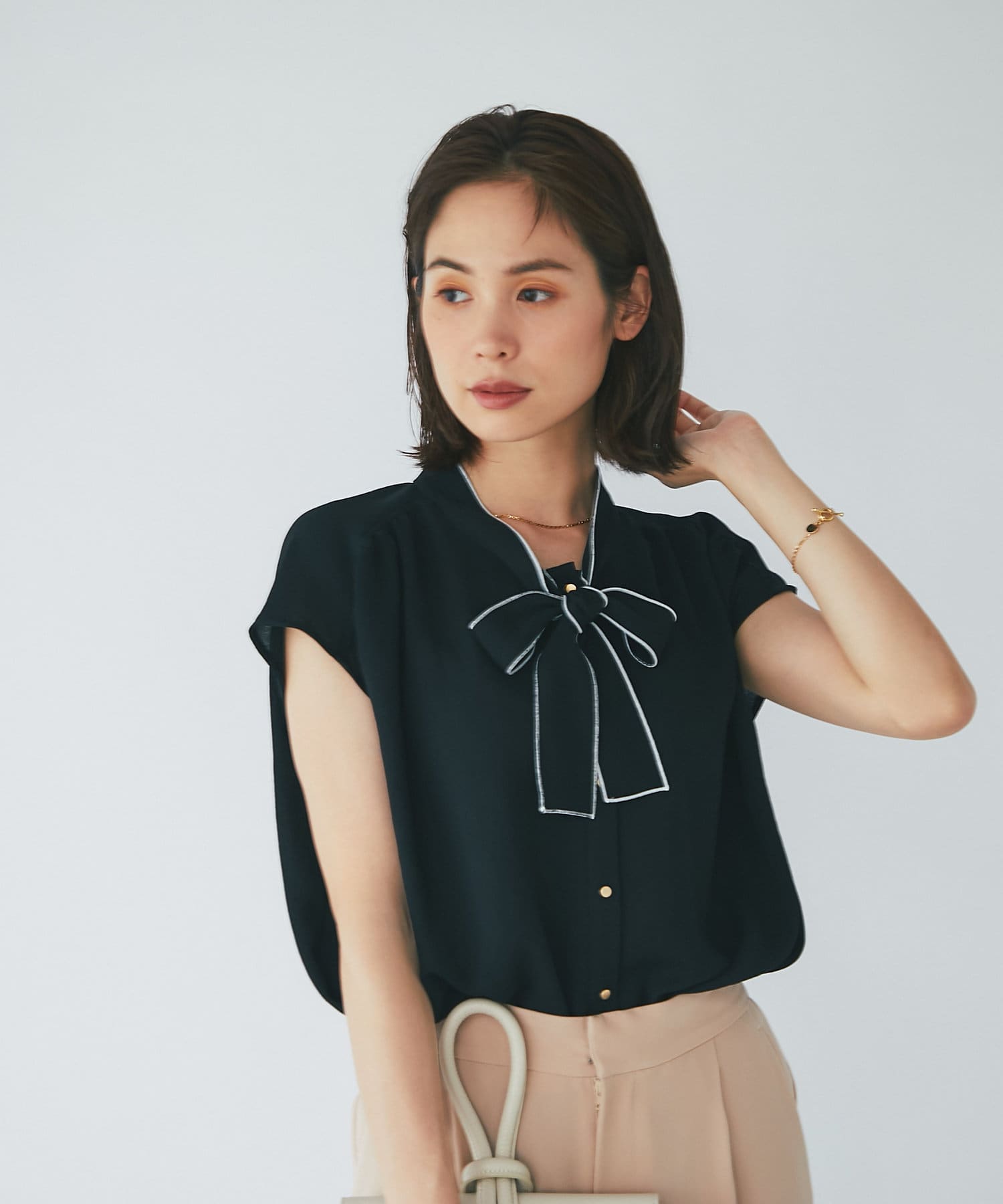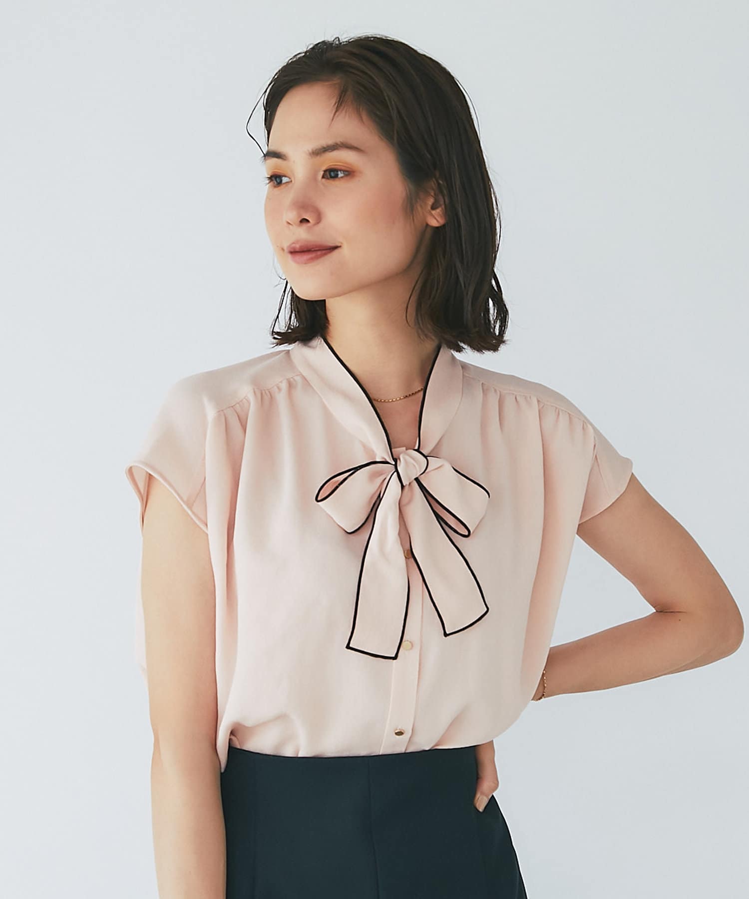 パイピングデザインにボウタイがおしゃれなフレンチブラウス。