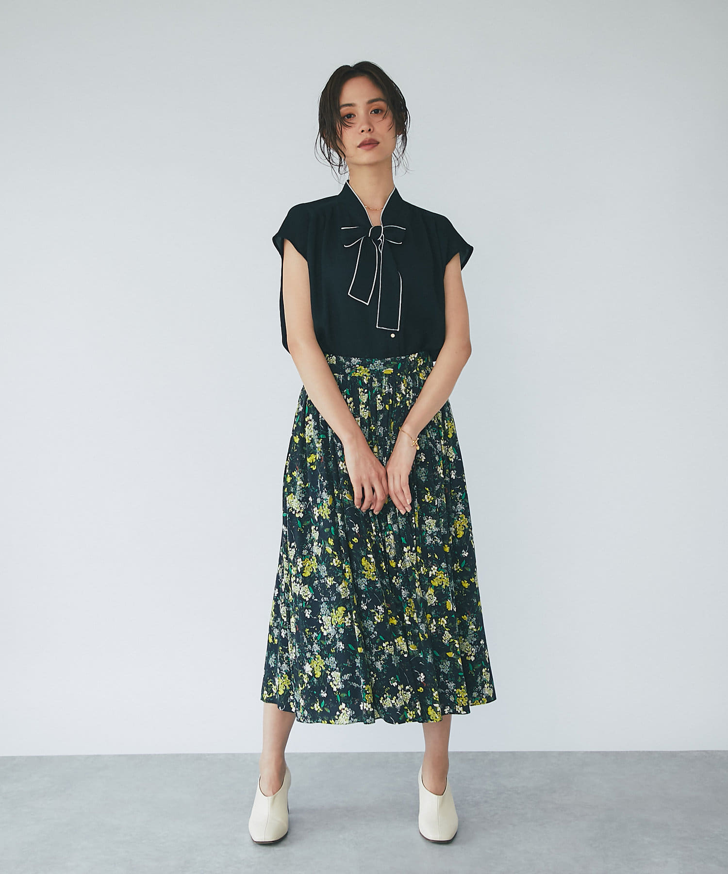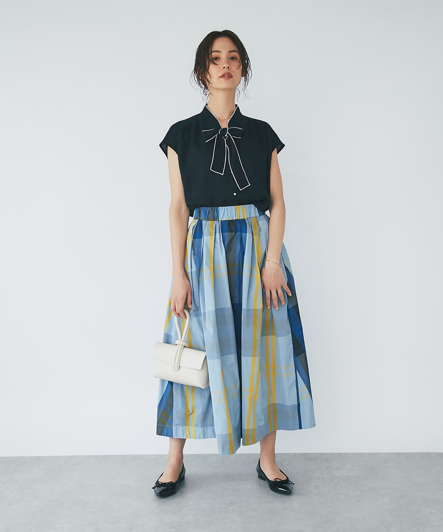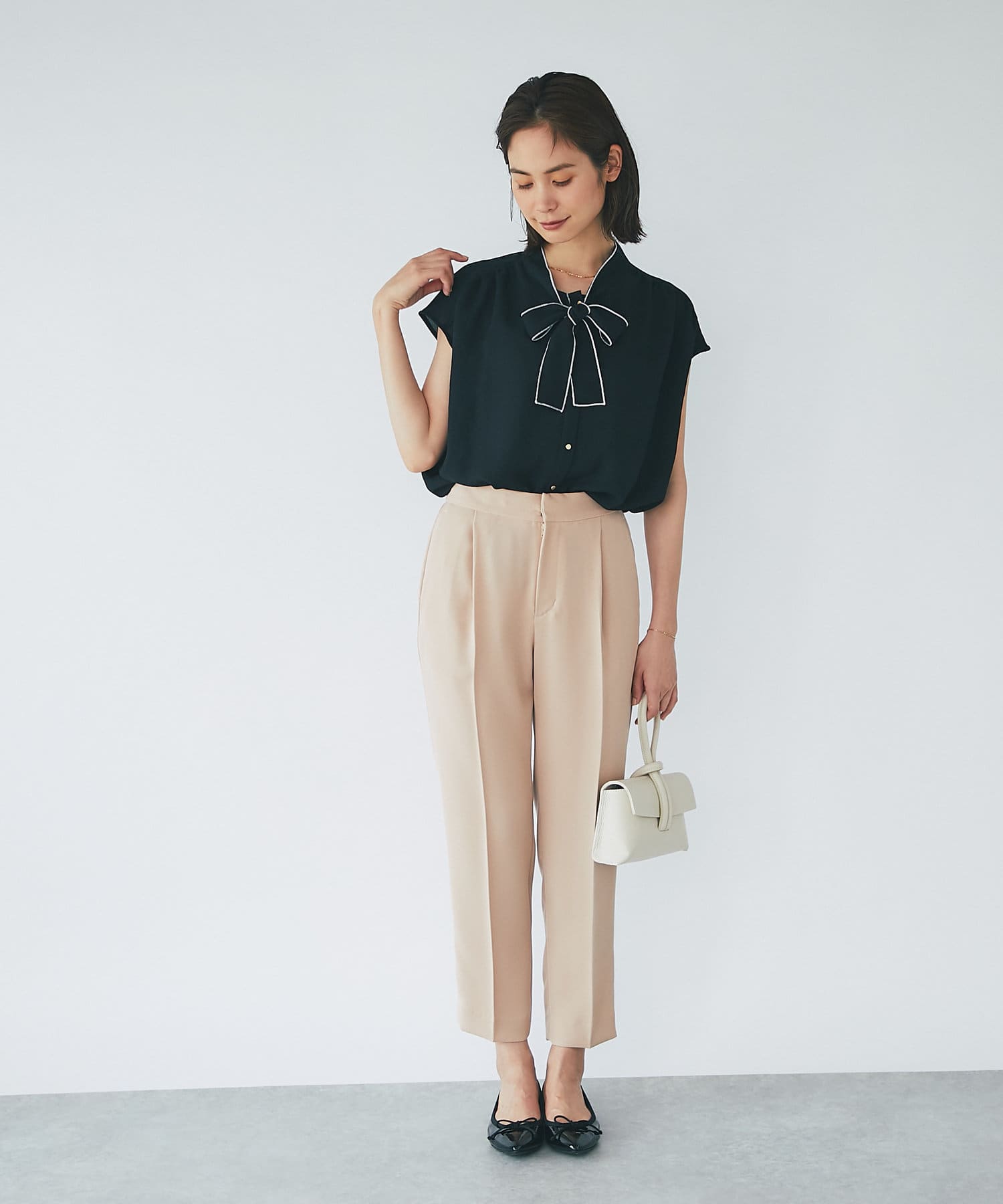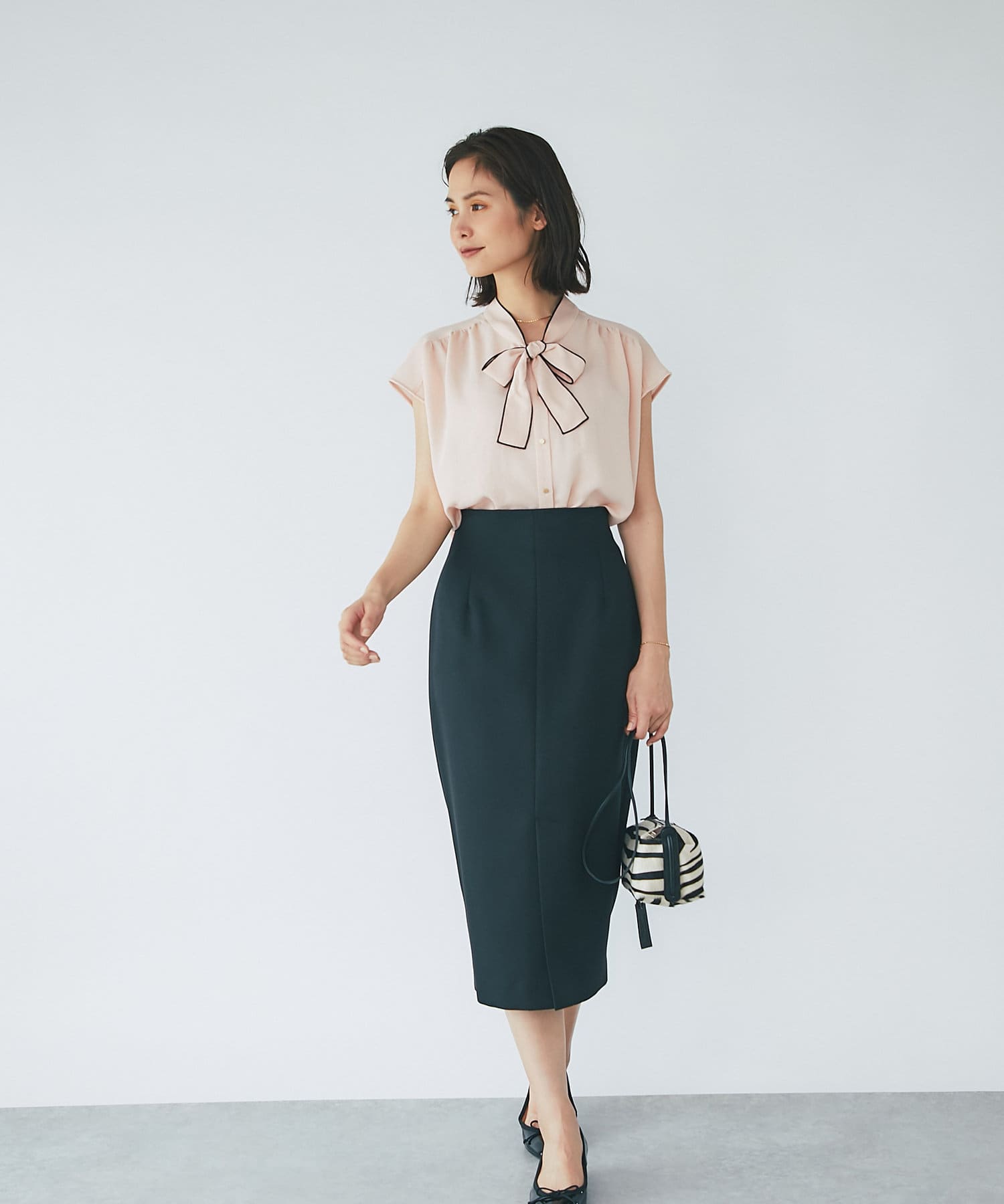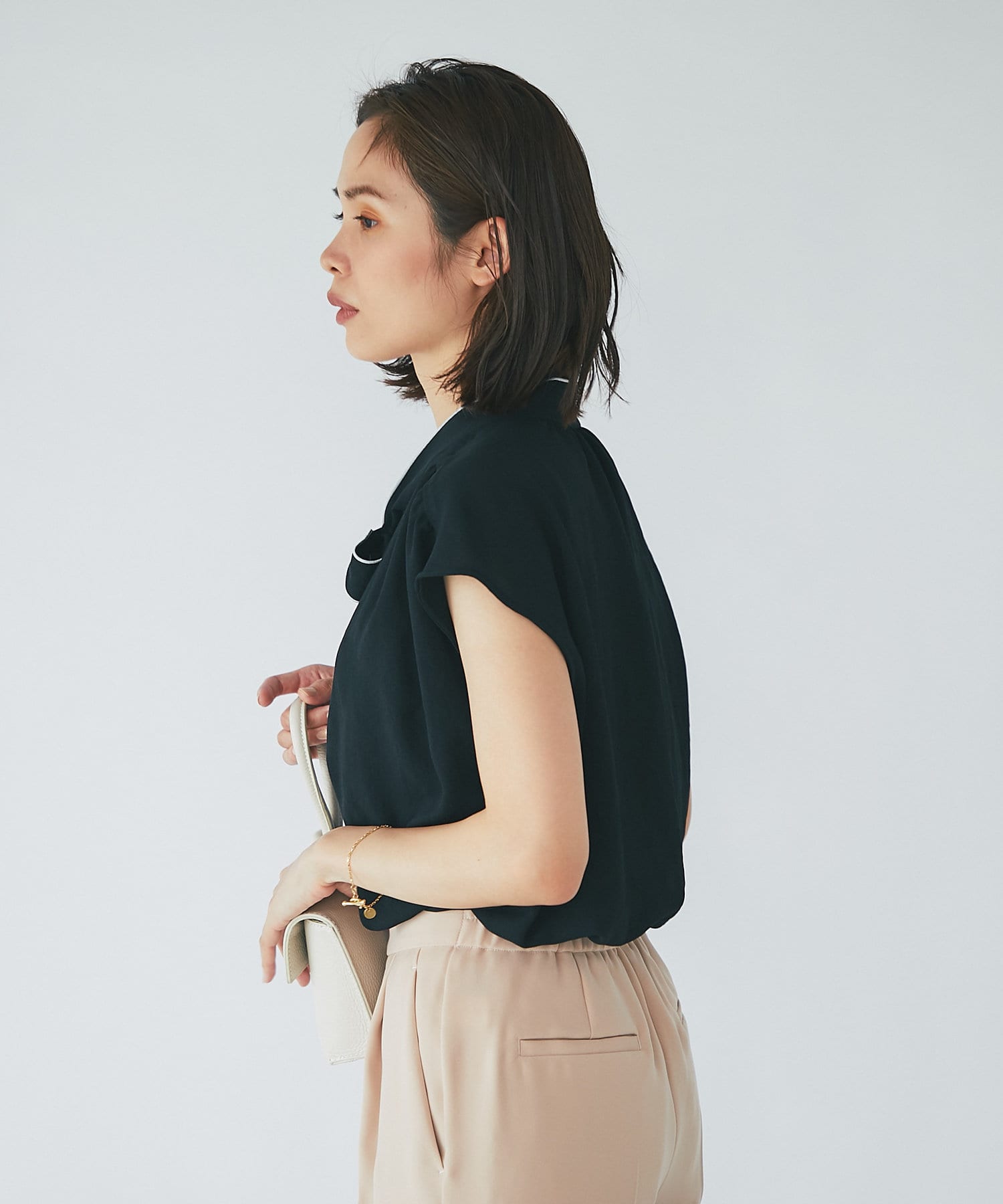 バイカラーでメリハリが出るボウタイブラウスはとろんとした柔らかな質感が女らしい一枚。