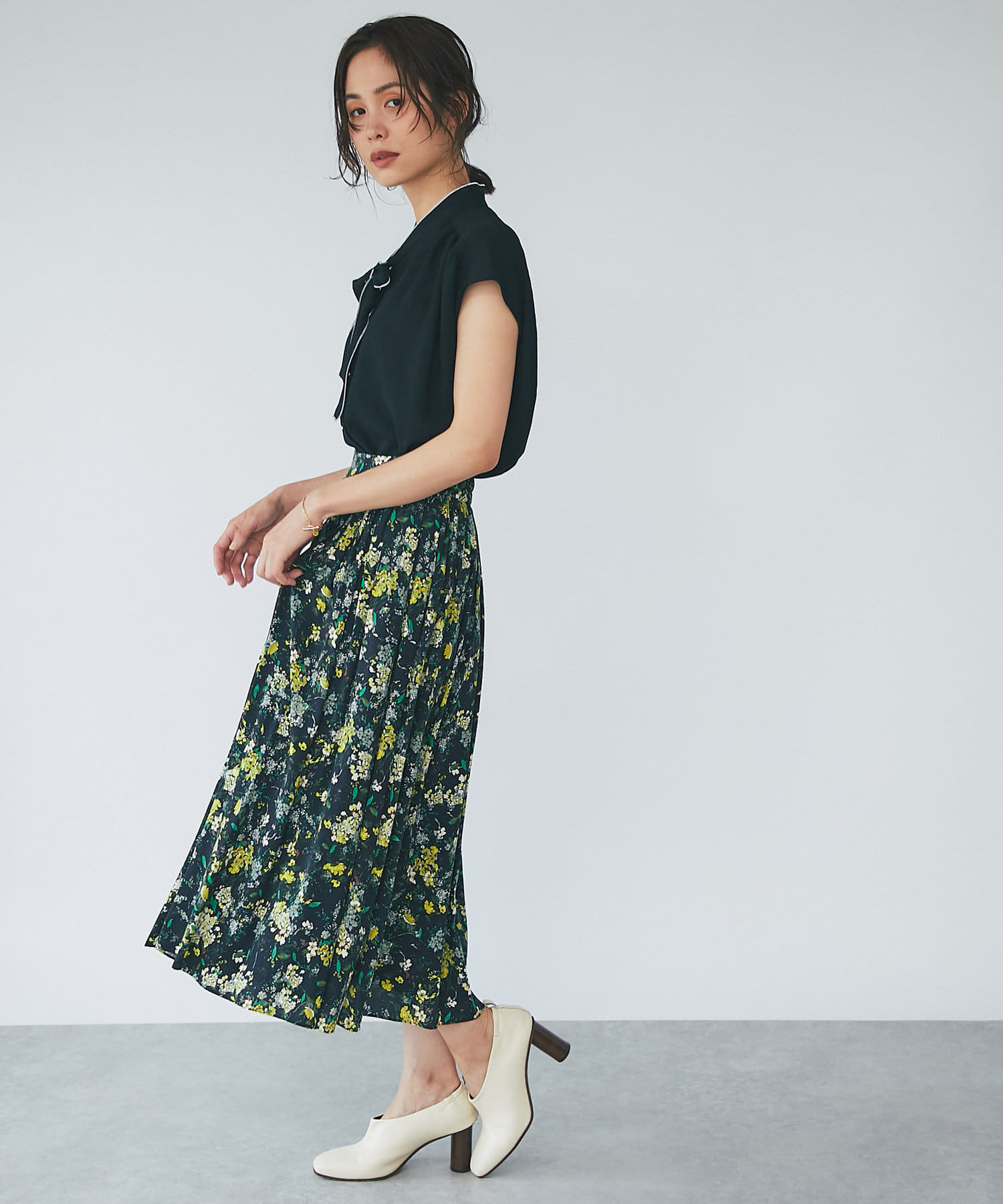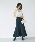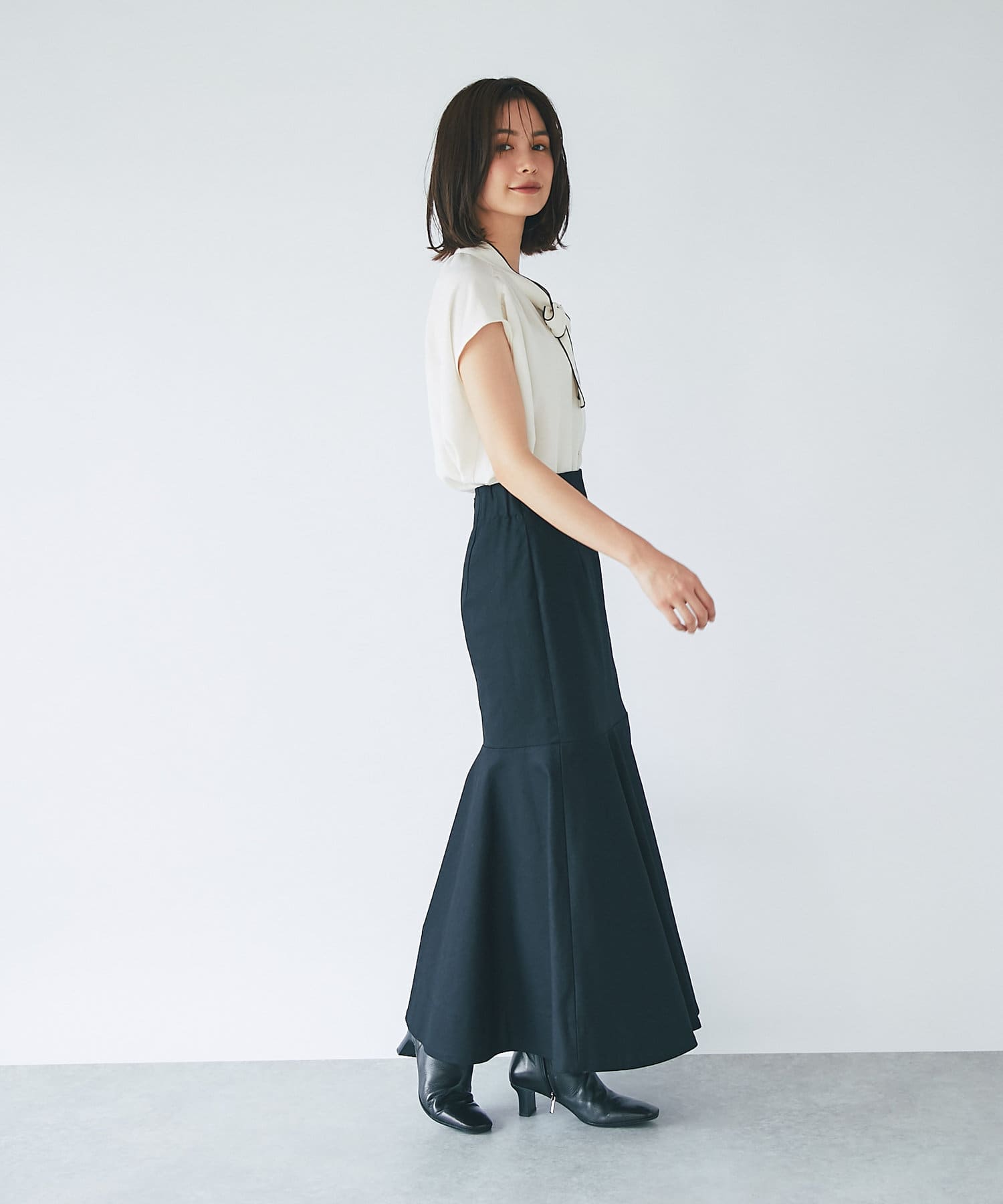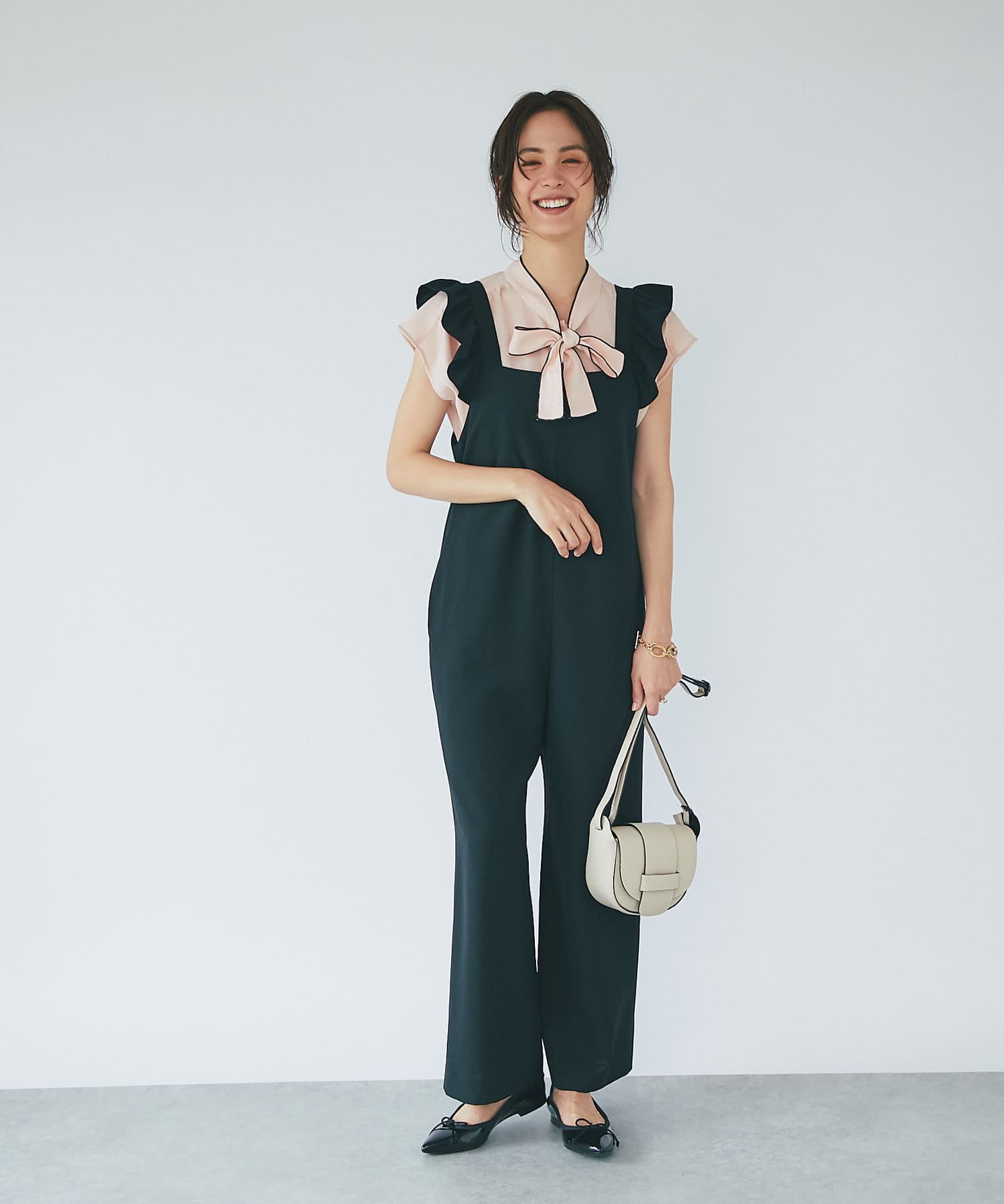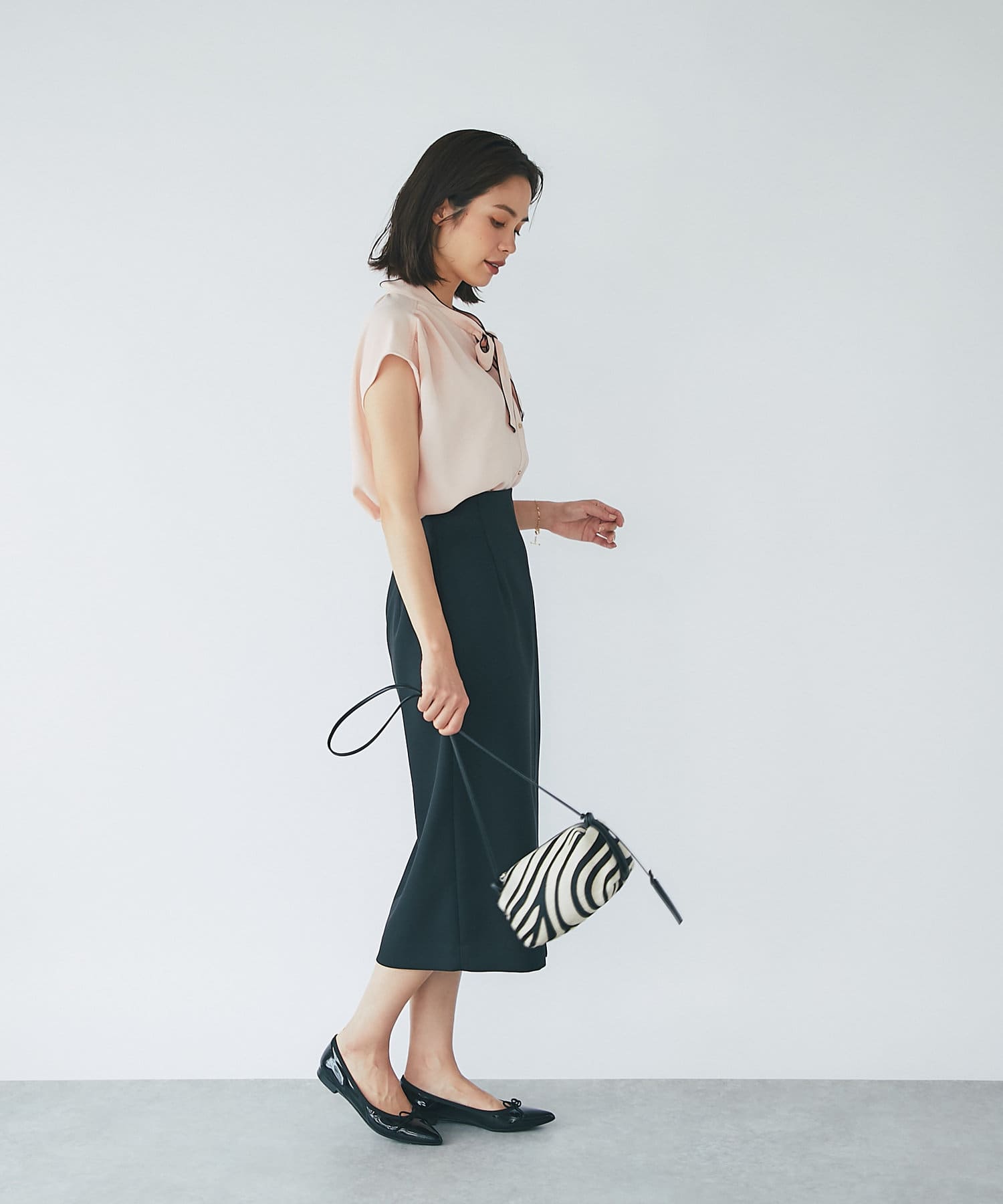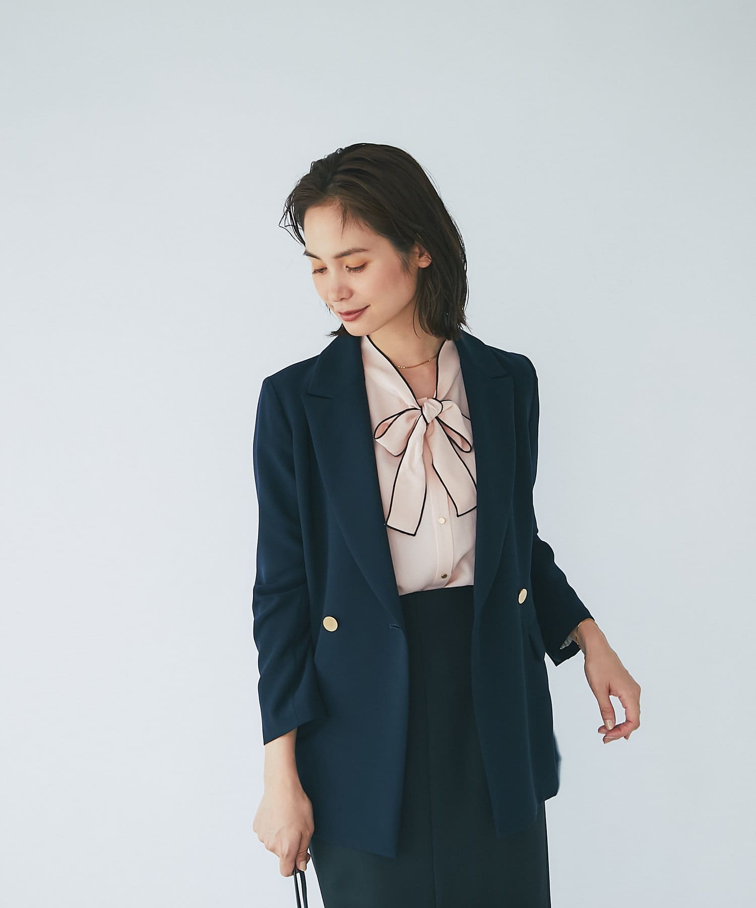 バイカラーでメリハリが出るボウタイブラウスはとろんとした柔らかな質感が女らしい一枚。