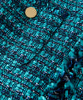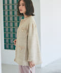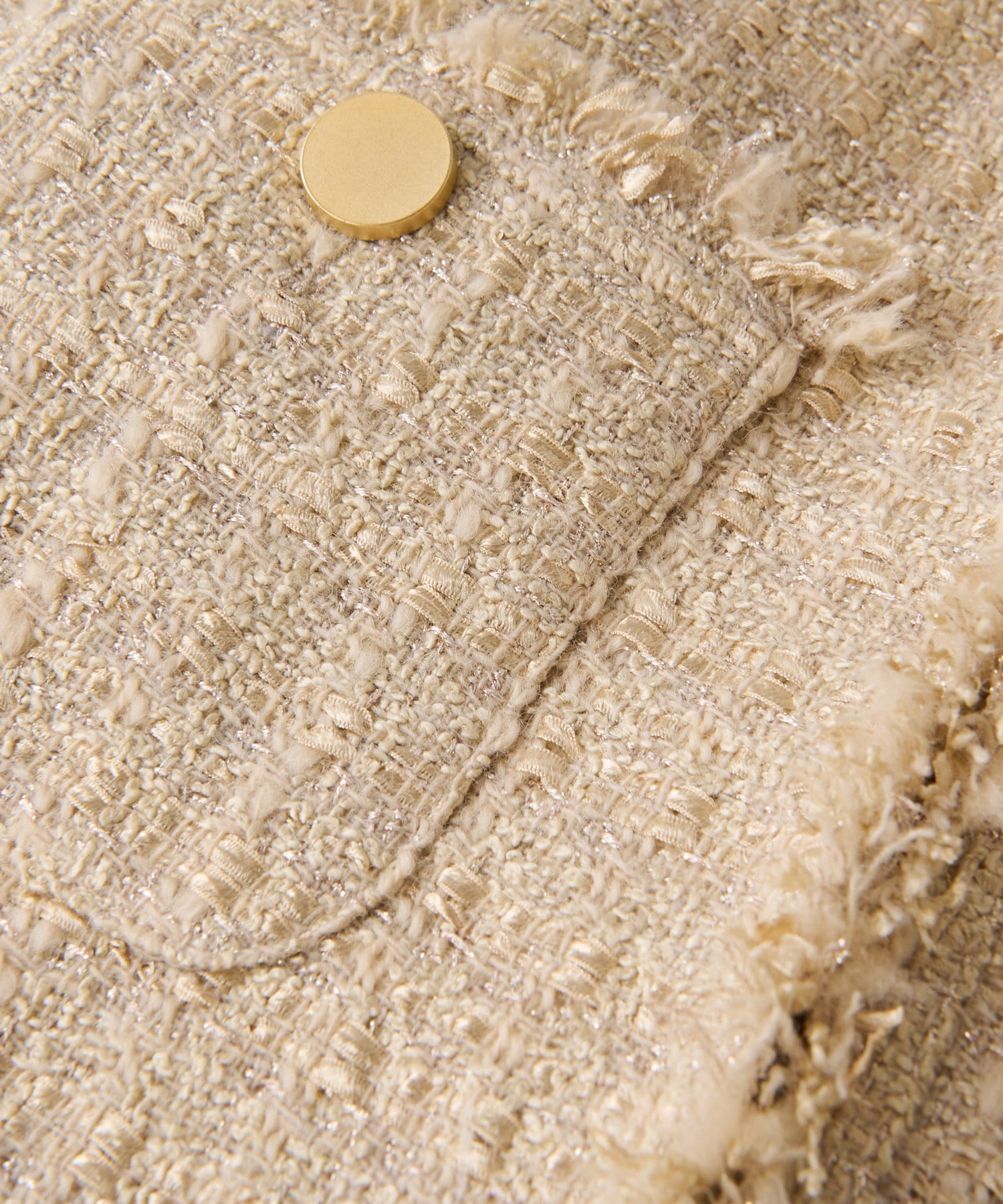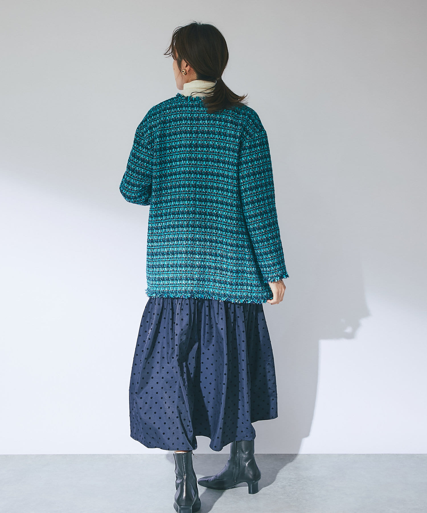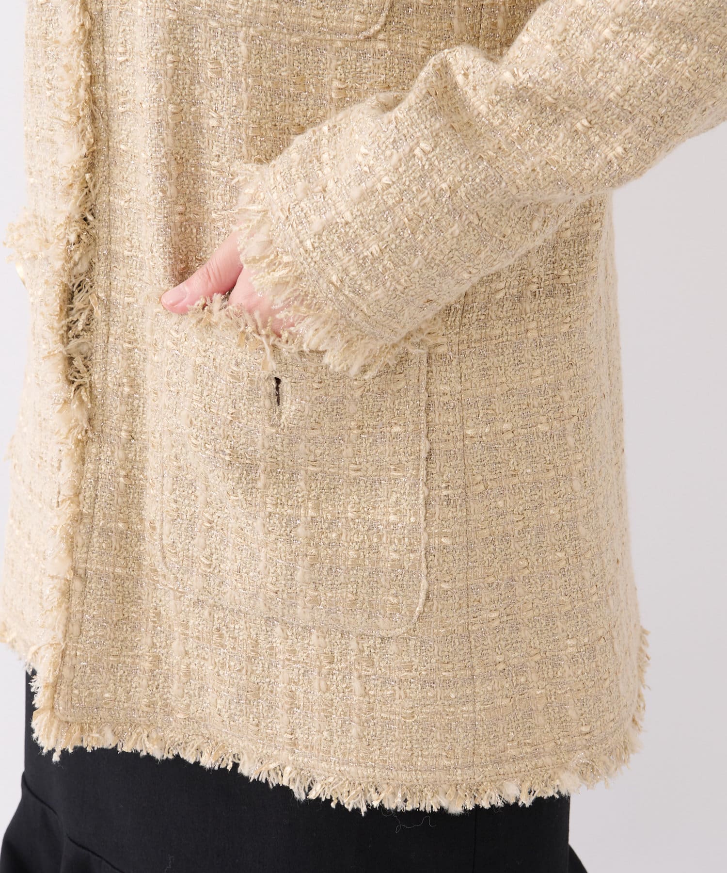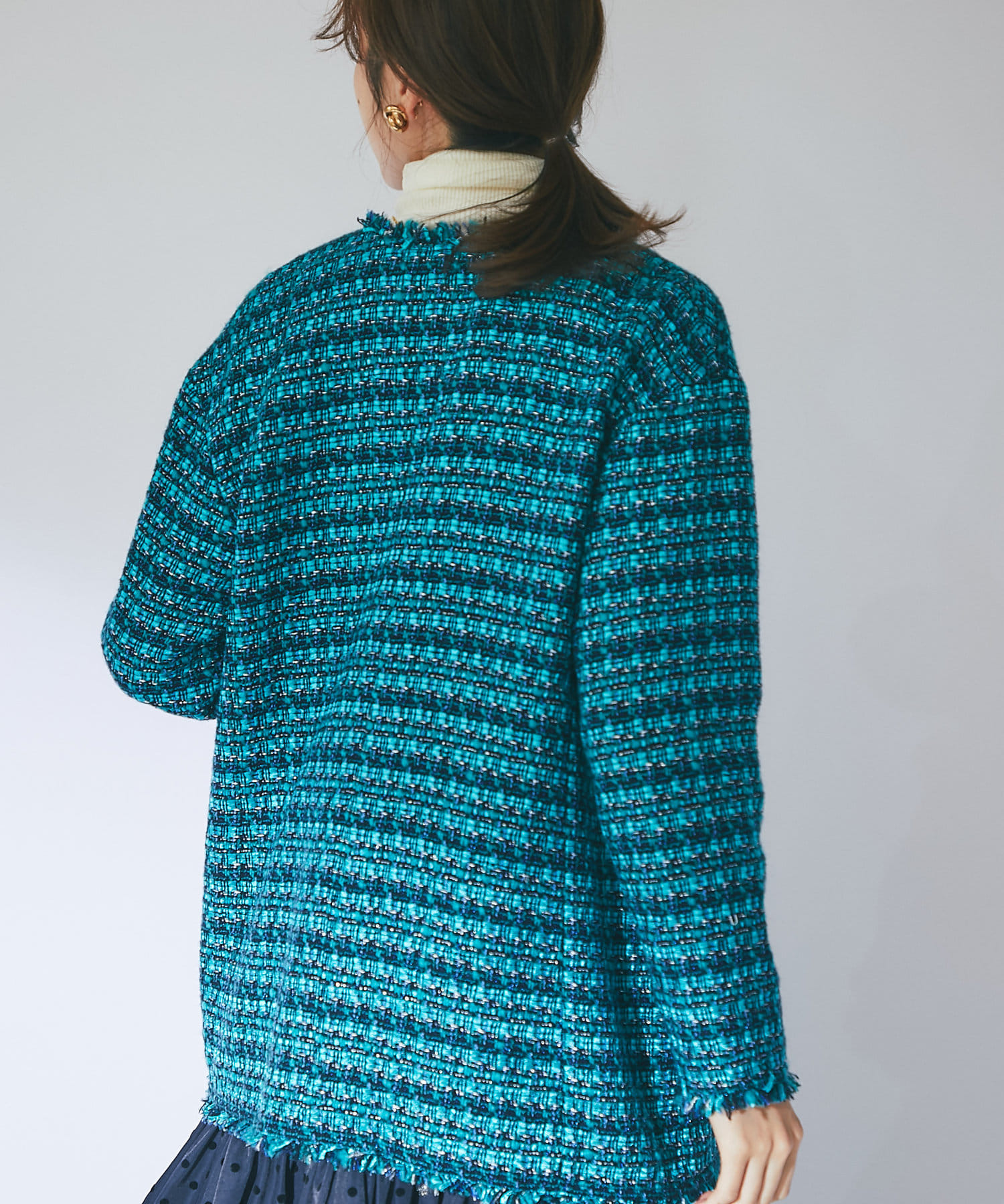 テープヤーンなど様々な意匠糸を使用して織り上げたツイードを使用しているので豪華な見た目ながら、軽い着心地で気負わずラフに着られる一枚です。