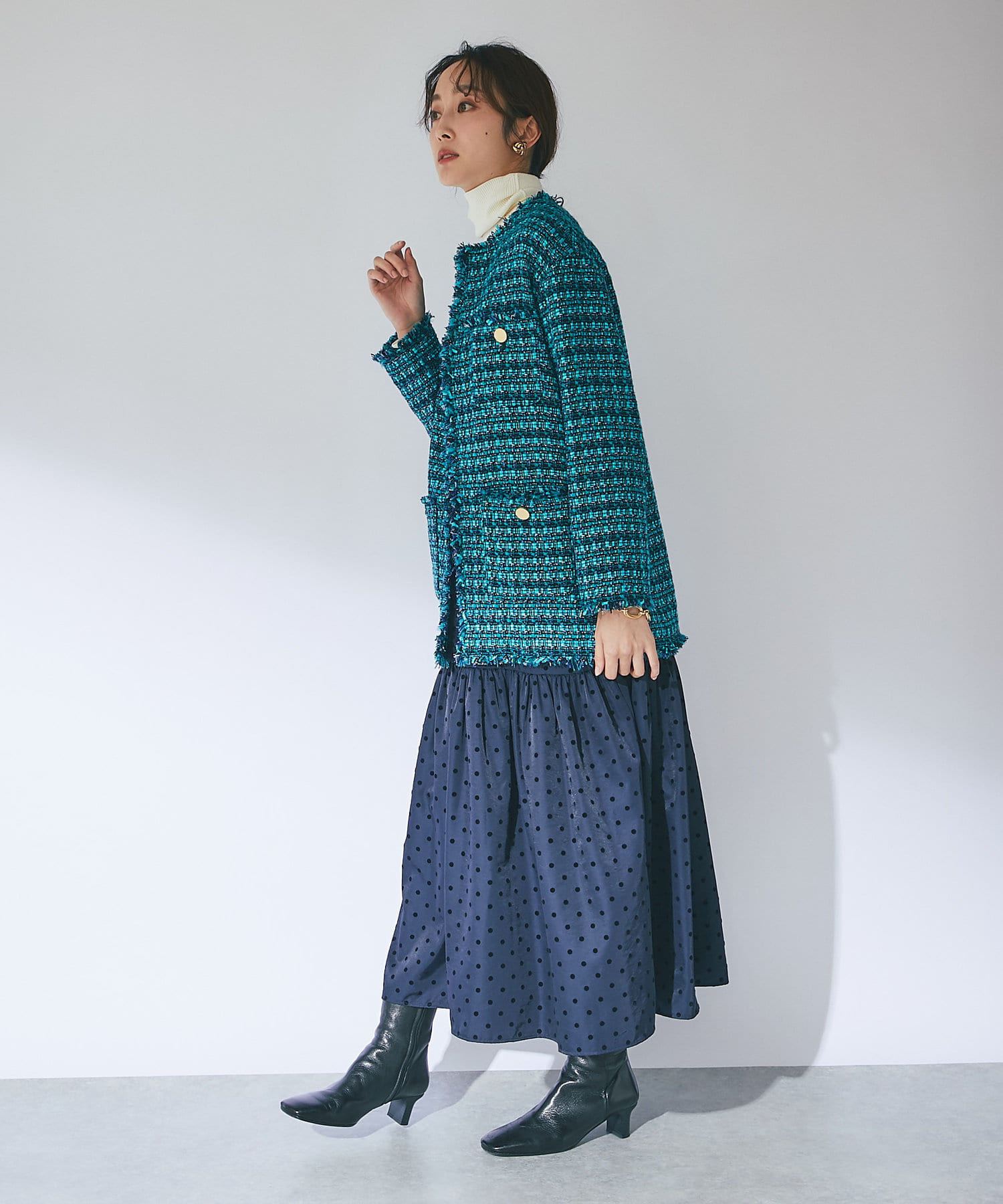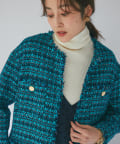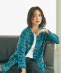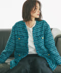 目を惹くグリーンと柔らかな印象のベージュが女性らしさを引き立てる、トレンドのツイードジャケット。