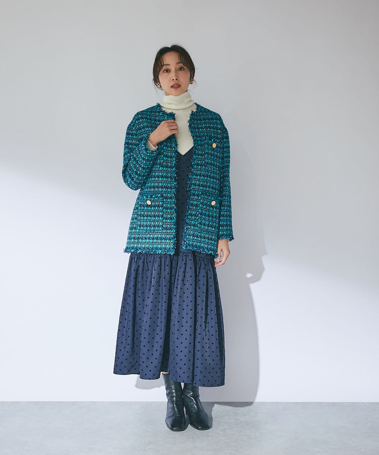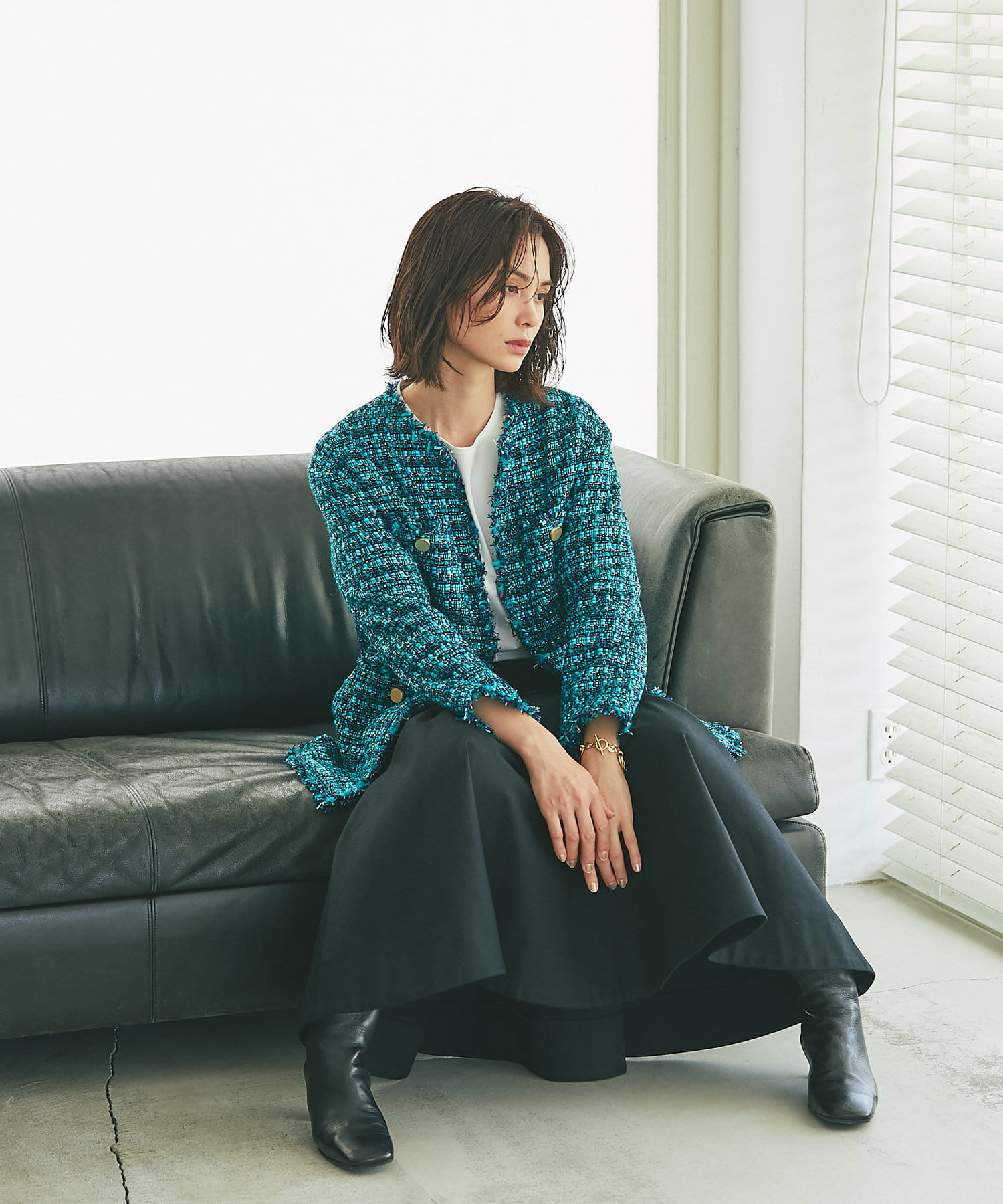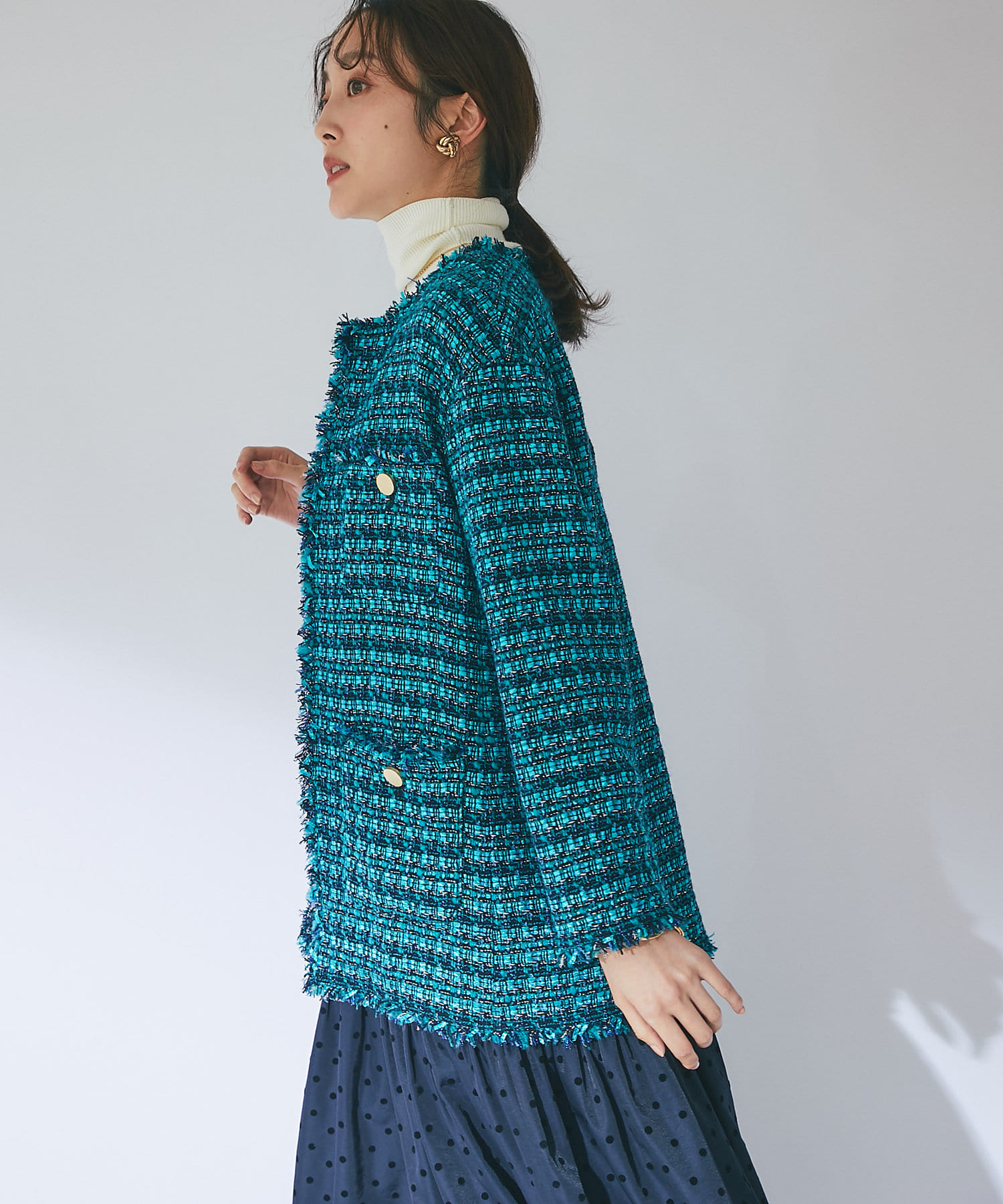 とても軽くて着やすいツイードジャケットはカラーで印象が変わります。