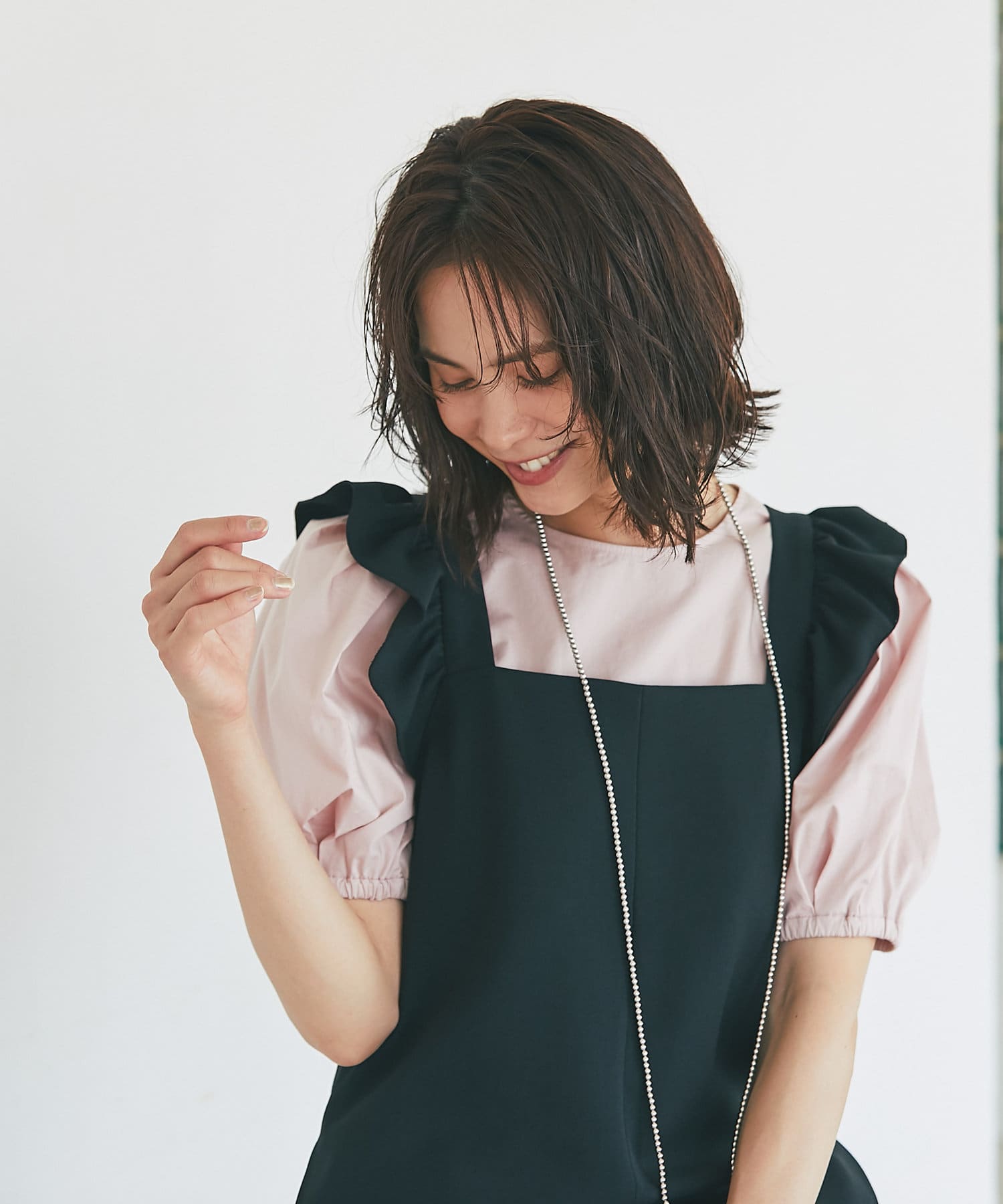 小ぶりなフリルで華奢で上品な印象のサロペットです。