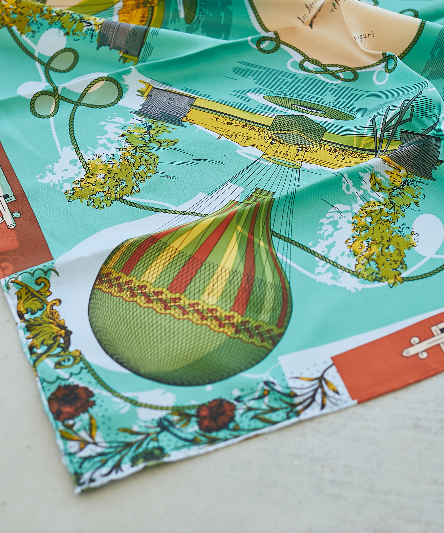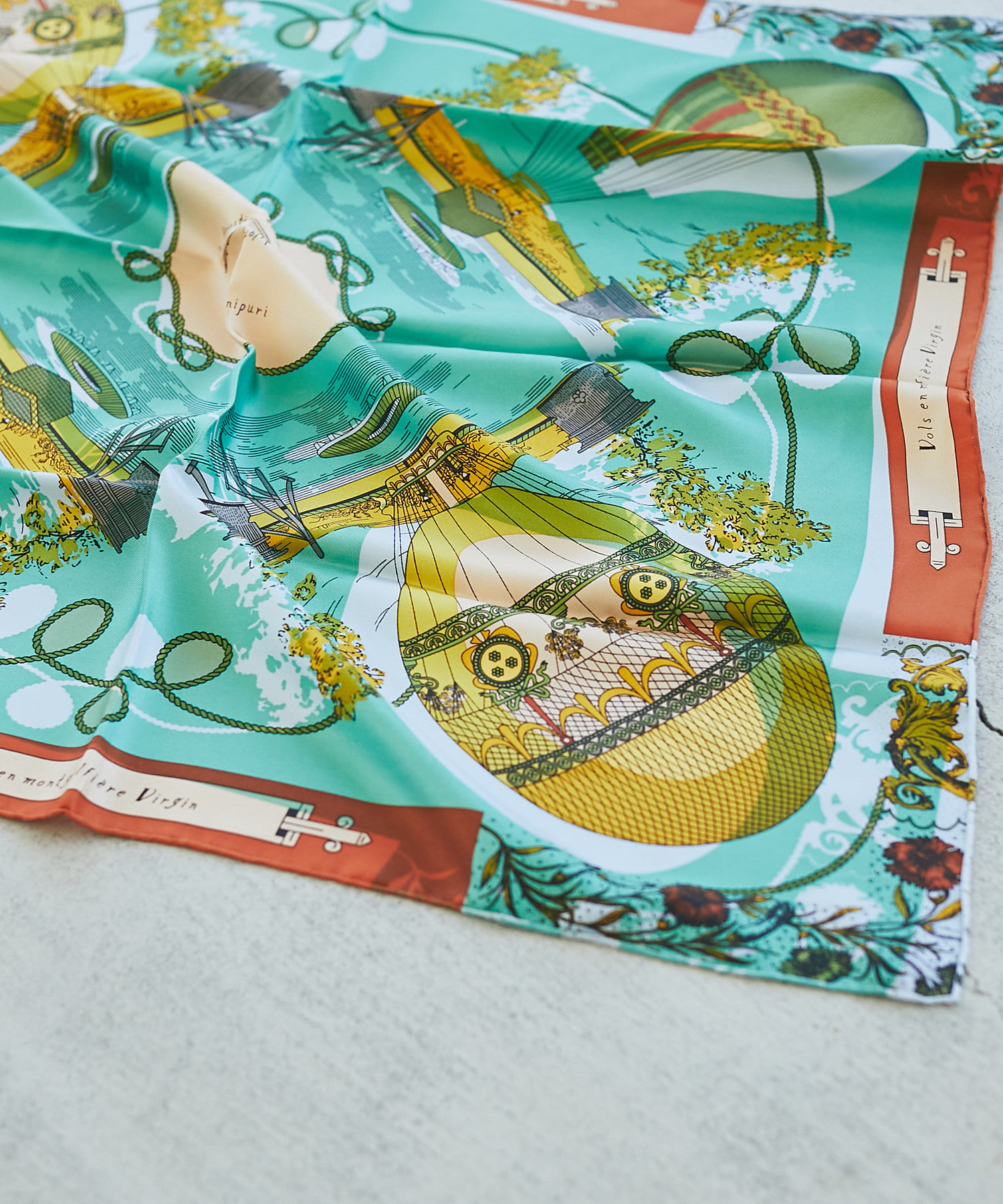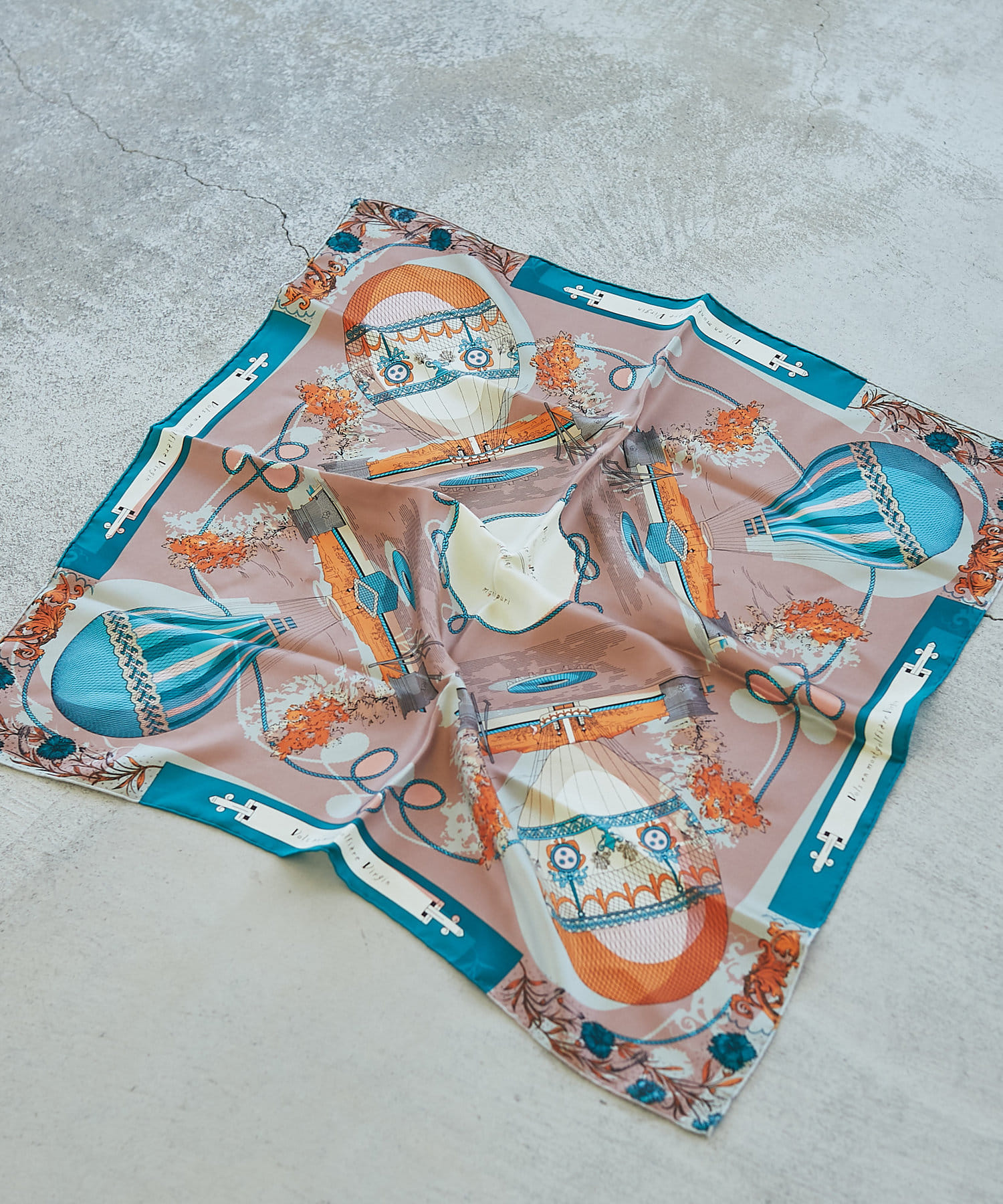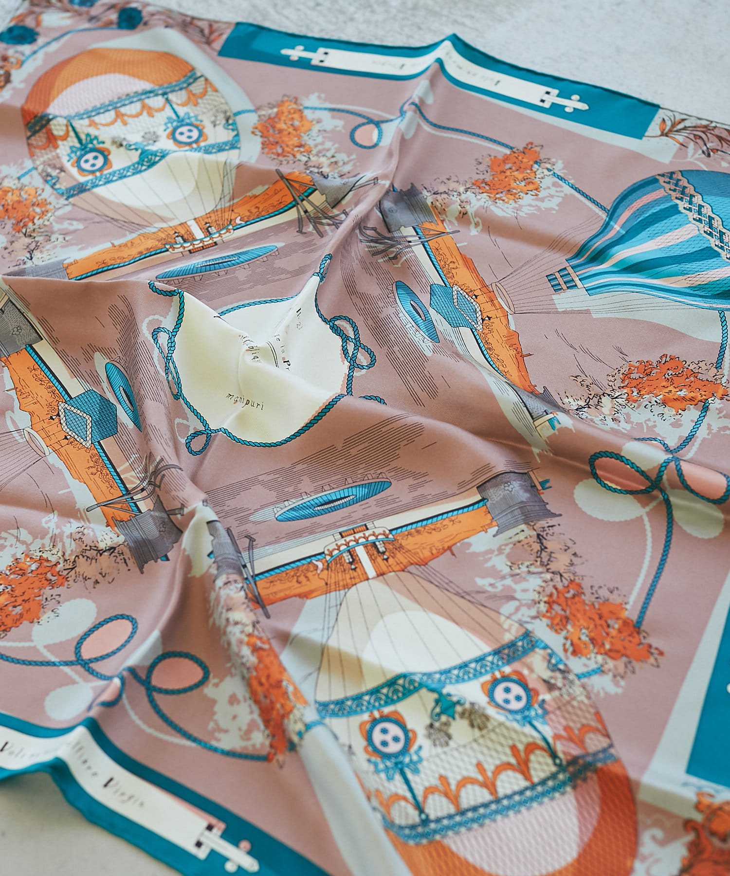 気球が離陸する瞬間をイメージし、ヴィンテージな花柄を縁にあしらったデザインのスカーフ。