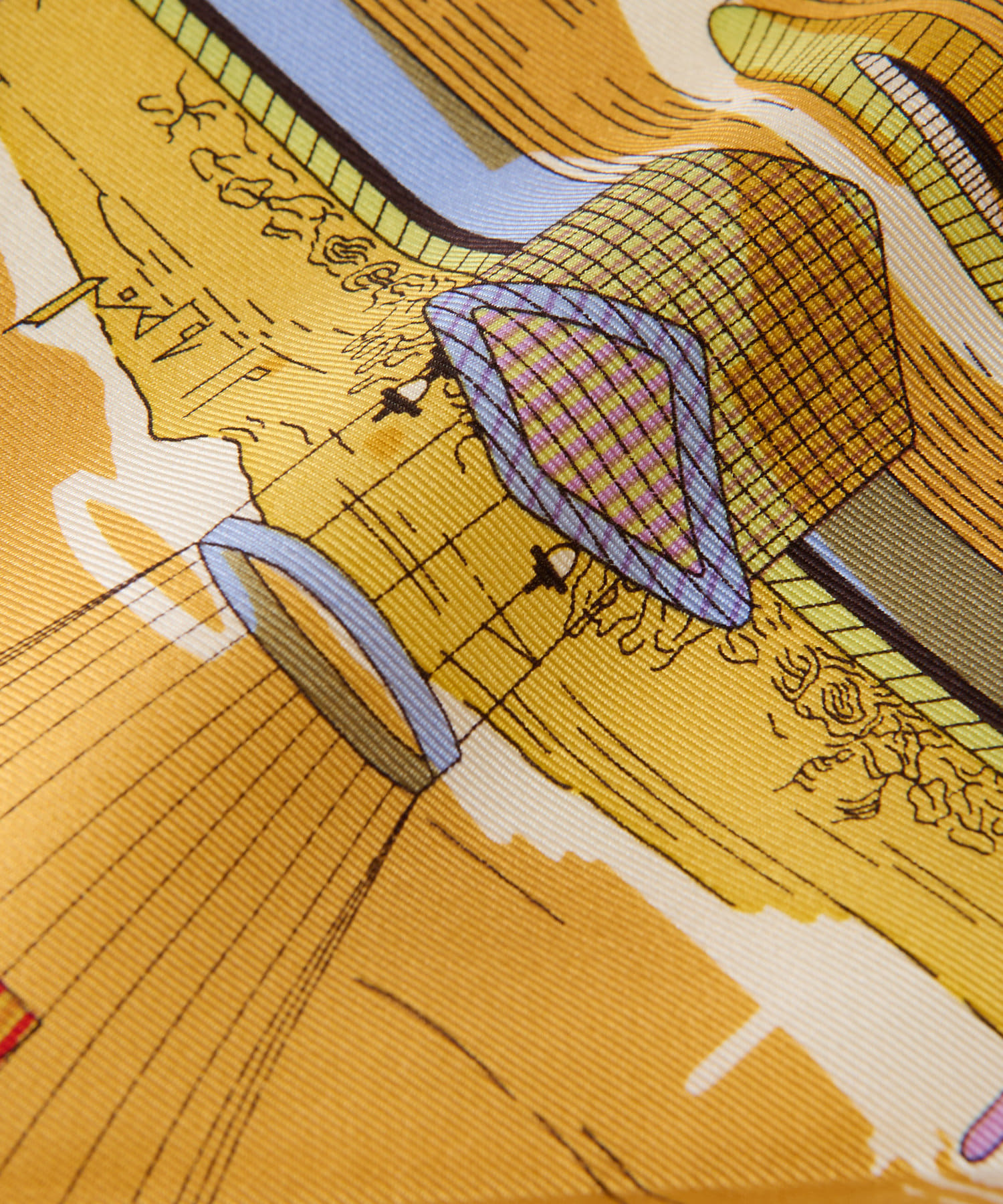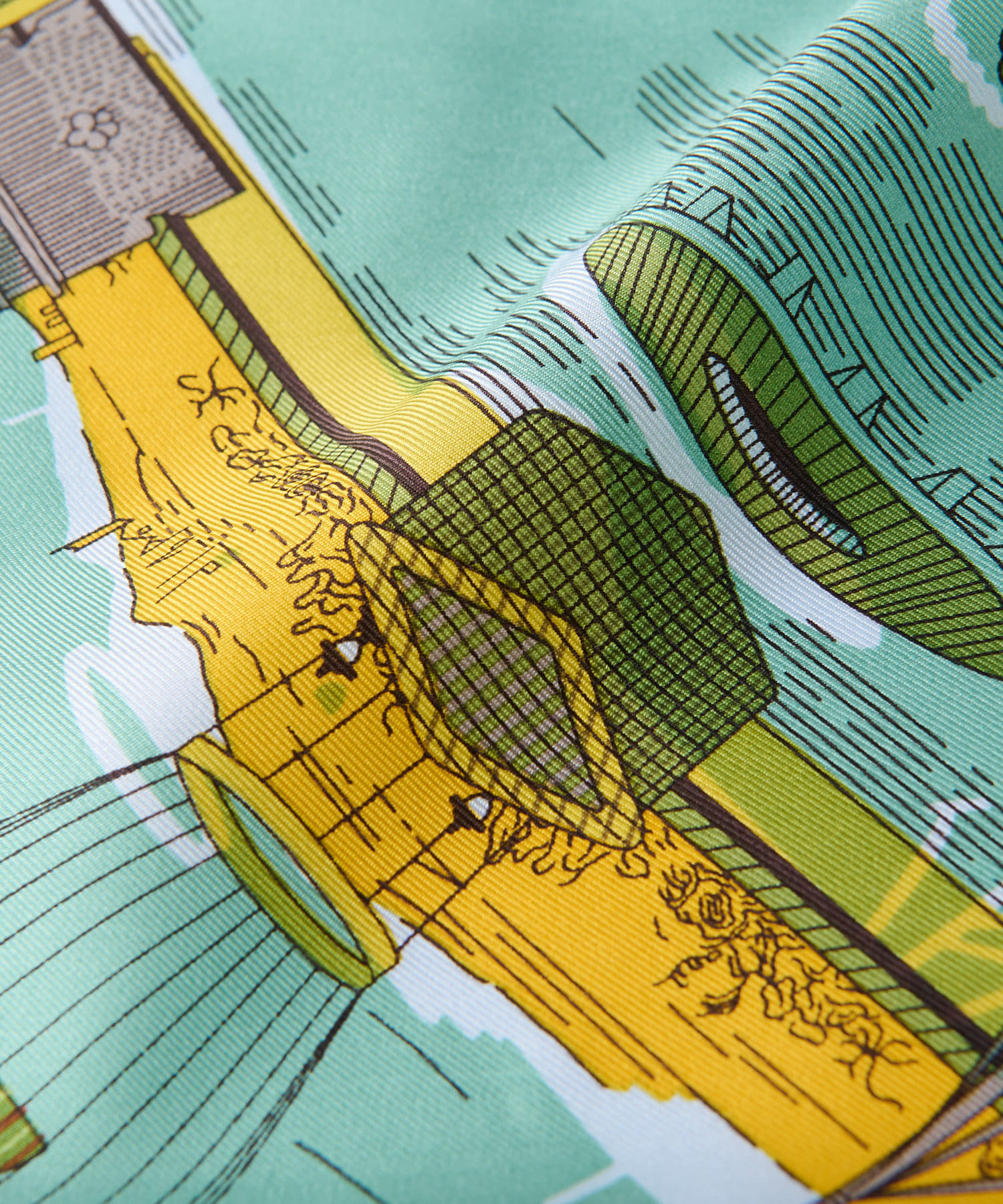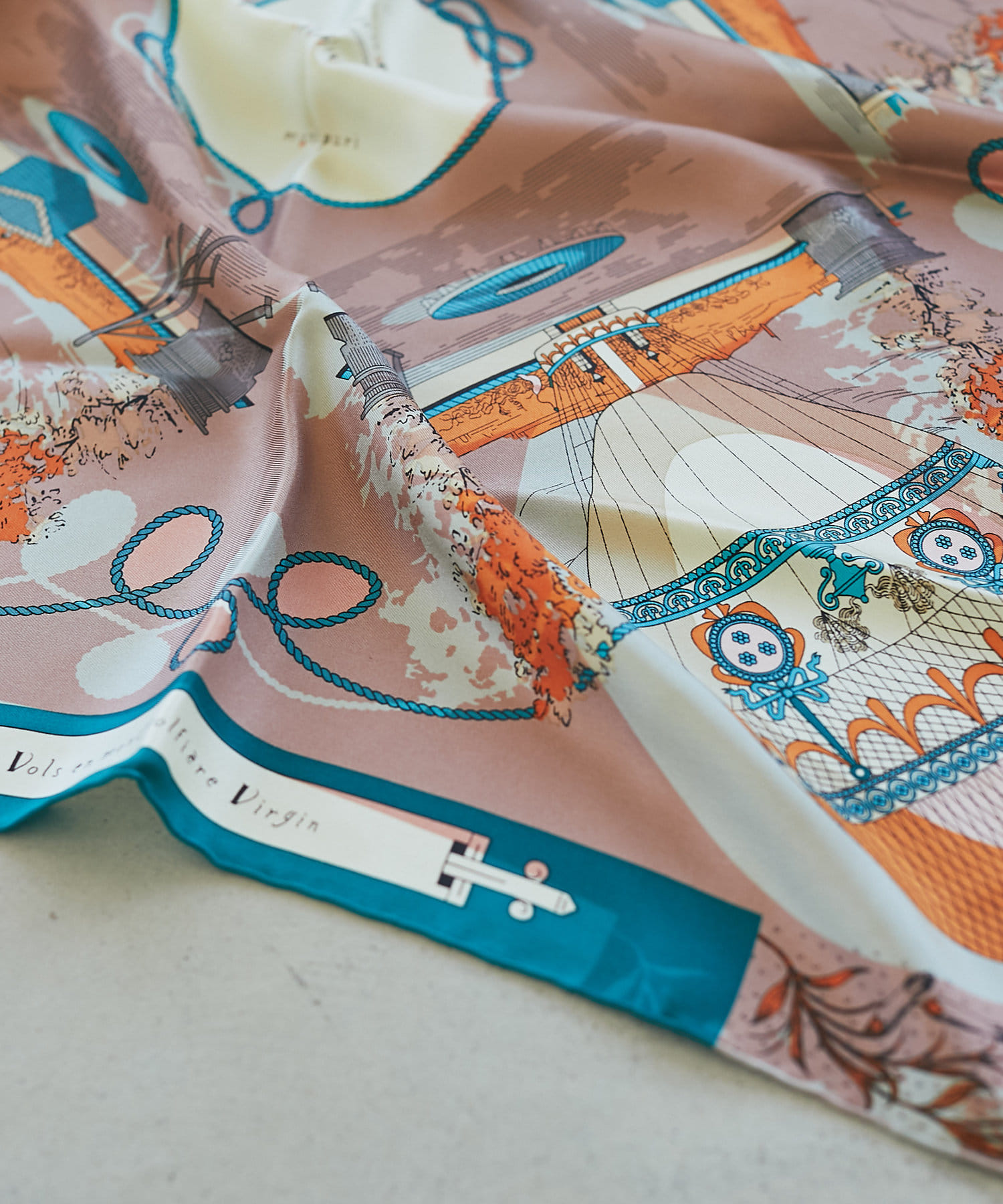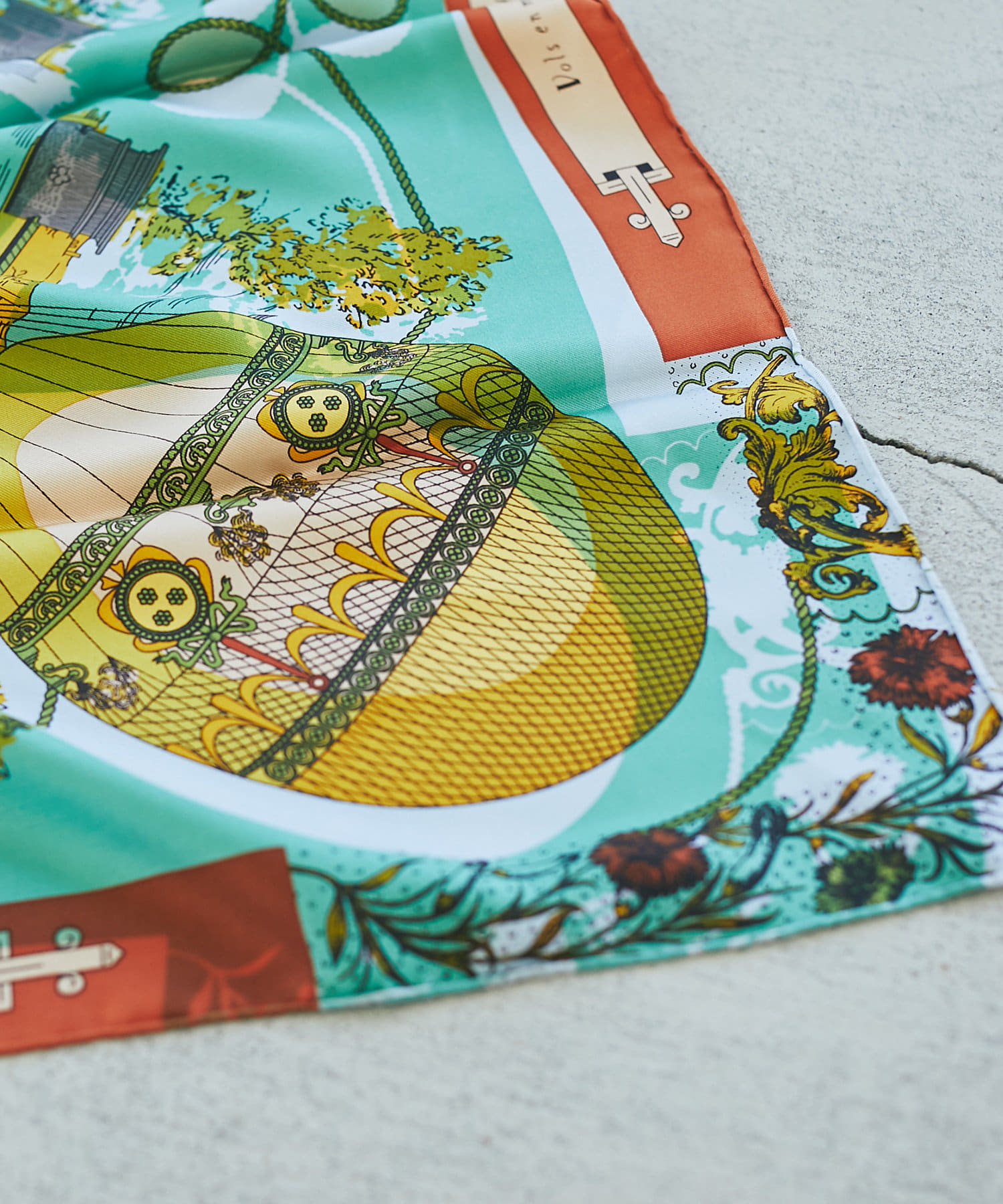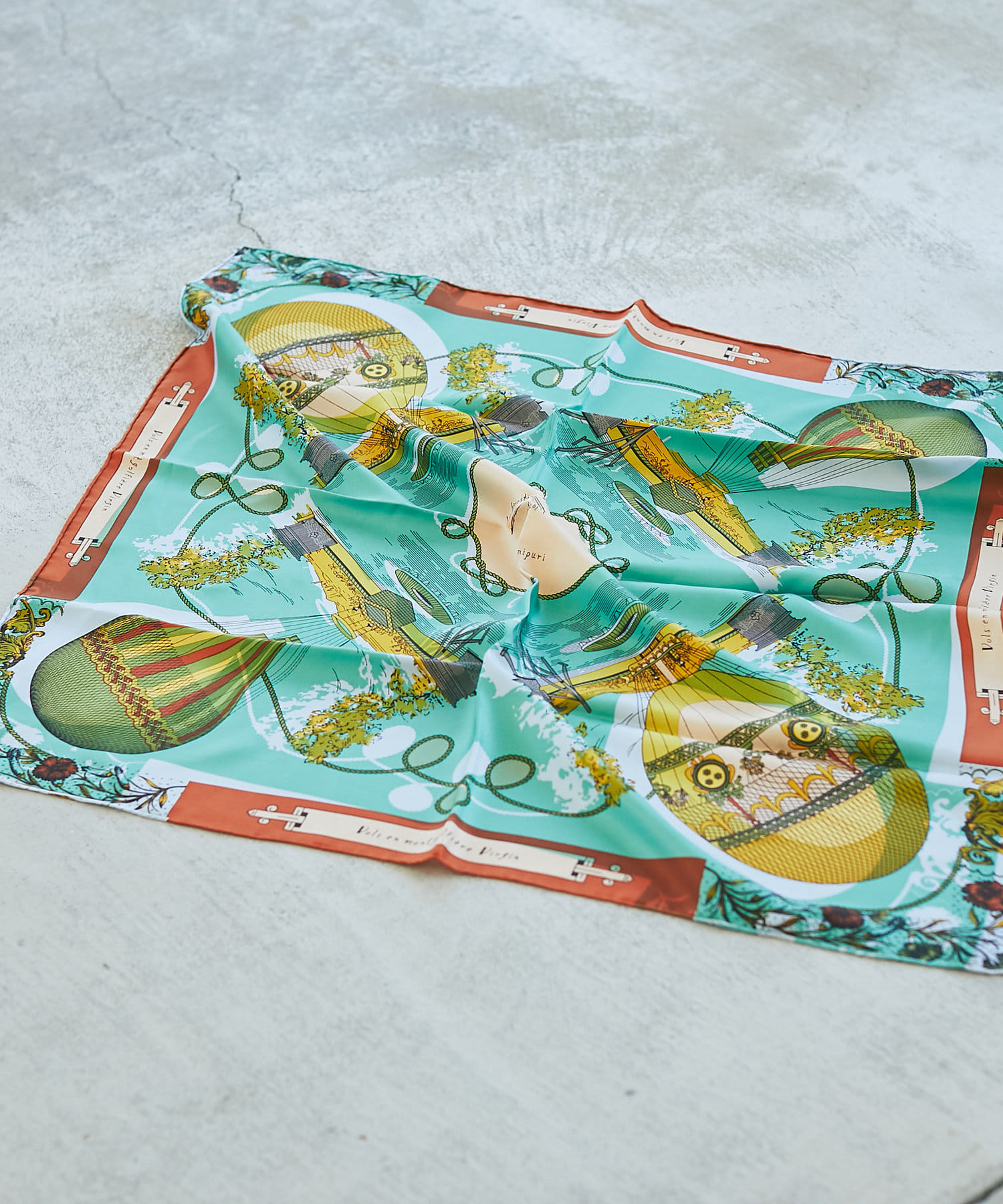 気球が離陸する瞬間をイメージし、ヴィンテージな花柄を縁にあしらったデザインのスカーフ。