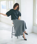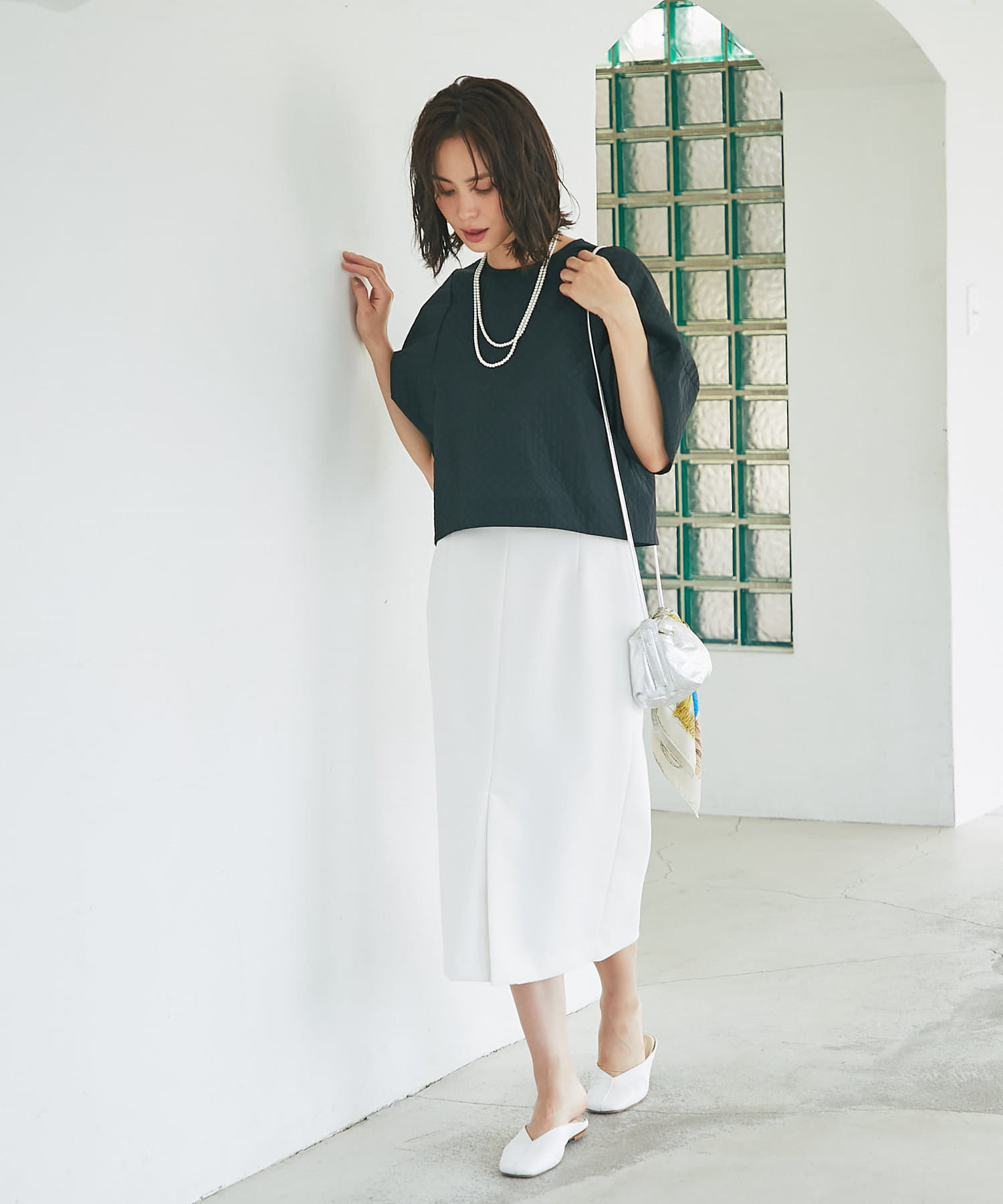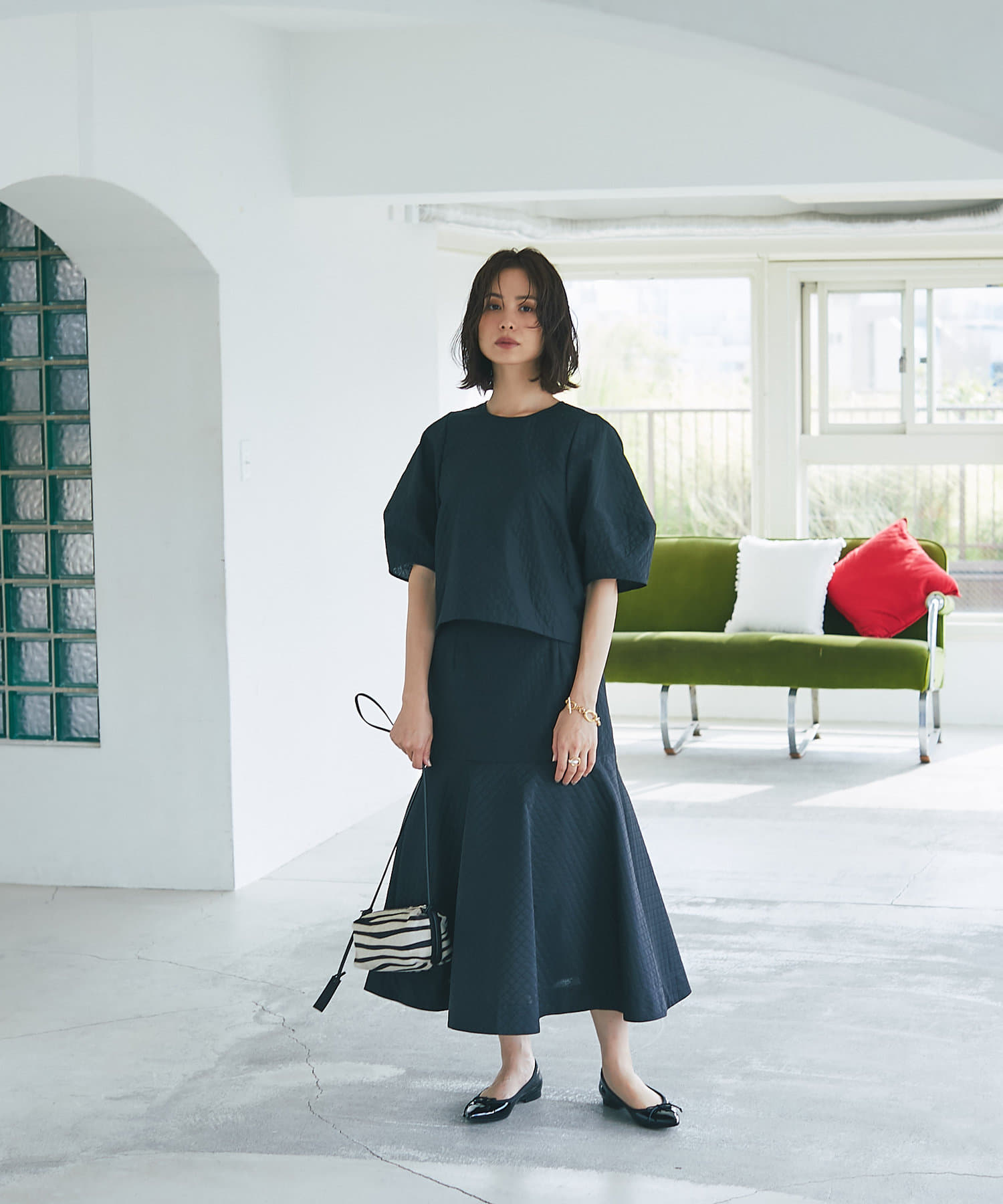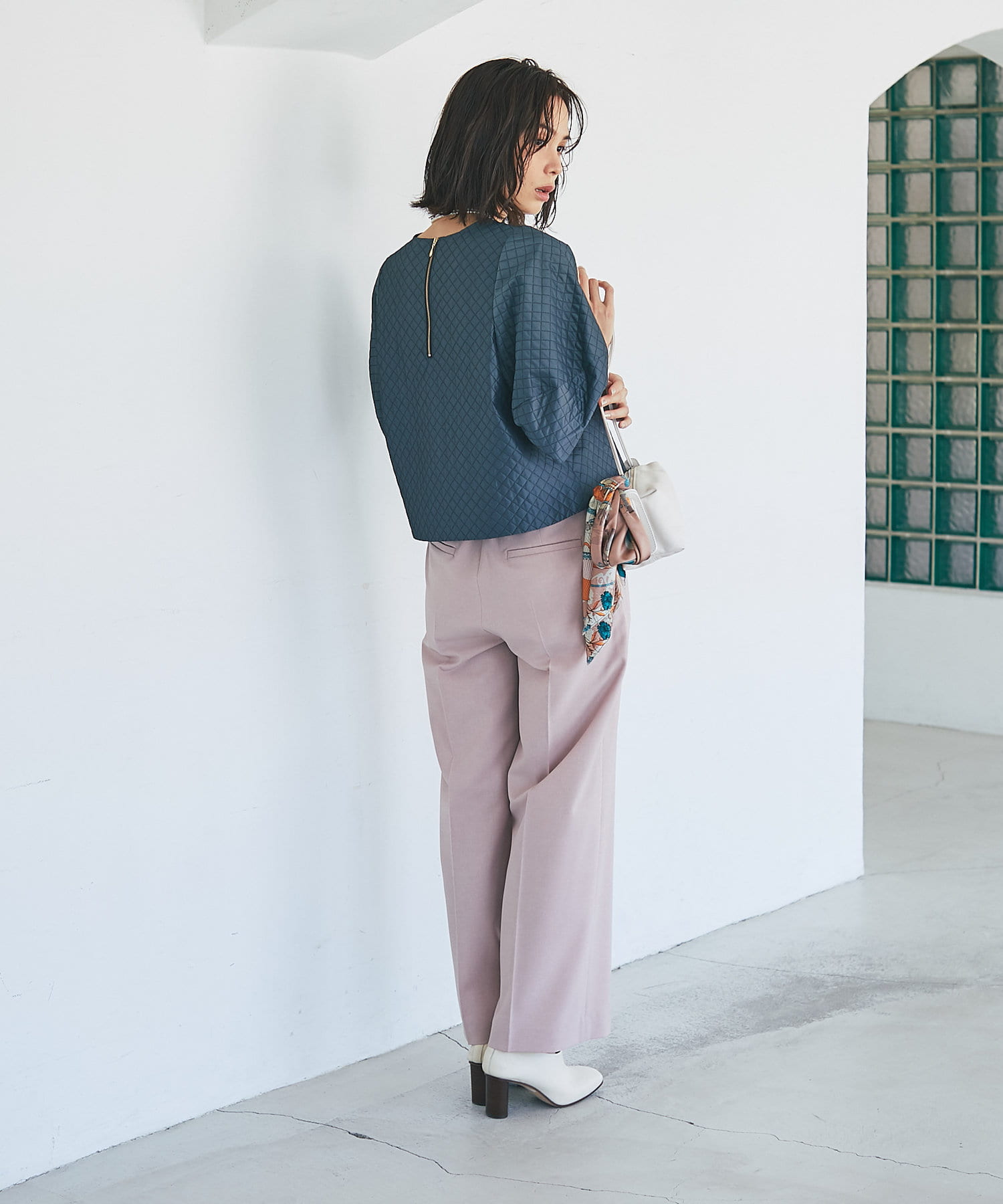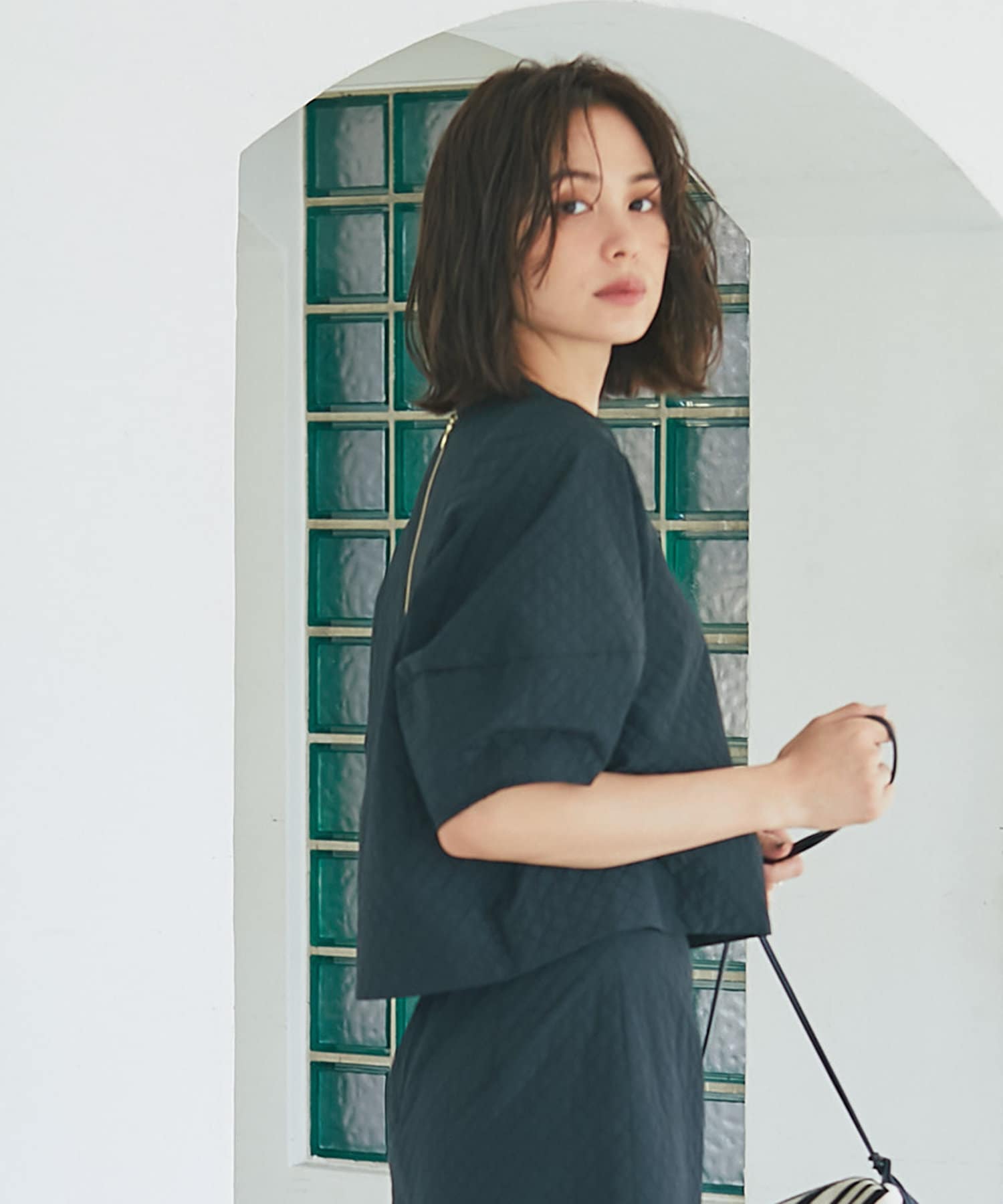 セットアップで着て頂くのはもちろん、ボトムを選ばないので使いやすい一枚ですが、ハイウエストのボトムと合わせて頂くと、脚長効果にも期待でき、おすすめです。