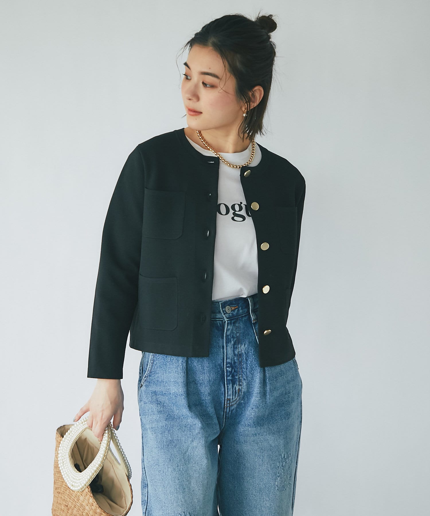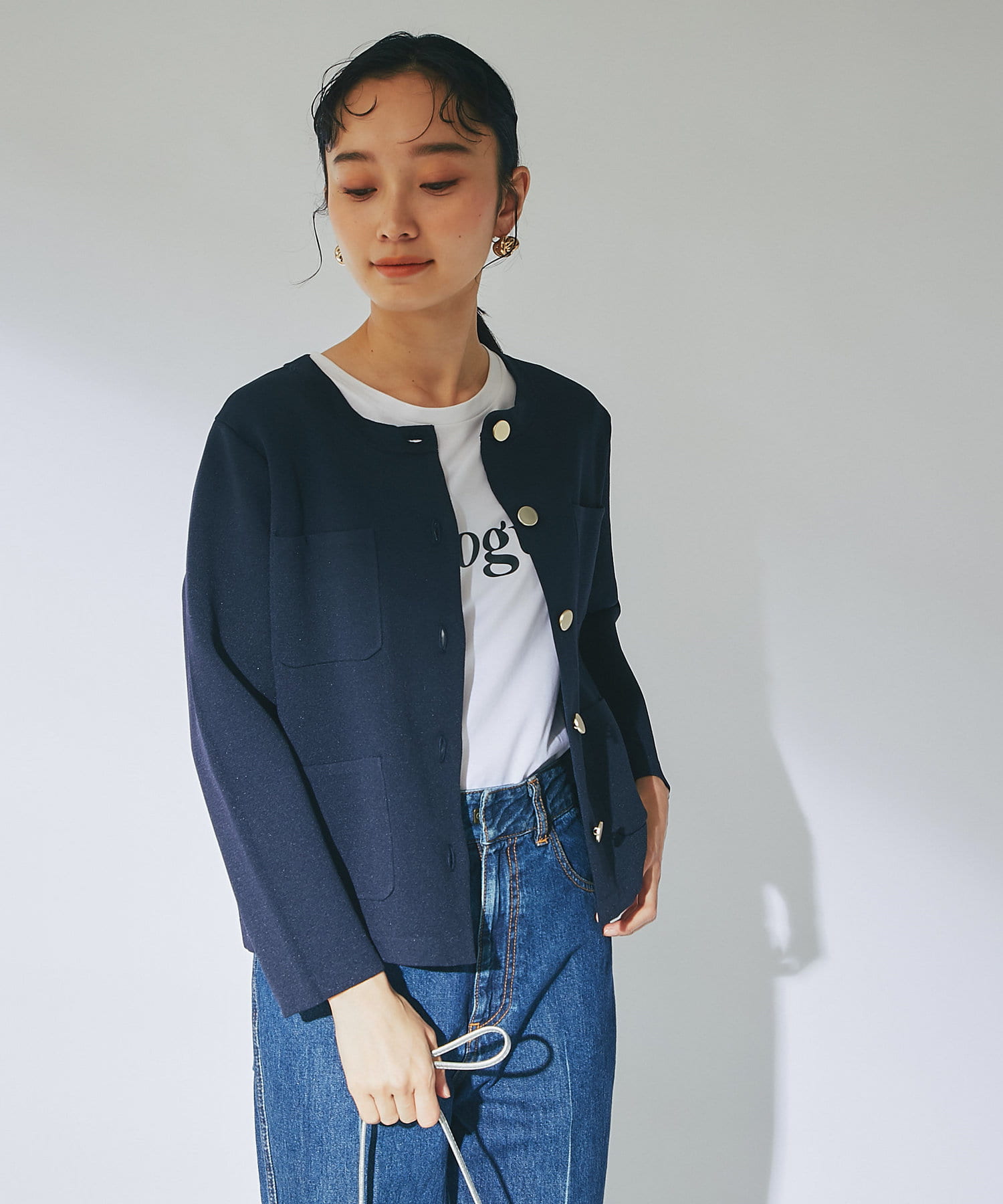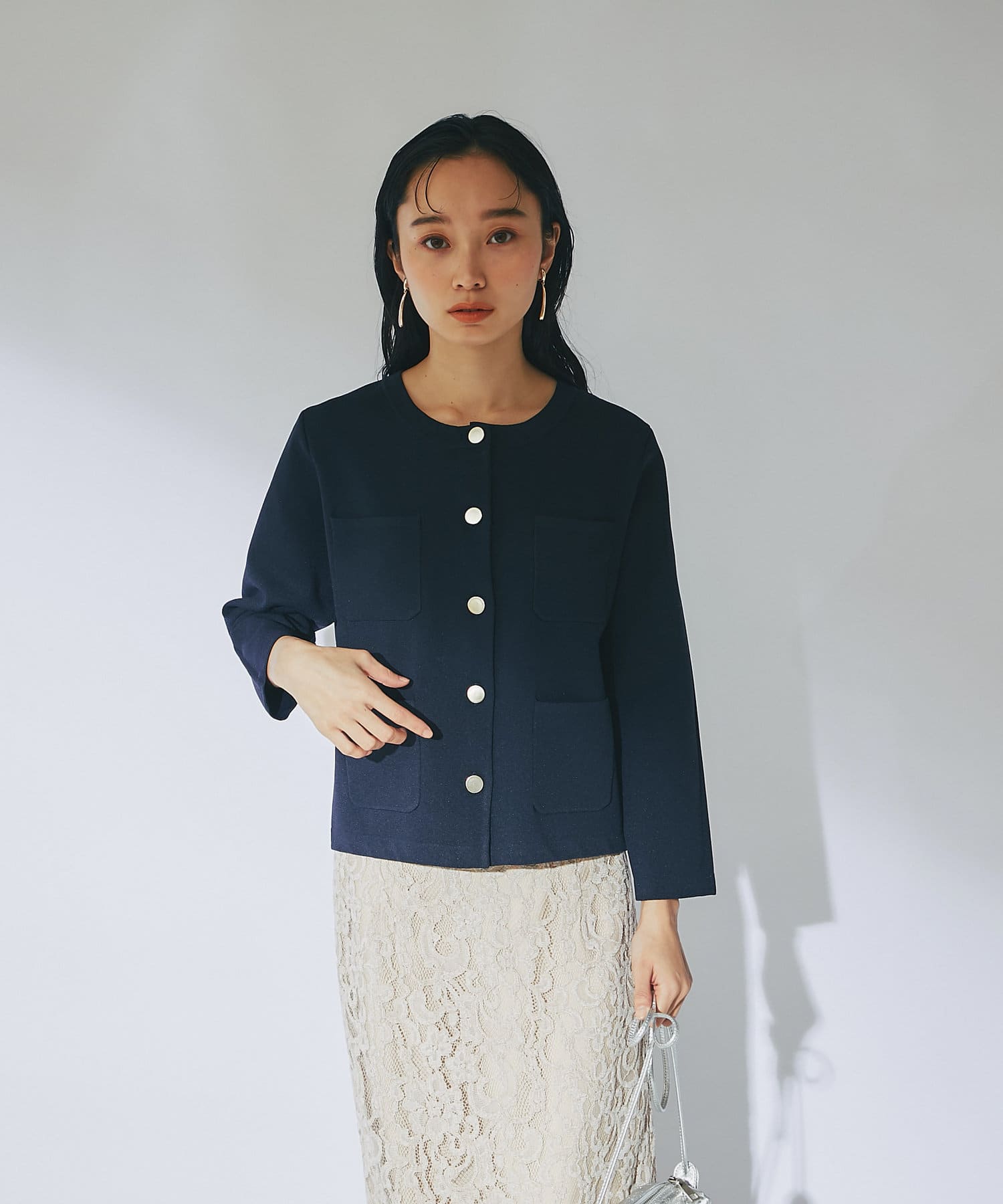 ゴールドのボタンと4つポケットがデザインポイントになっており、ジャケット風な見た目ながら、ジャケットほどかっちりせず、サイズ感もコンパクトなので軽く羽織って頂けます。