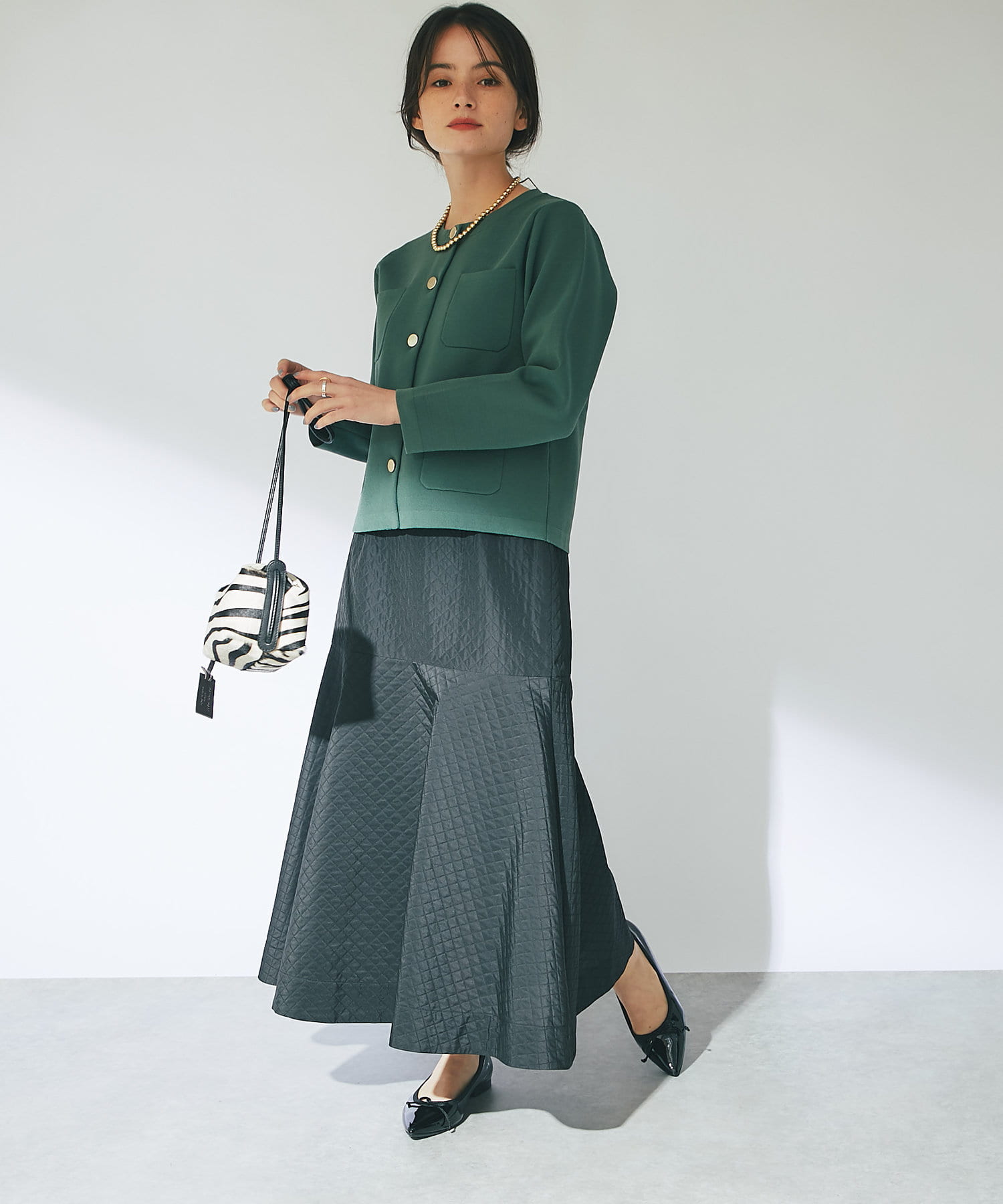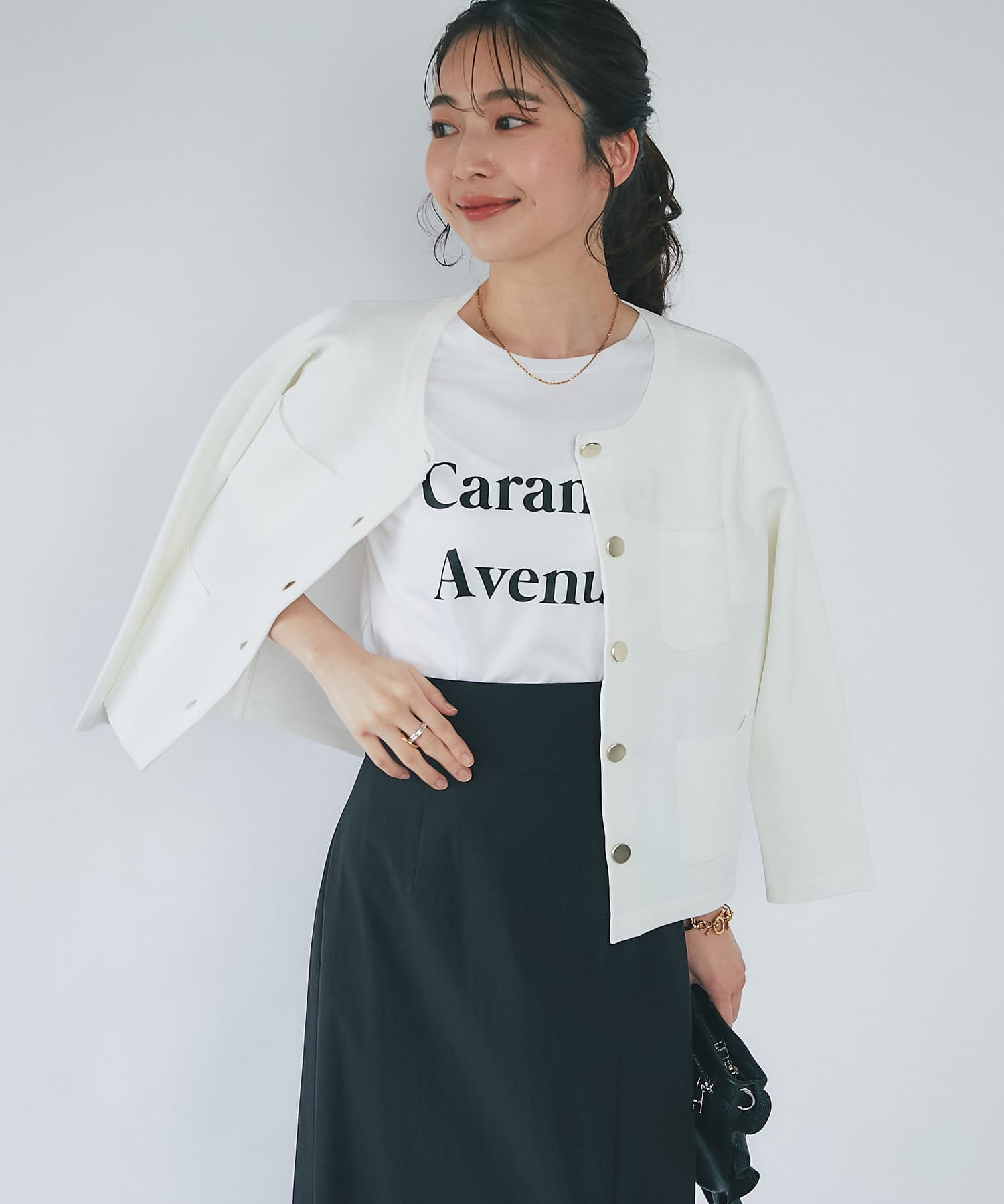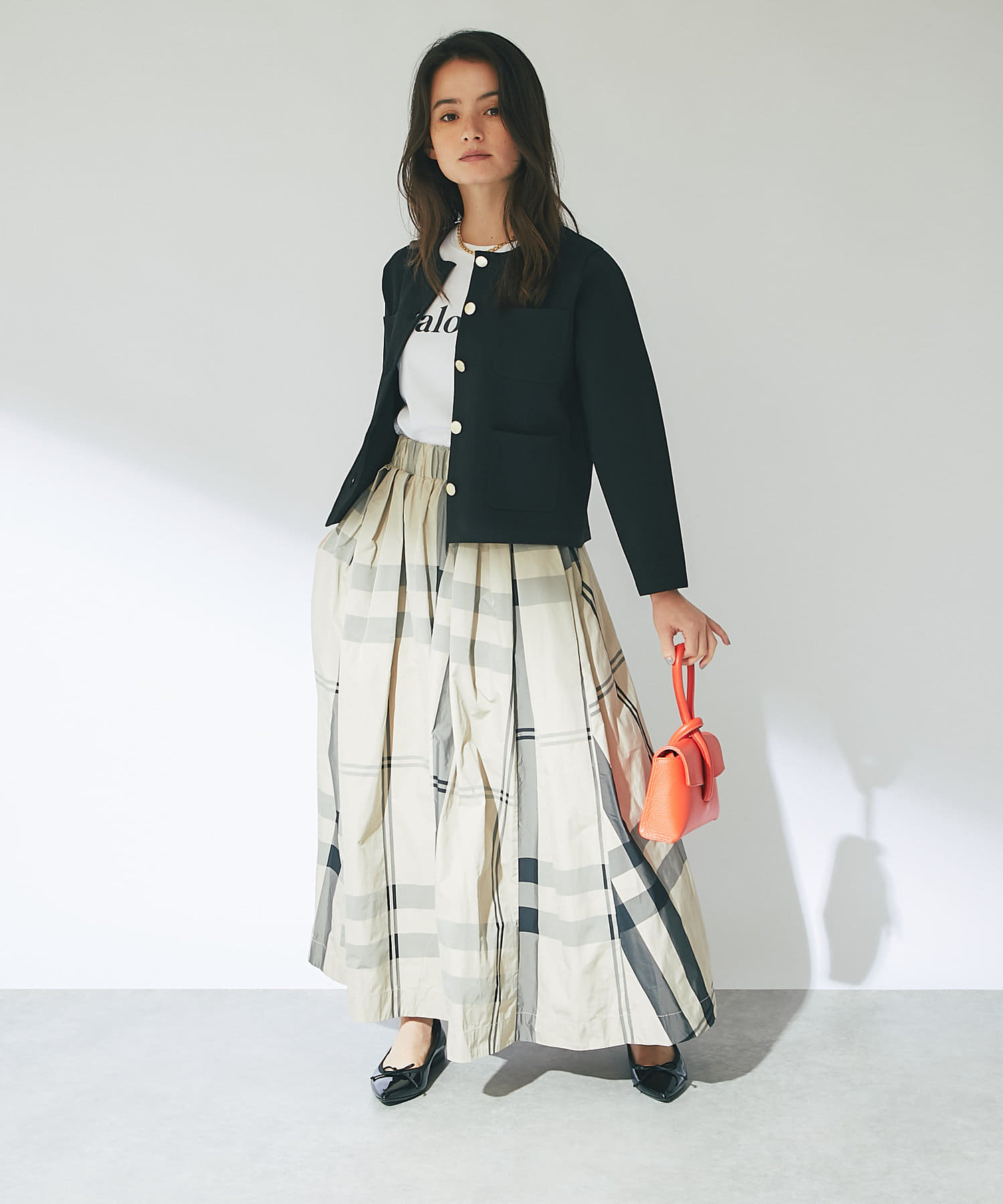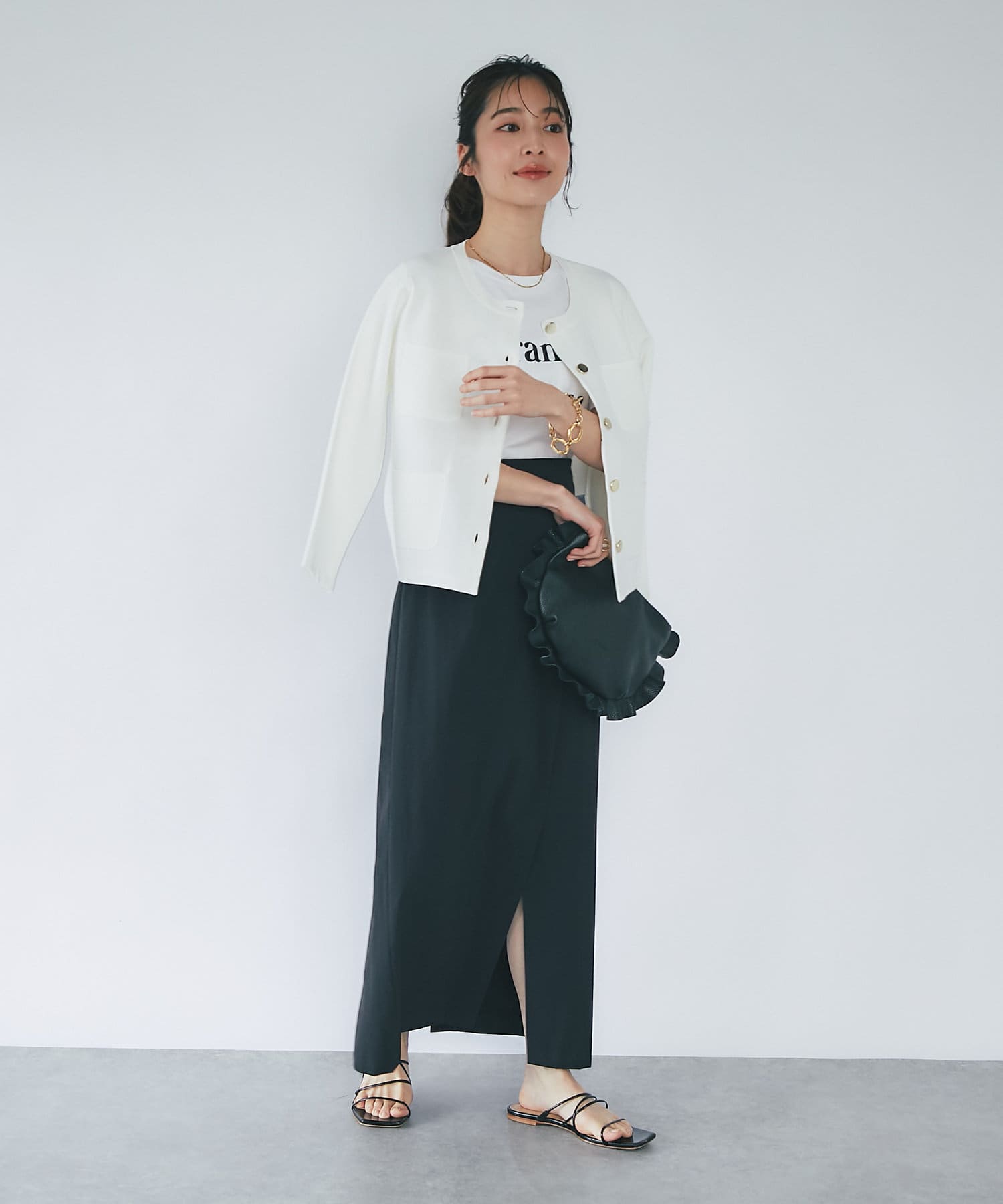 小物使いや合わせるアイテムで印象が自在に変わるシンプルなデザインなので、マーメイドスカートやタイトスカート、柄物のスカートにボトムを変えるだけでも色々なコーディネートが楽しめます。