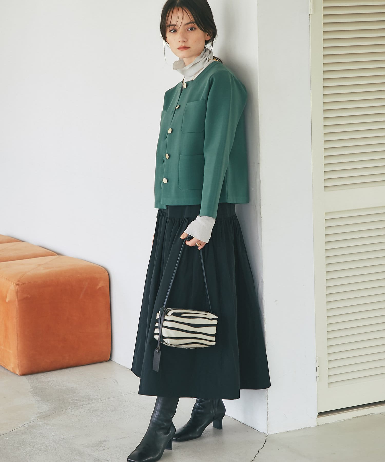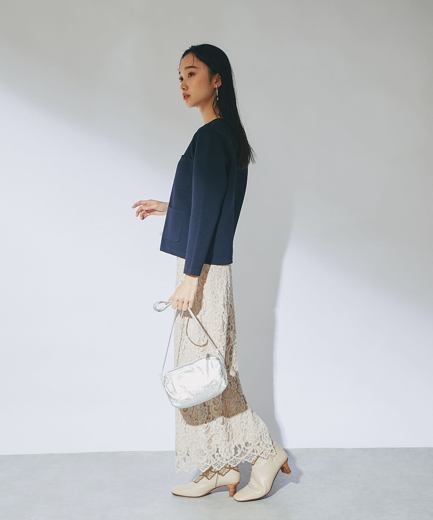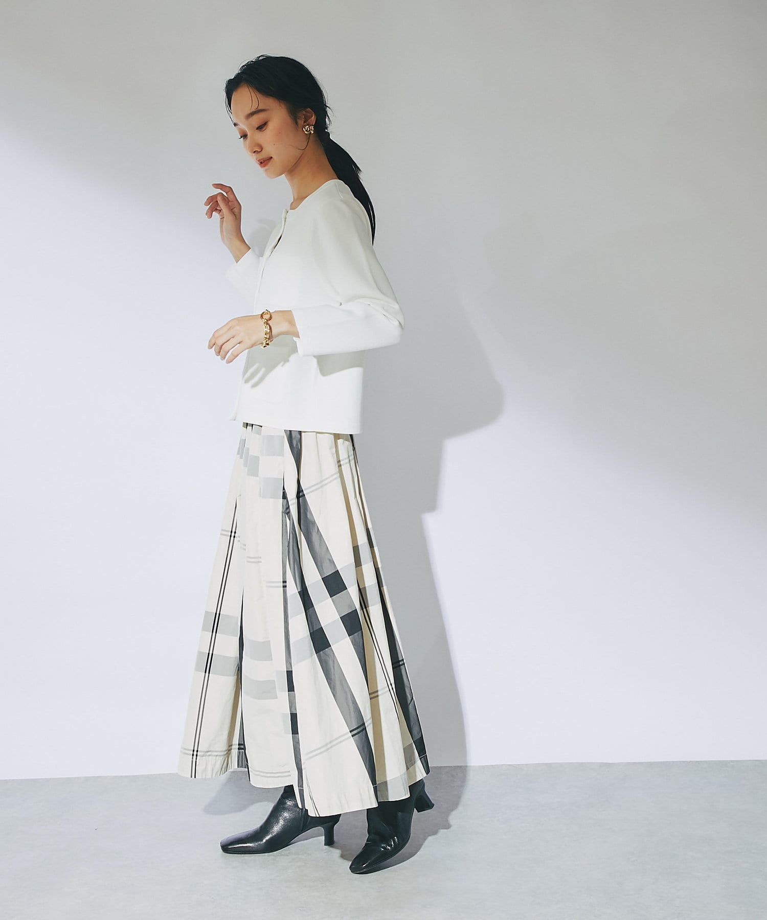 小物使いや合わせるアイテムで印象が自在に変わるシンプルなデザインなので、マーメイドスカートやタイトスカート、柄物のスカートにボトムを変えるだけでも色々なコーディネートが楽しめます。