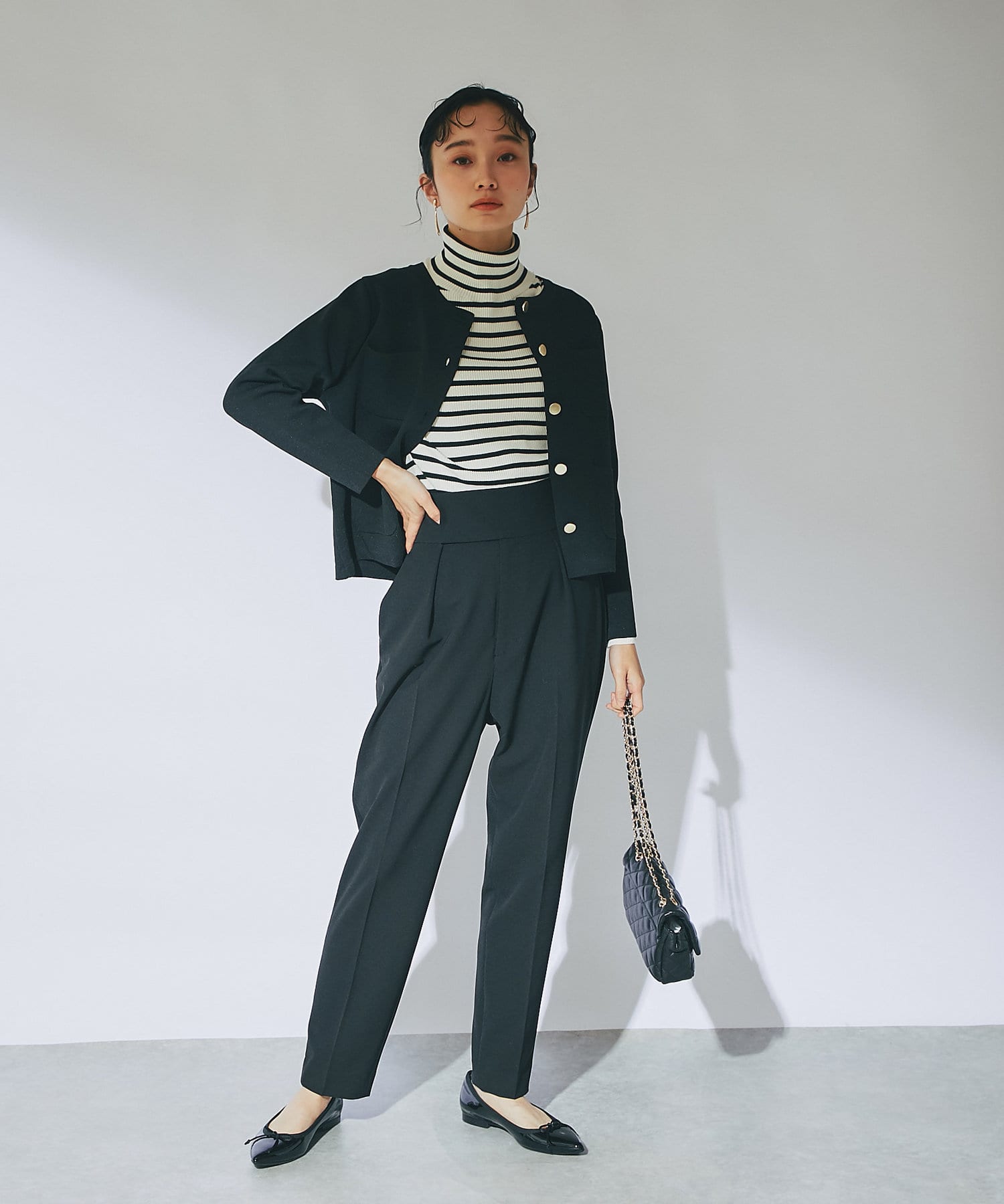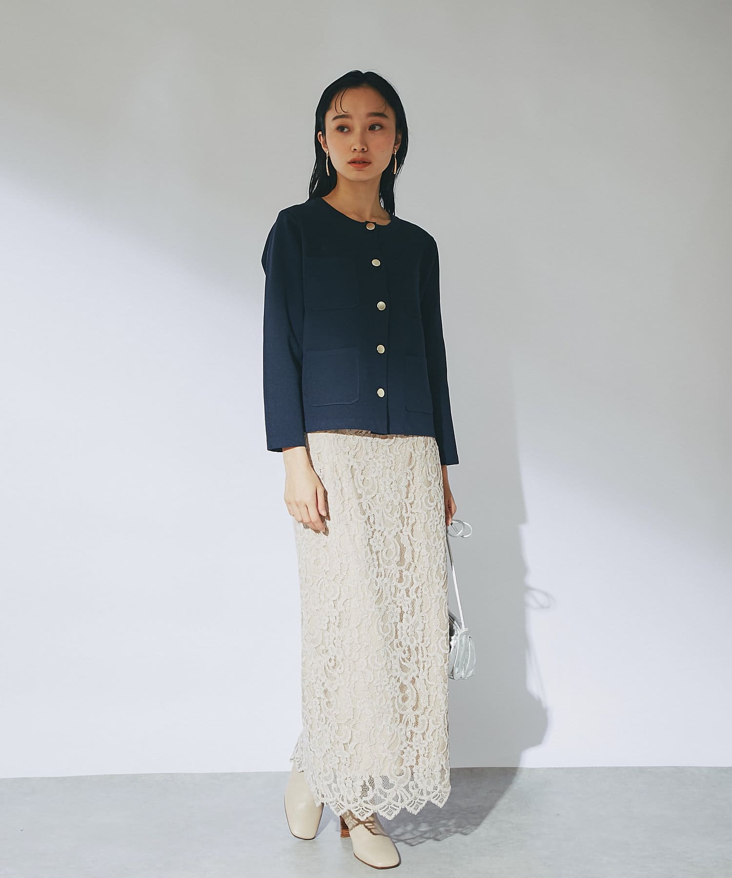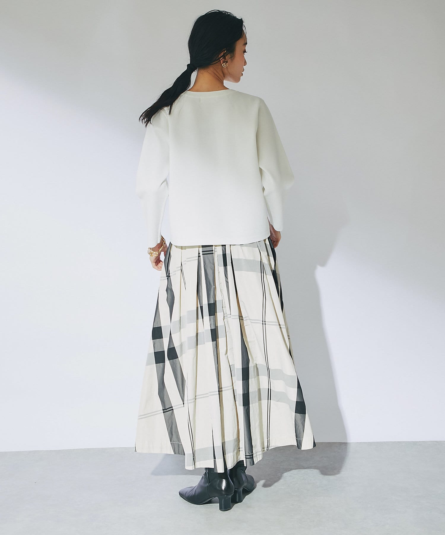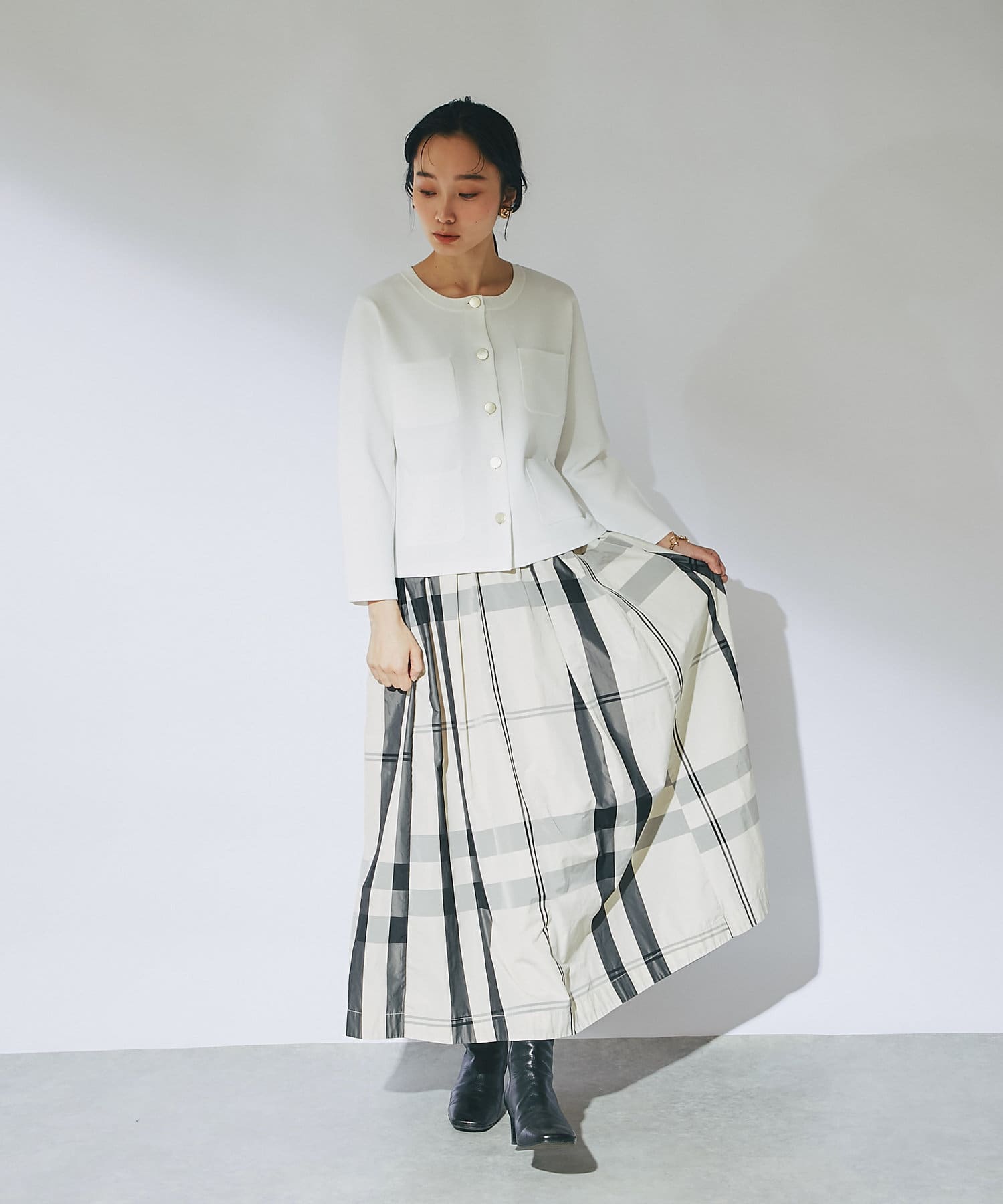 小物使いや合わせるアイテムで印象が自在に変わるシンプルなデザインなので、マーメイドスカートやタイトスカート、柄物のスカートにボトムを変えるだけでも色々なコーディネートが楽しめます。