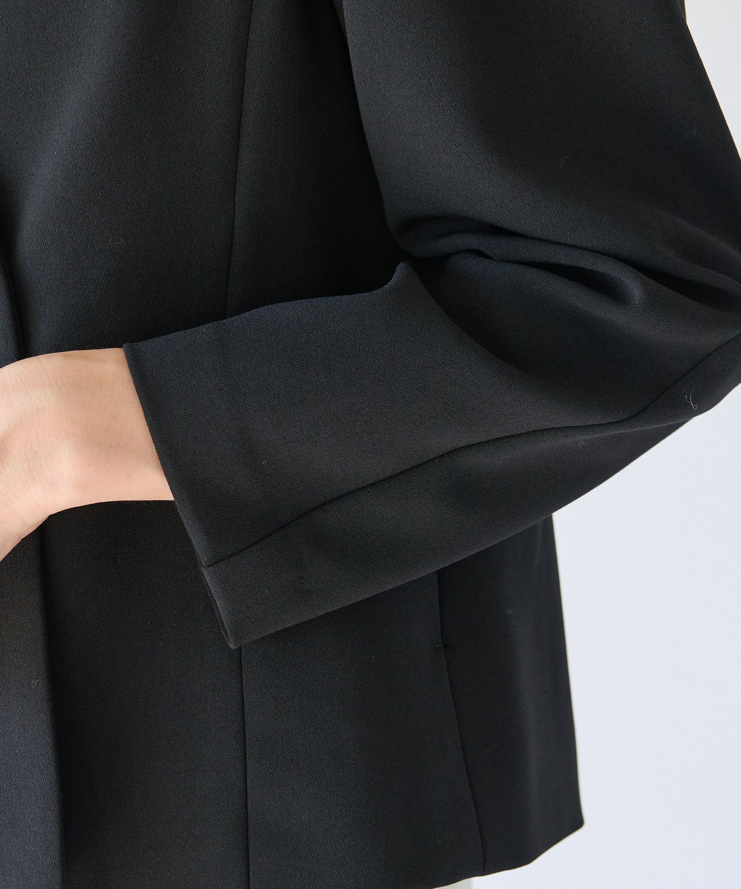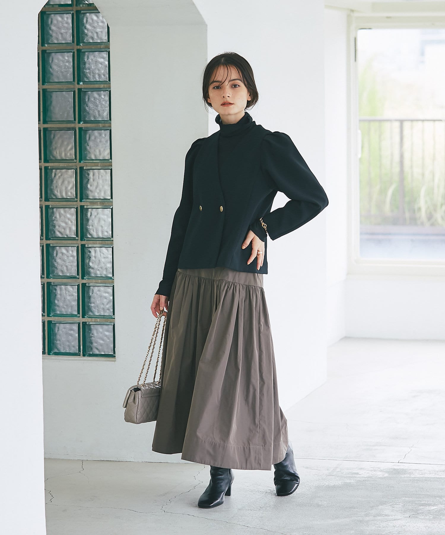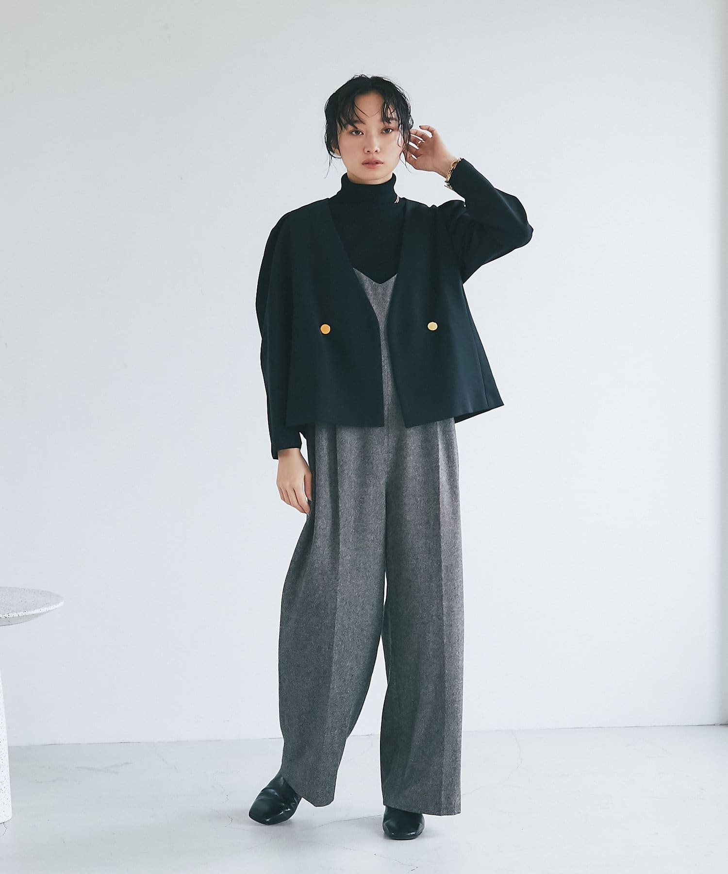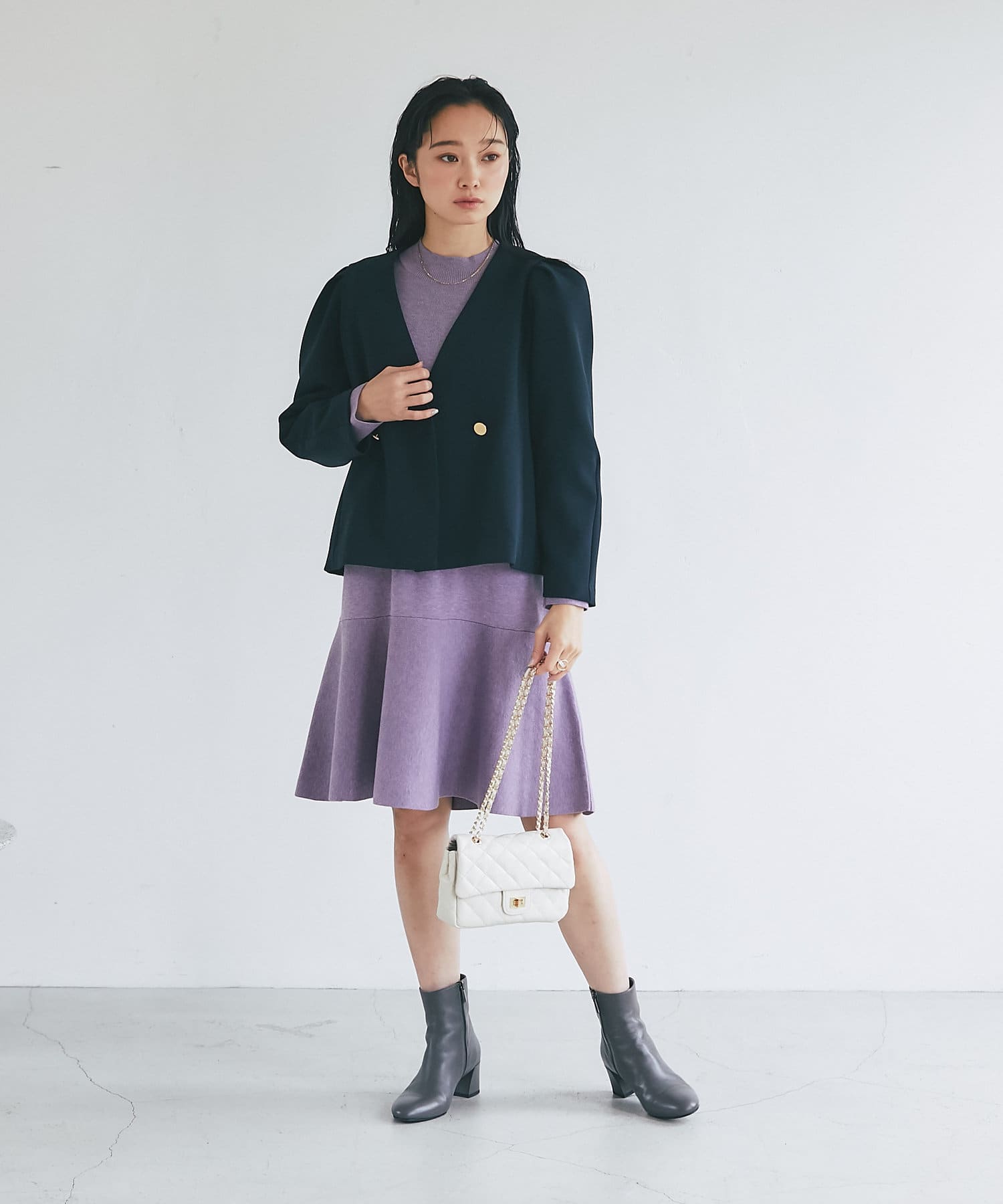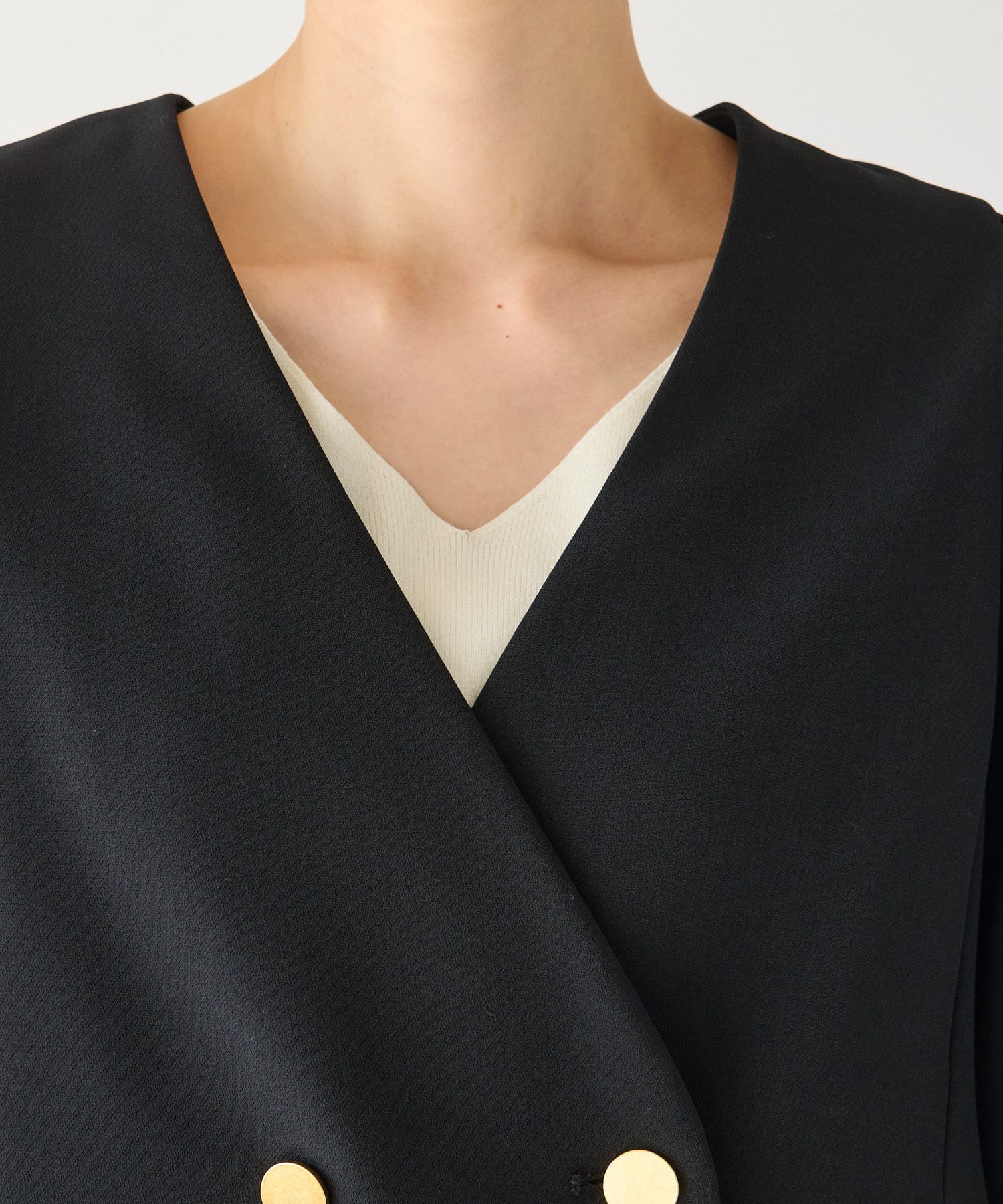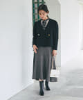ノーカラーで抜け感を出しやすく、女性らしい着こなしが叶います。