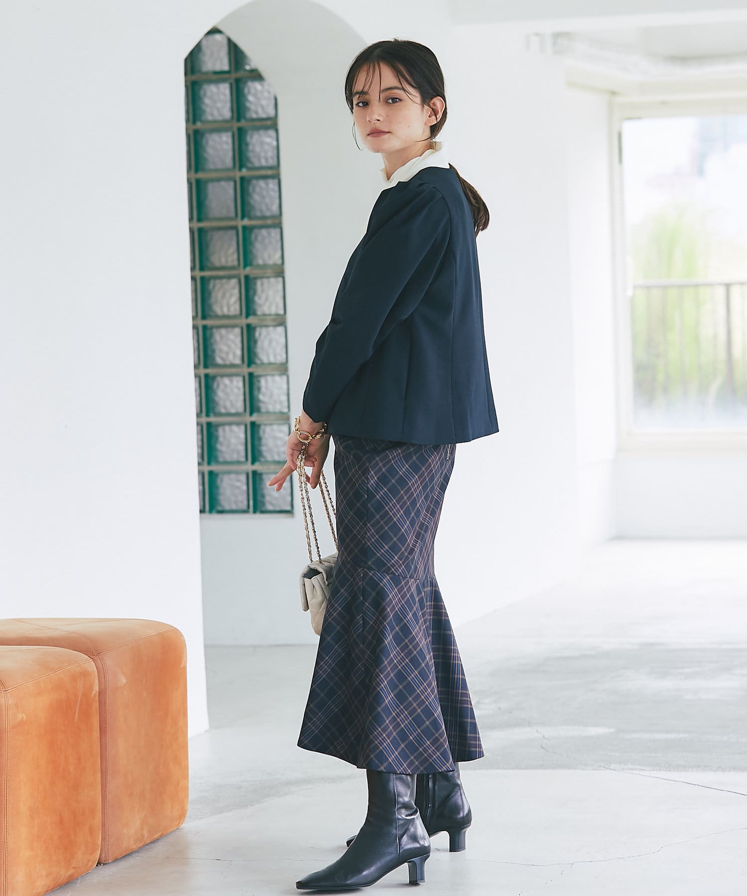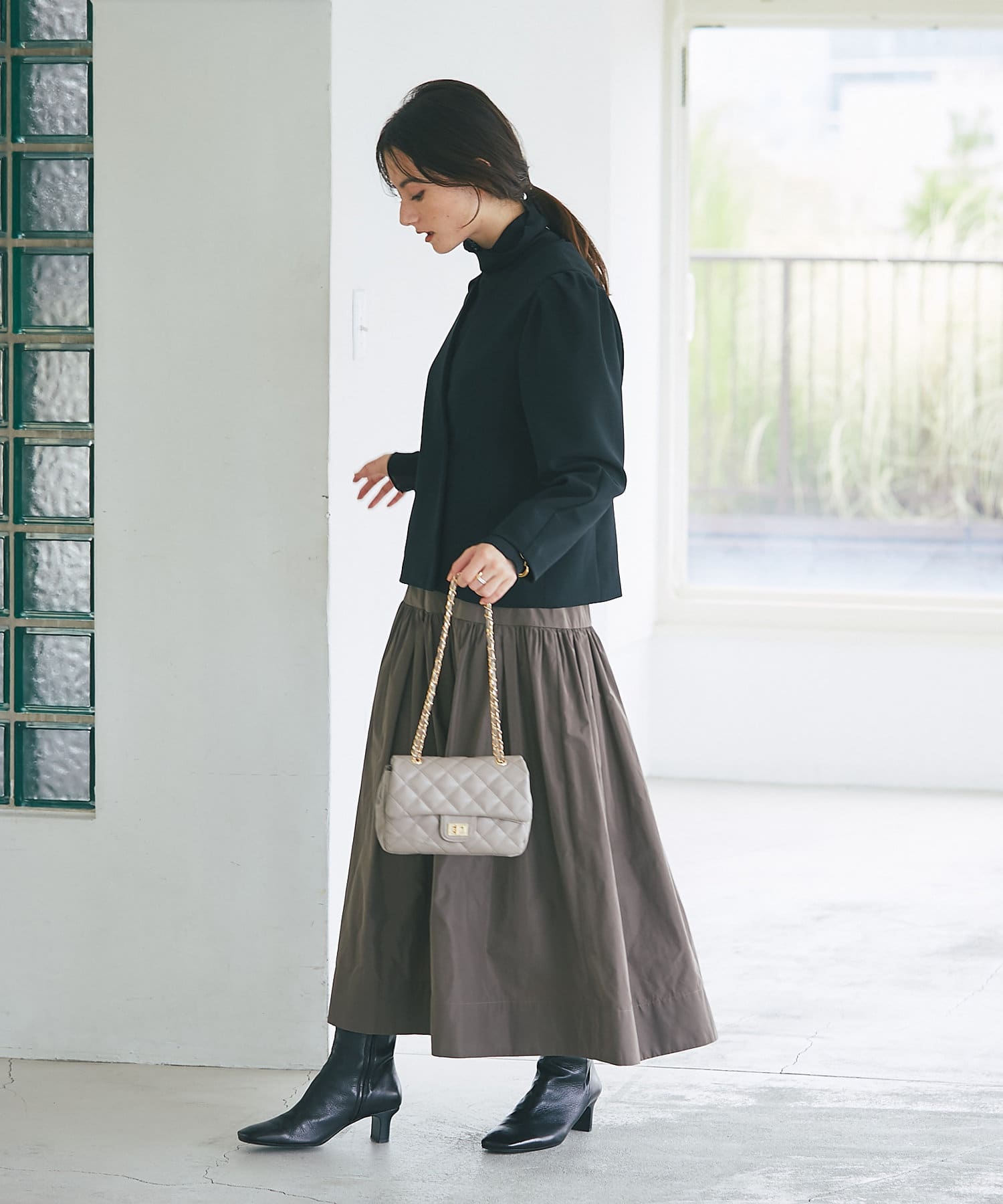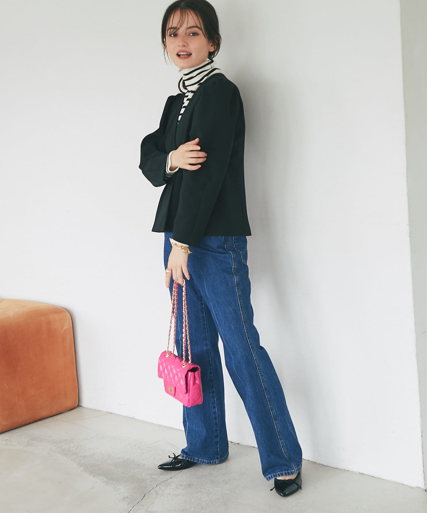 フェミニンなスカートやデニムなどのカジュアルなアイテムにも合わせやすく、ハイウエストのボトムと合わせて頂くと脚長効果にも期待できるのでおすすです。