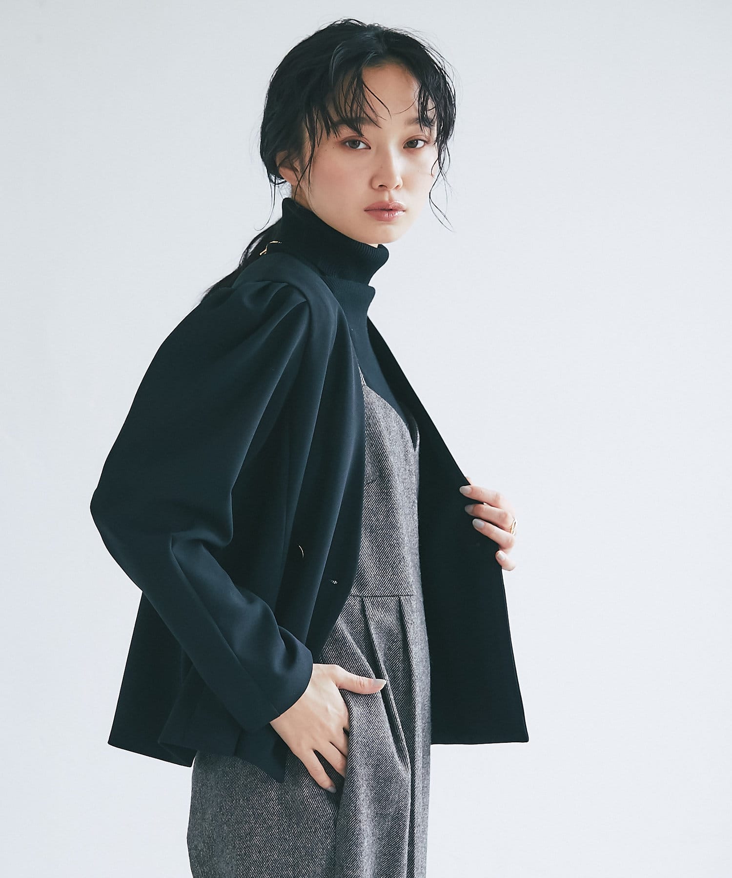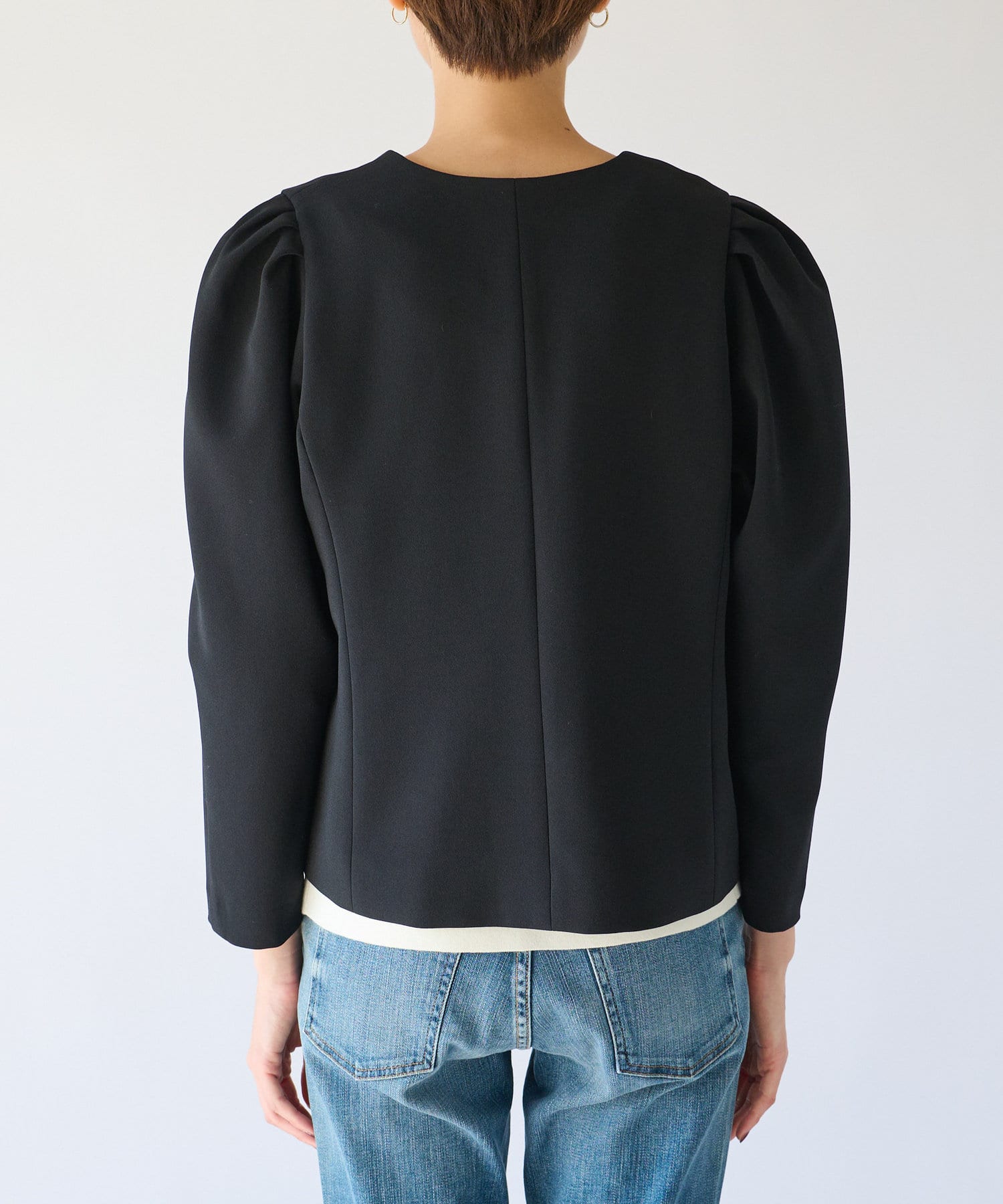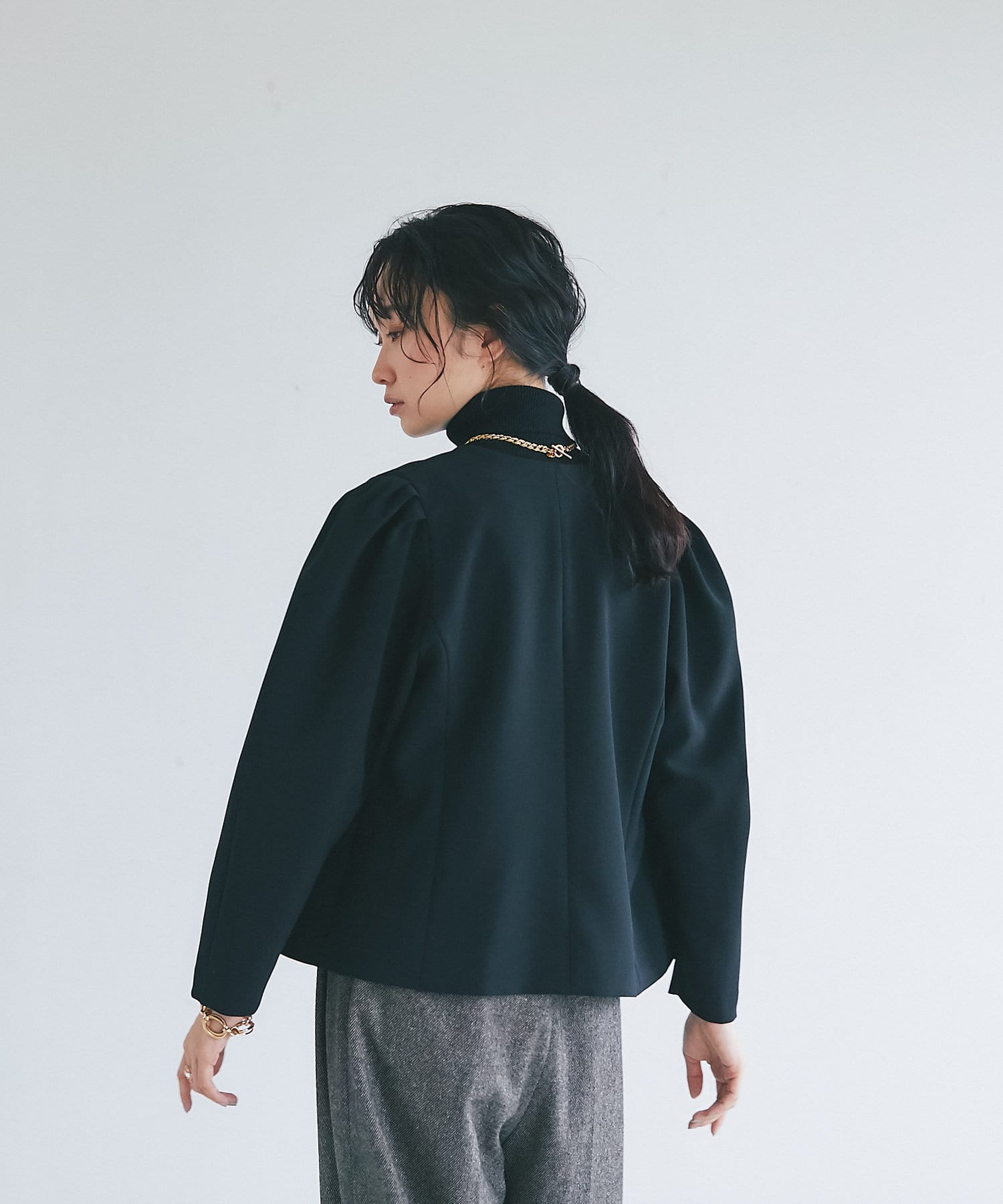 パワショル仕様が珍しいジャケットはクロップド丈でボトムスを選ばないシルエット。