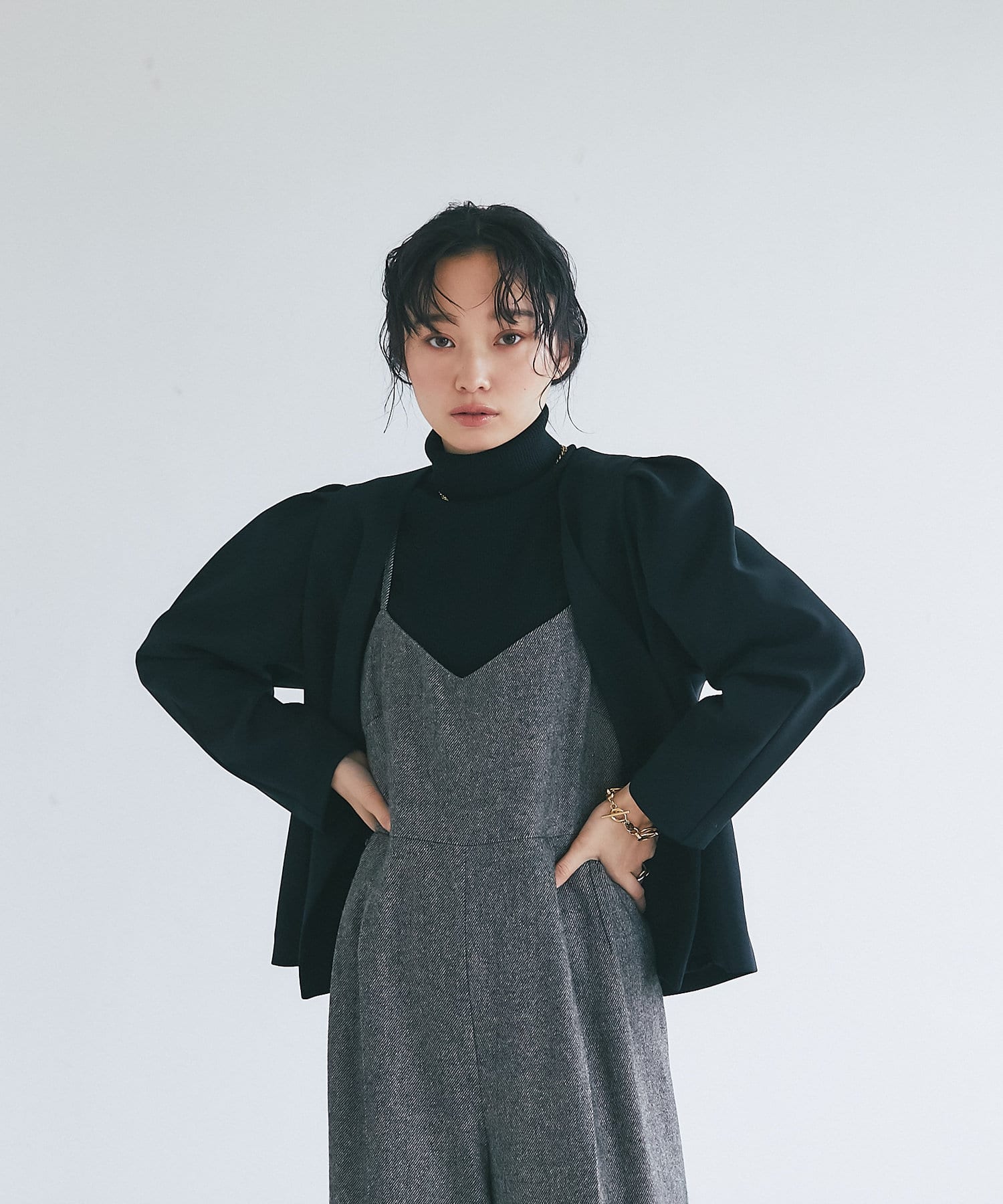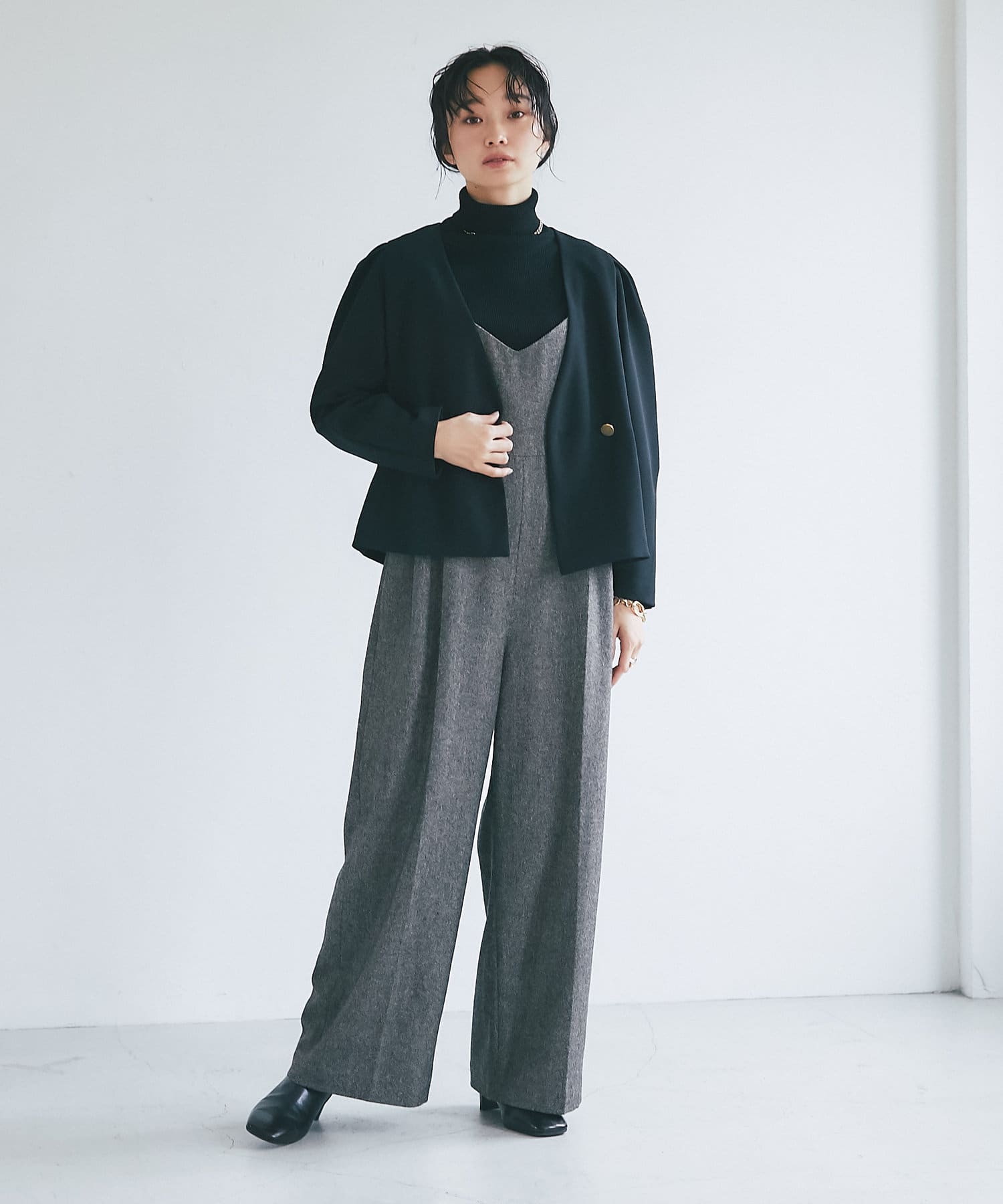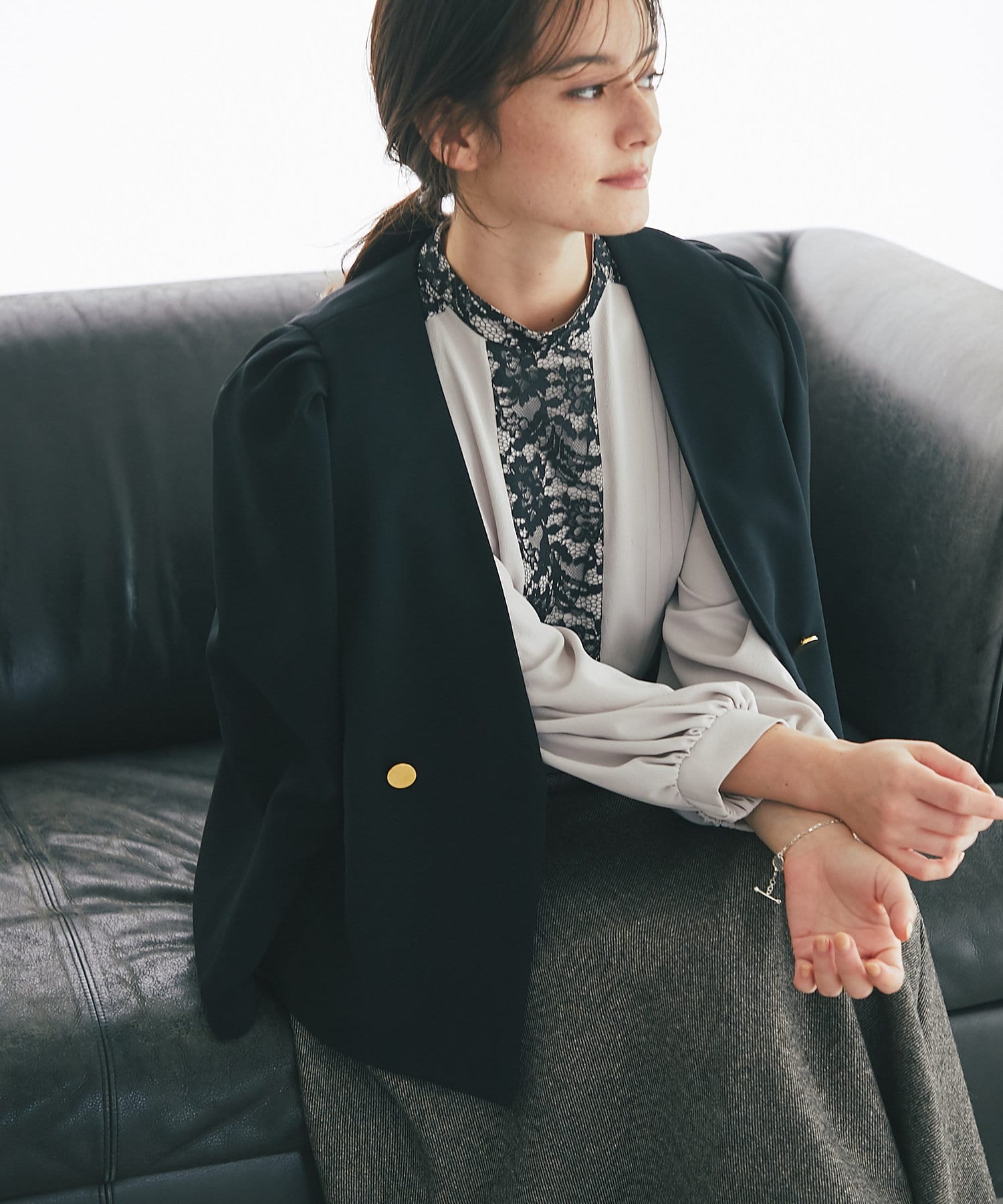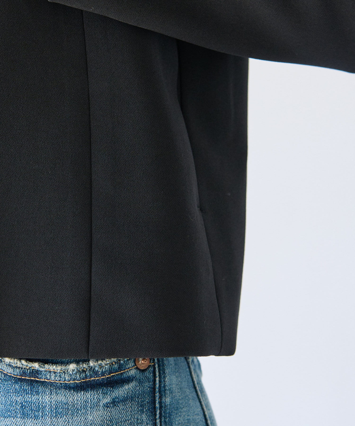 パワショル仕様が珍しいジャケットはクロップド丈でボトムスを選ばないシルエット。