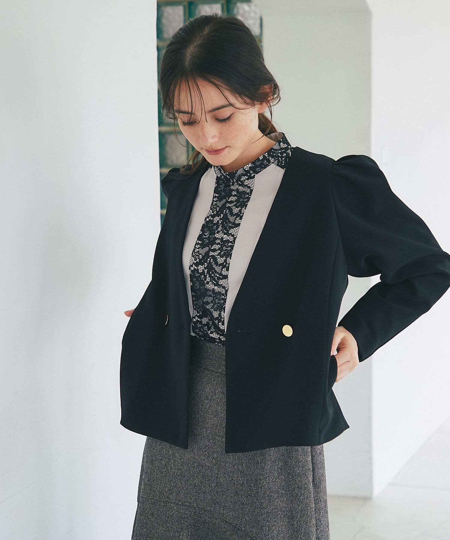 ジャケットにはあまりない、パワショルデザインも女性らしさを引き立てるポイントになっており、周りに差をつけられる一枚です。