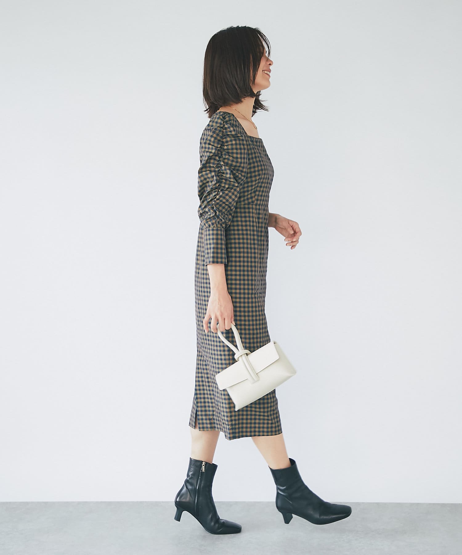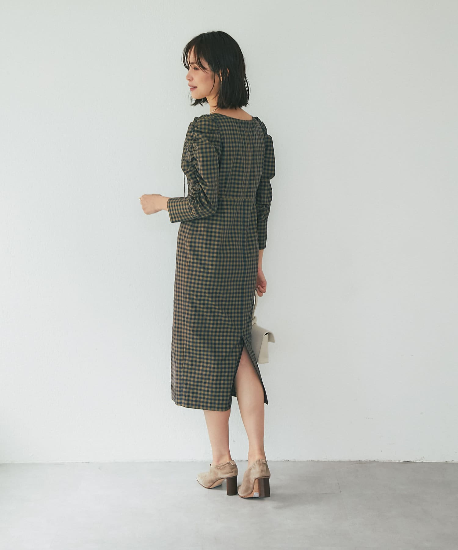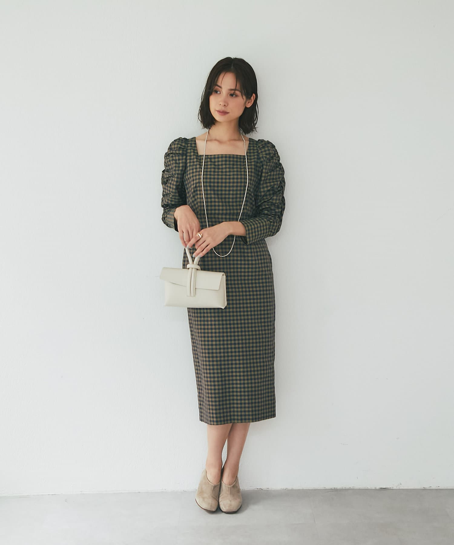 【大人の色使いでシックに決まる】ギンガムチェックパワショルワンピース