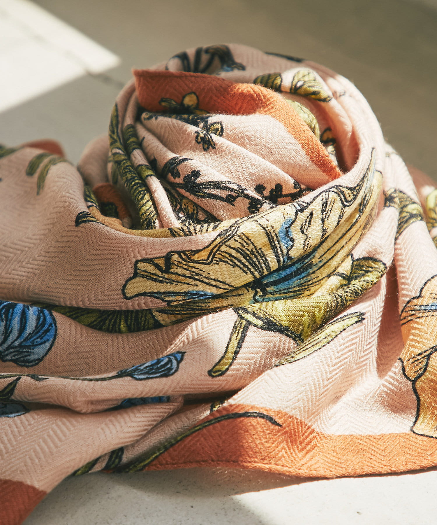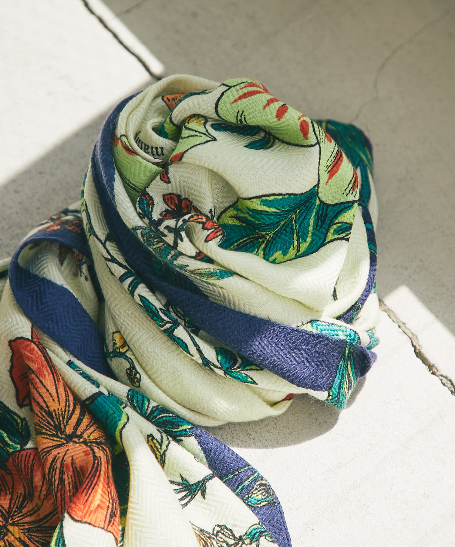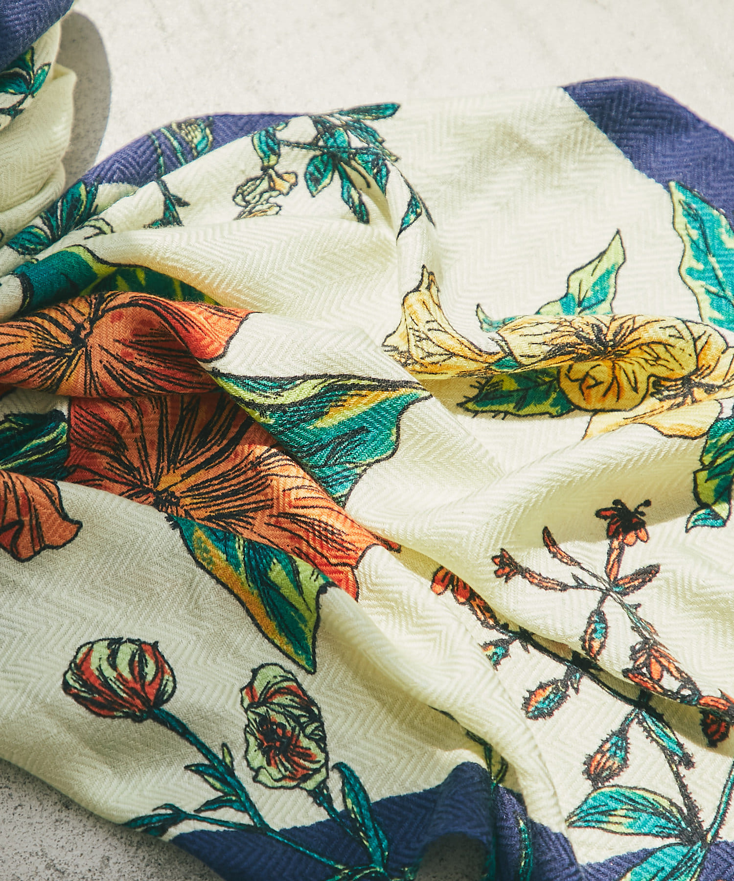 ヴィンテージスカーフからインスピレーションを得てつくられるスカーフやストールは、全て熟練の職人により一版ずつ手作業で丁寧に染め上げる手捺染(ハンドプリント)で作られています。