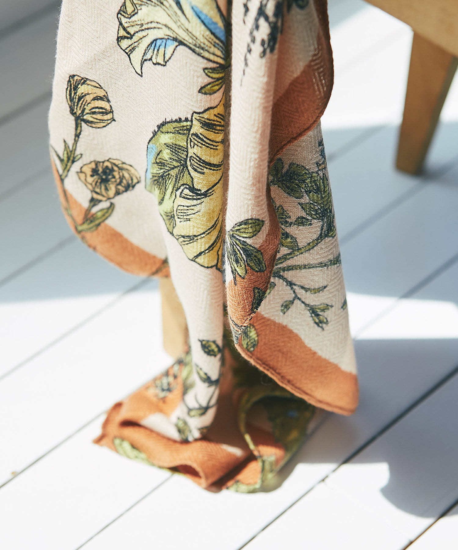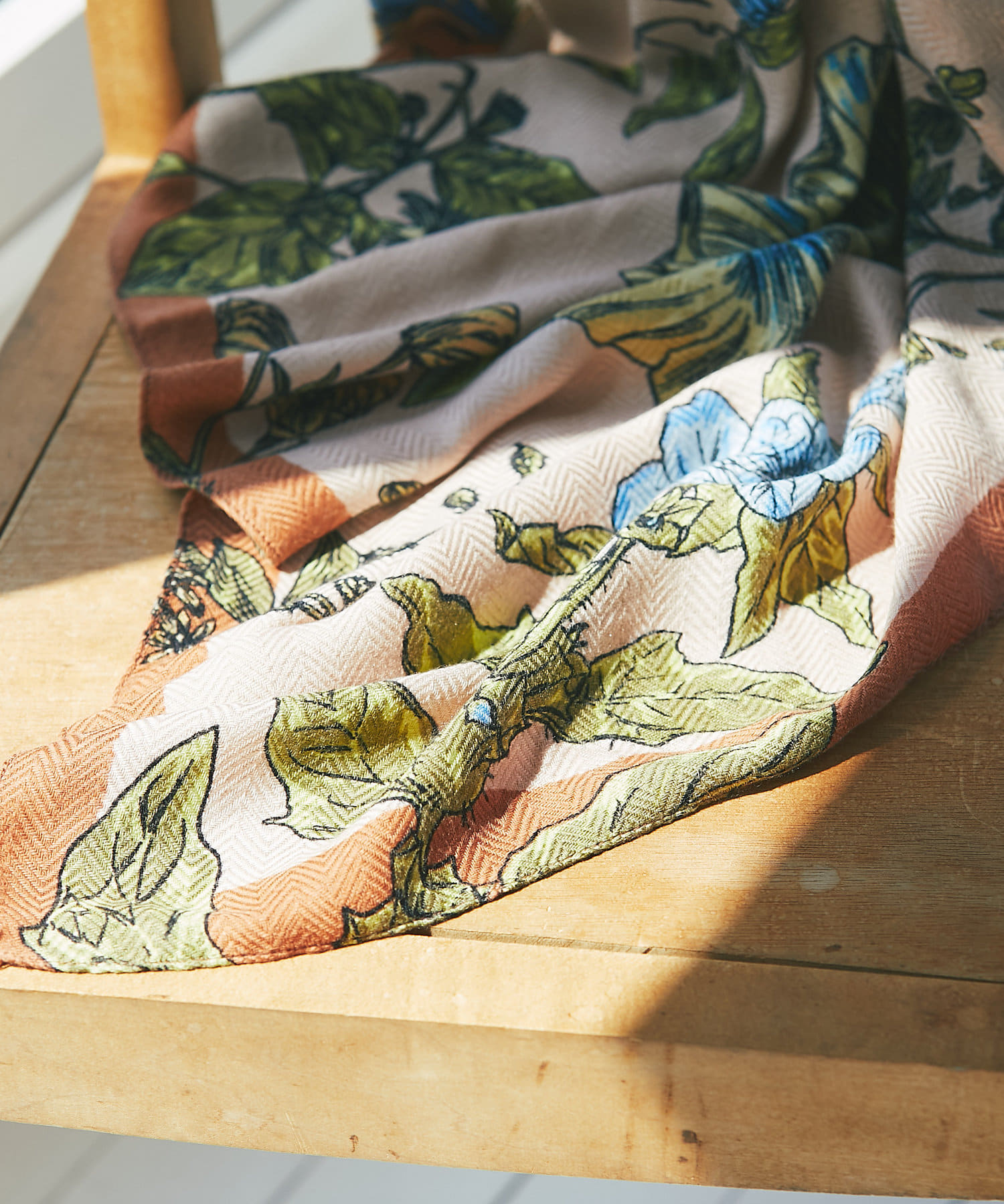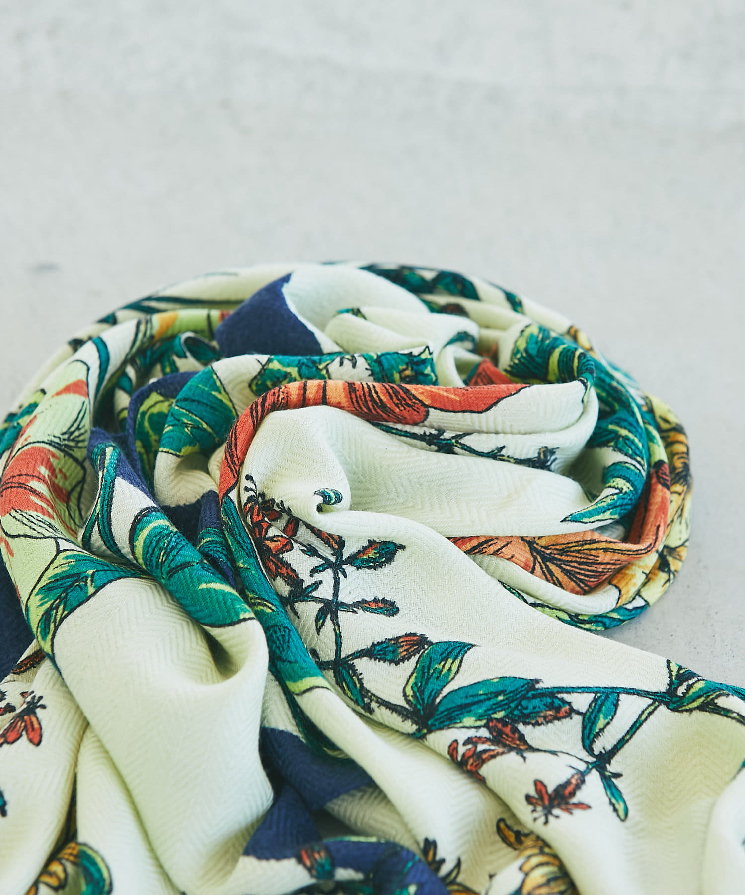 ヴィンテージスカーフからインスピレーションを得てつくられるスカーフやストールは、全て熟練の職人により一版ずつ手作業で丁寧に染め上げる手捺染(ハンドプリント)で作られています。