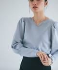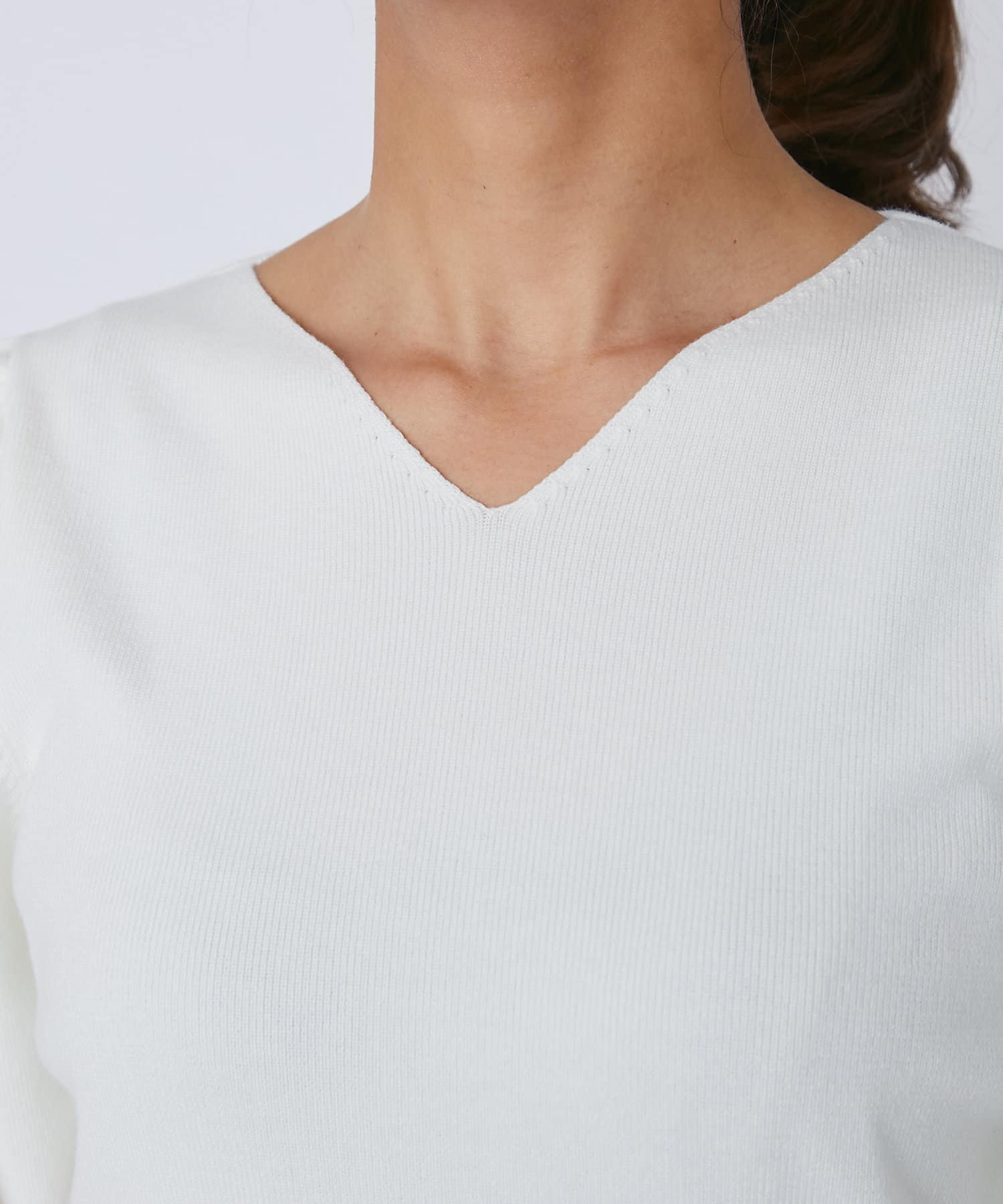 程よい開きでデコルテラインを美しく演出してくれるので、一枚で女性らしい着こなしが叶います。