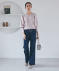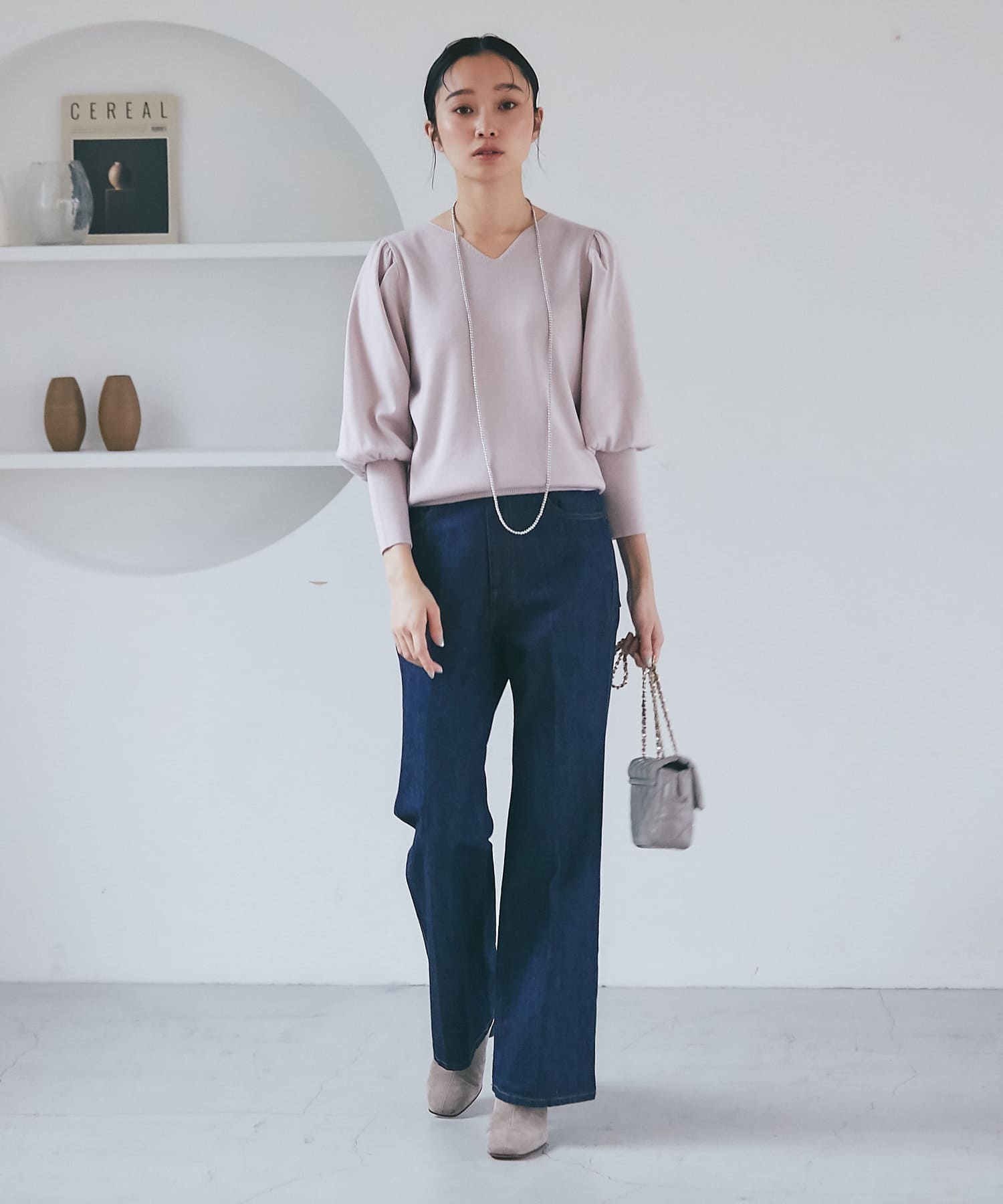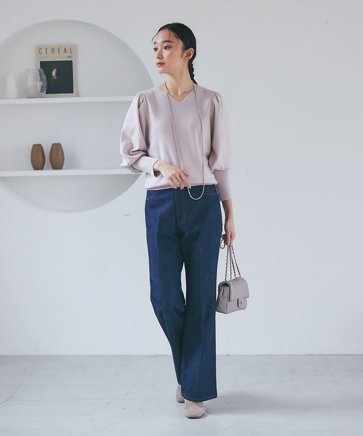 デニムパンツと合わせてカジュアルダウンすると程よいバランスのレディな雰囲気に。