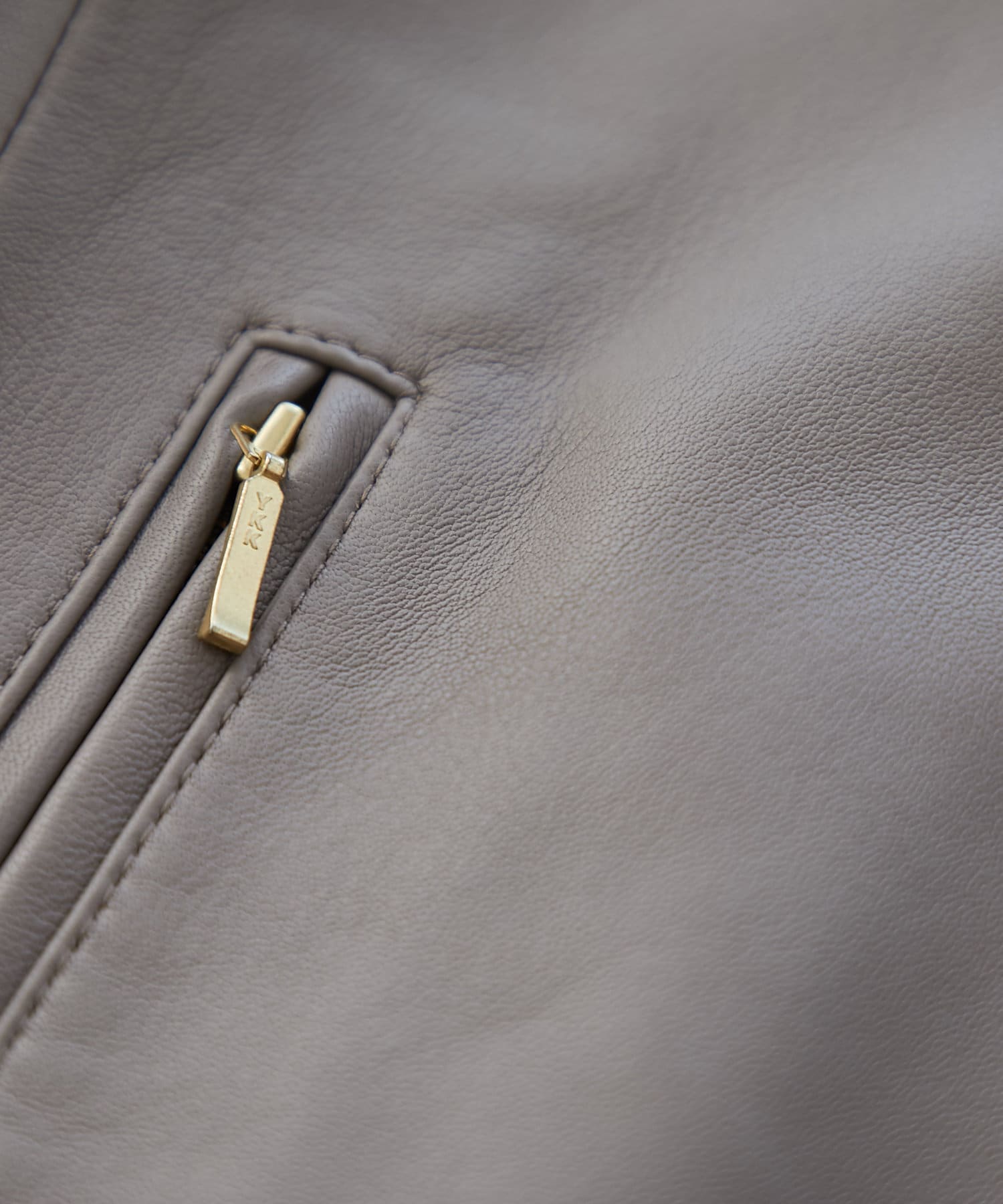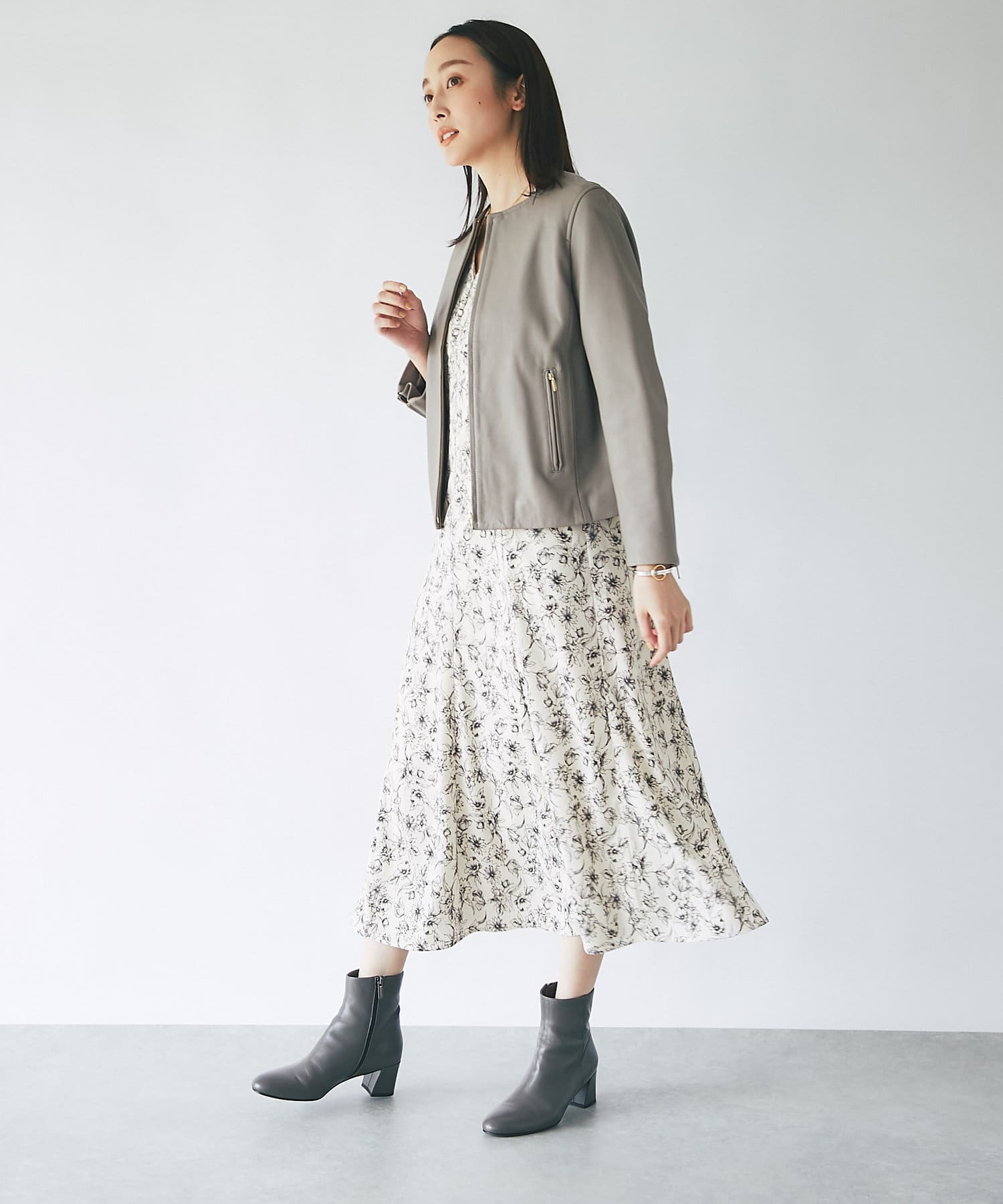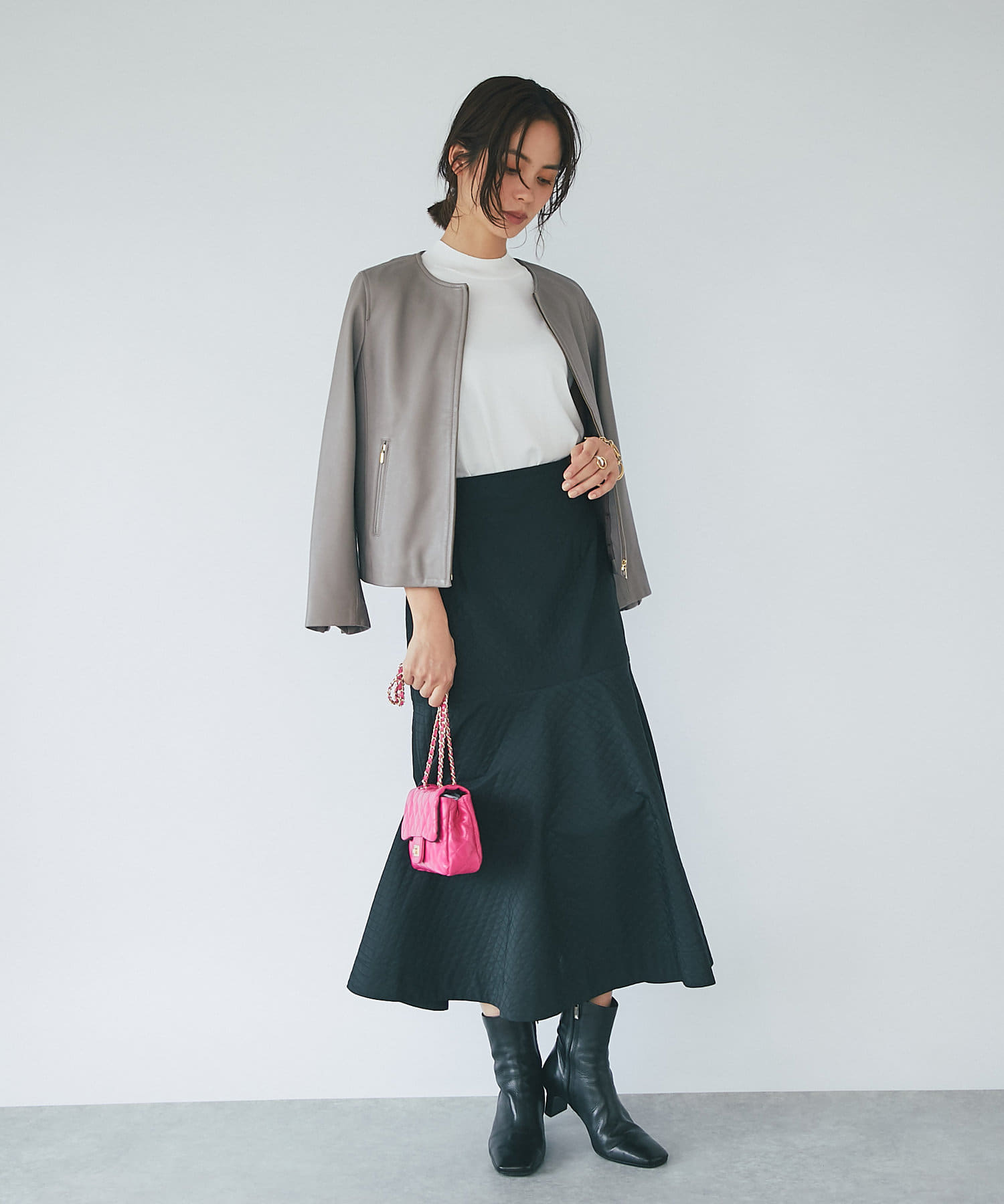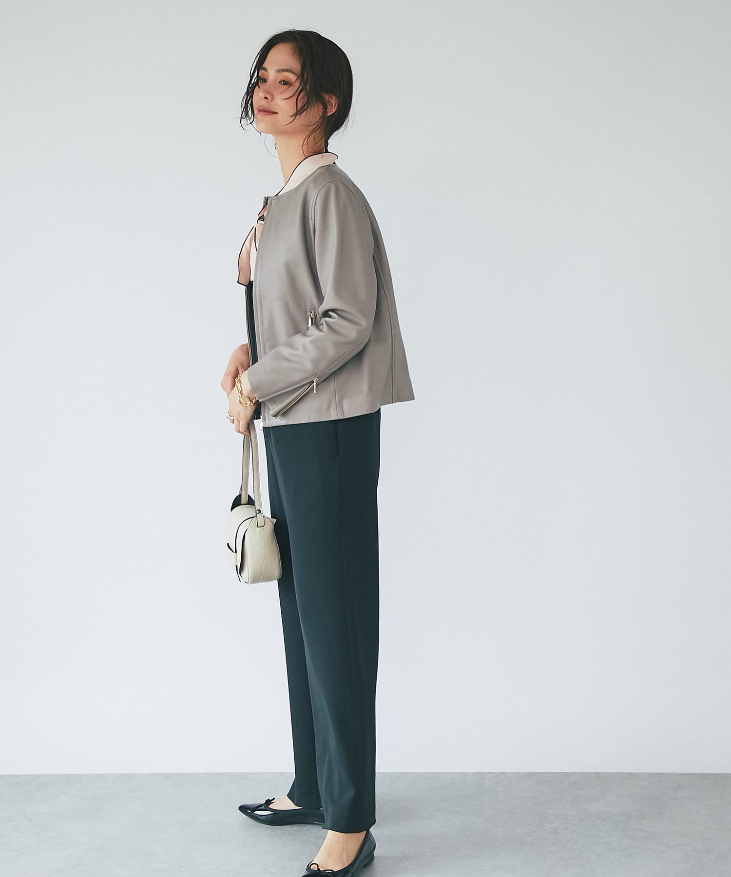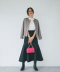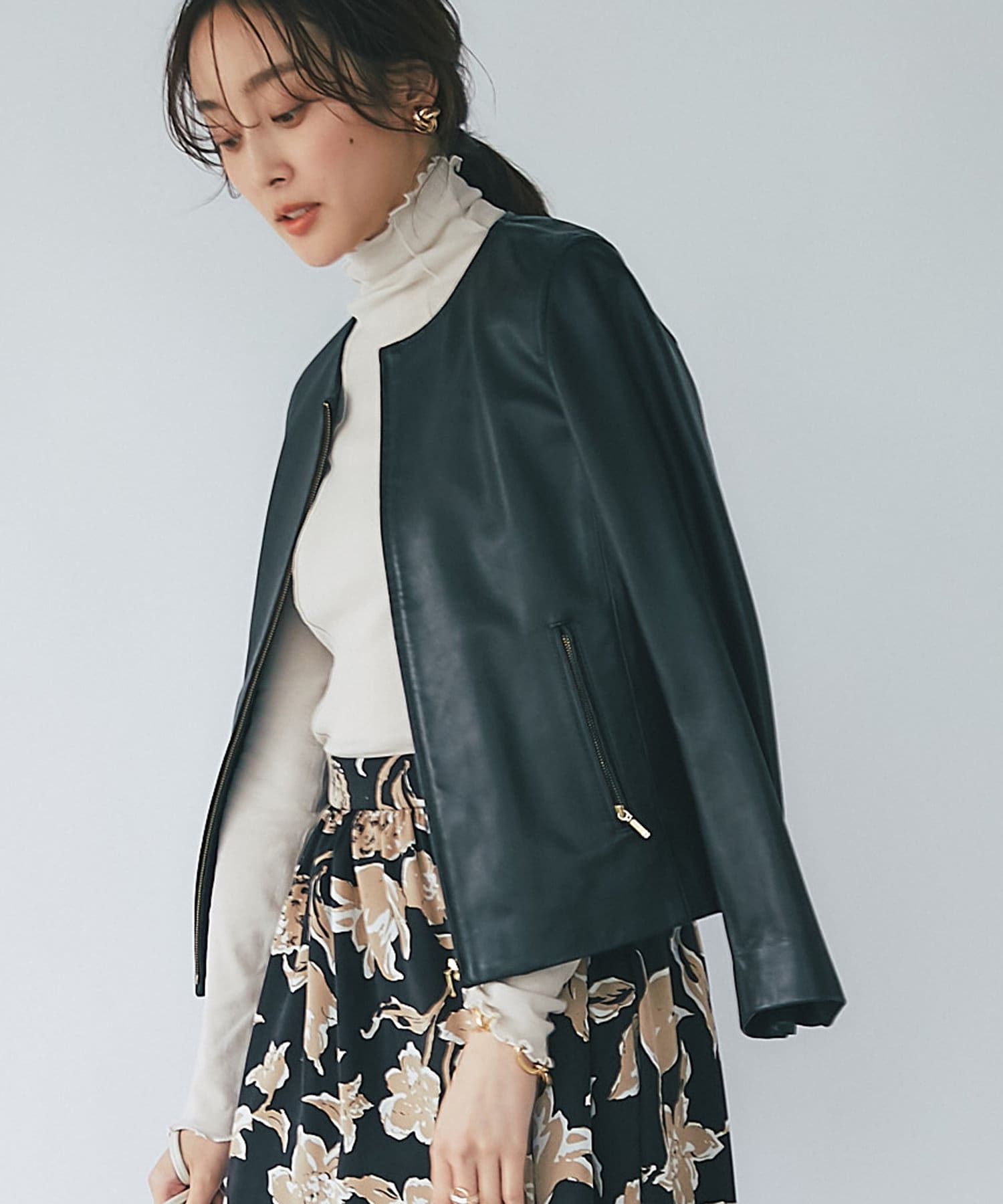 ハードな印象のあるレザージャケットですが、コンパクトなシルエットとノーカラーで女性らしく着られる一枚。