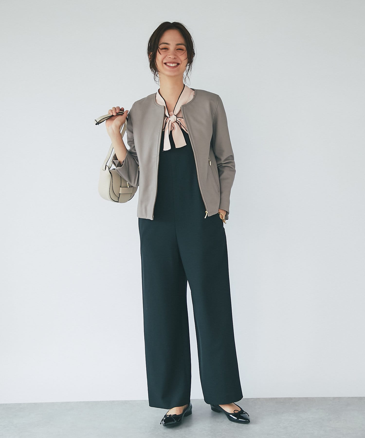 すっきり見えるサイズ感なので、ボトムはコンパクトなものからボリュームがあるものまで様々なアイテムと好相性です。