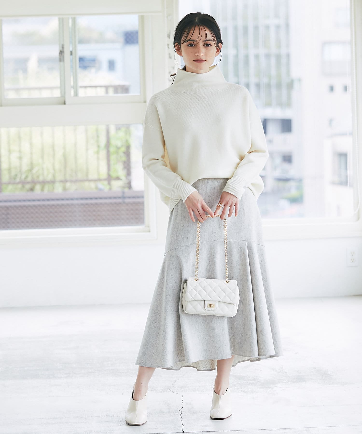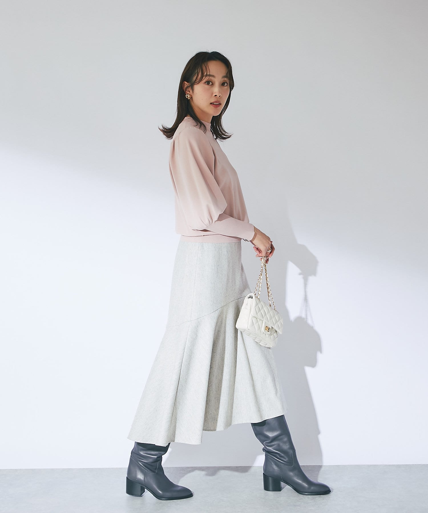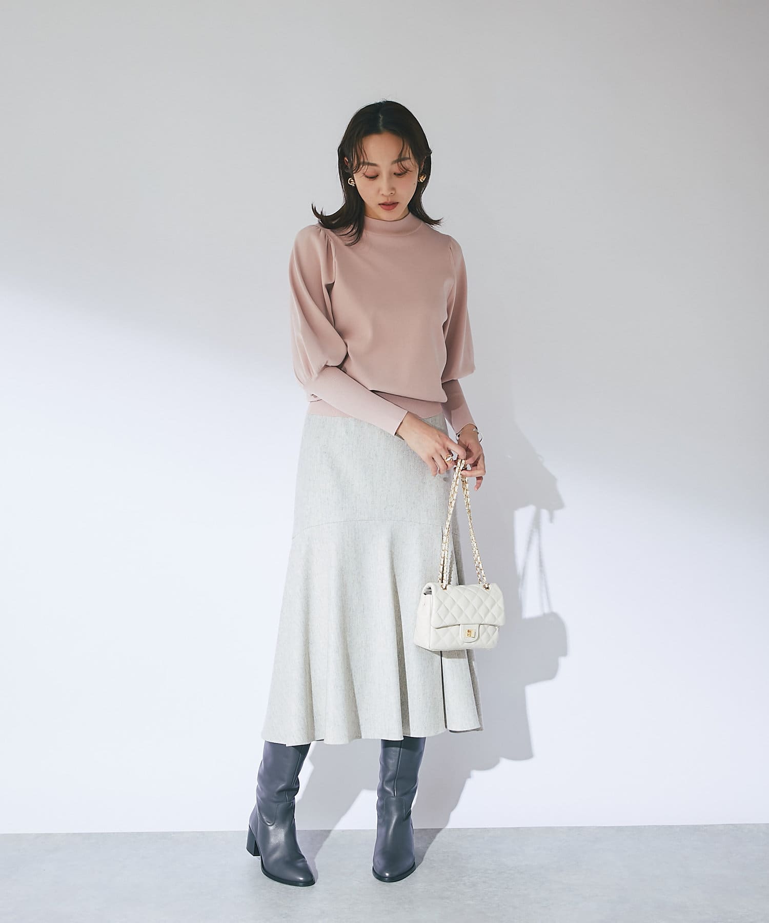 腰回りがすっきりとしているので、ゆったりとしたニットも合わせやすいです。