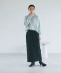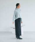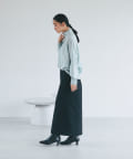 目を惹く上品なブルーにブラックのスカート合わせれば大人な雰囲気に。