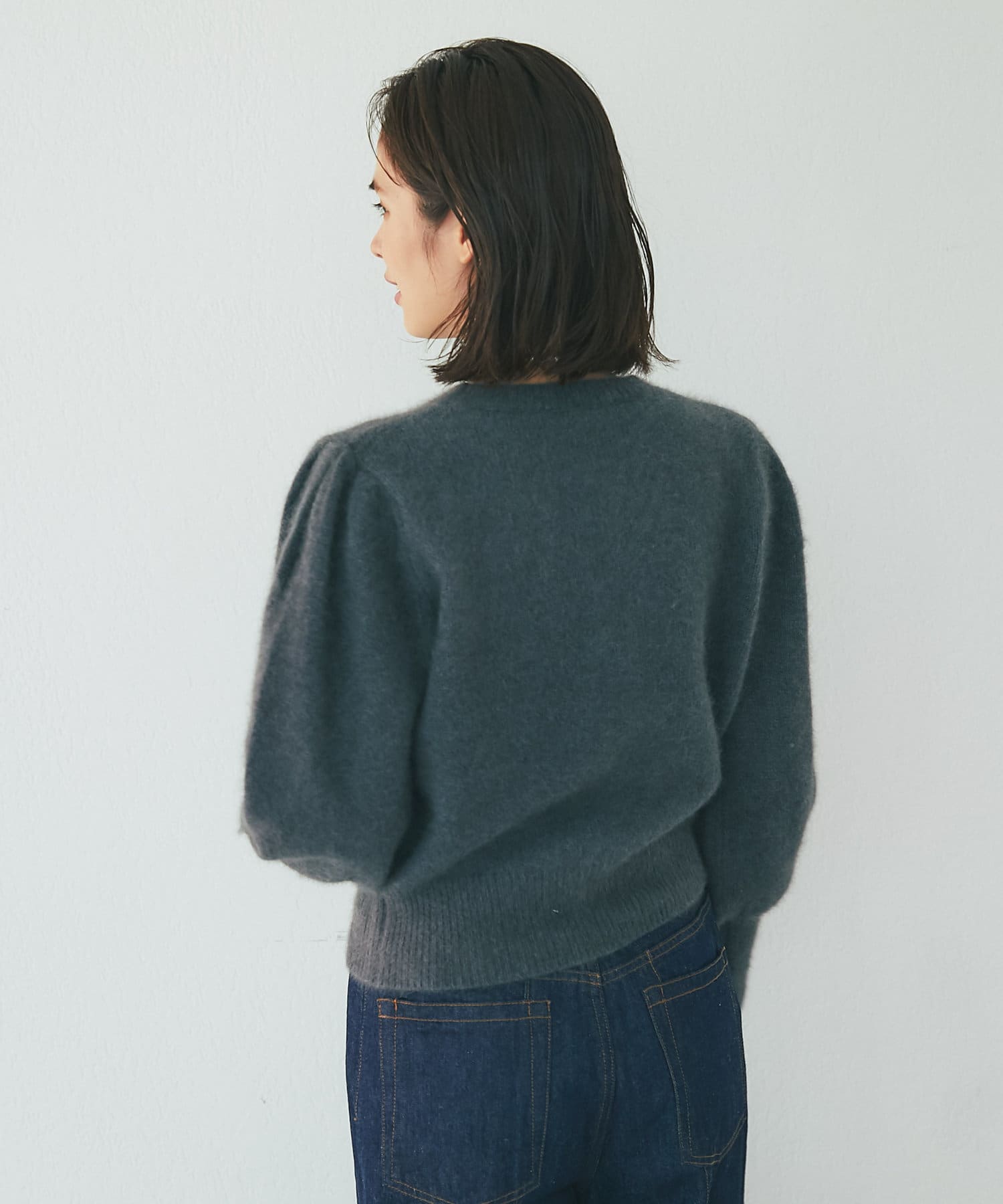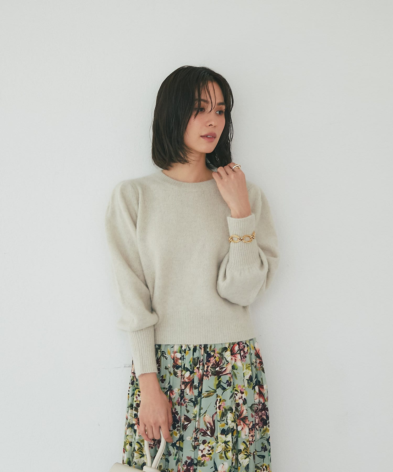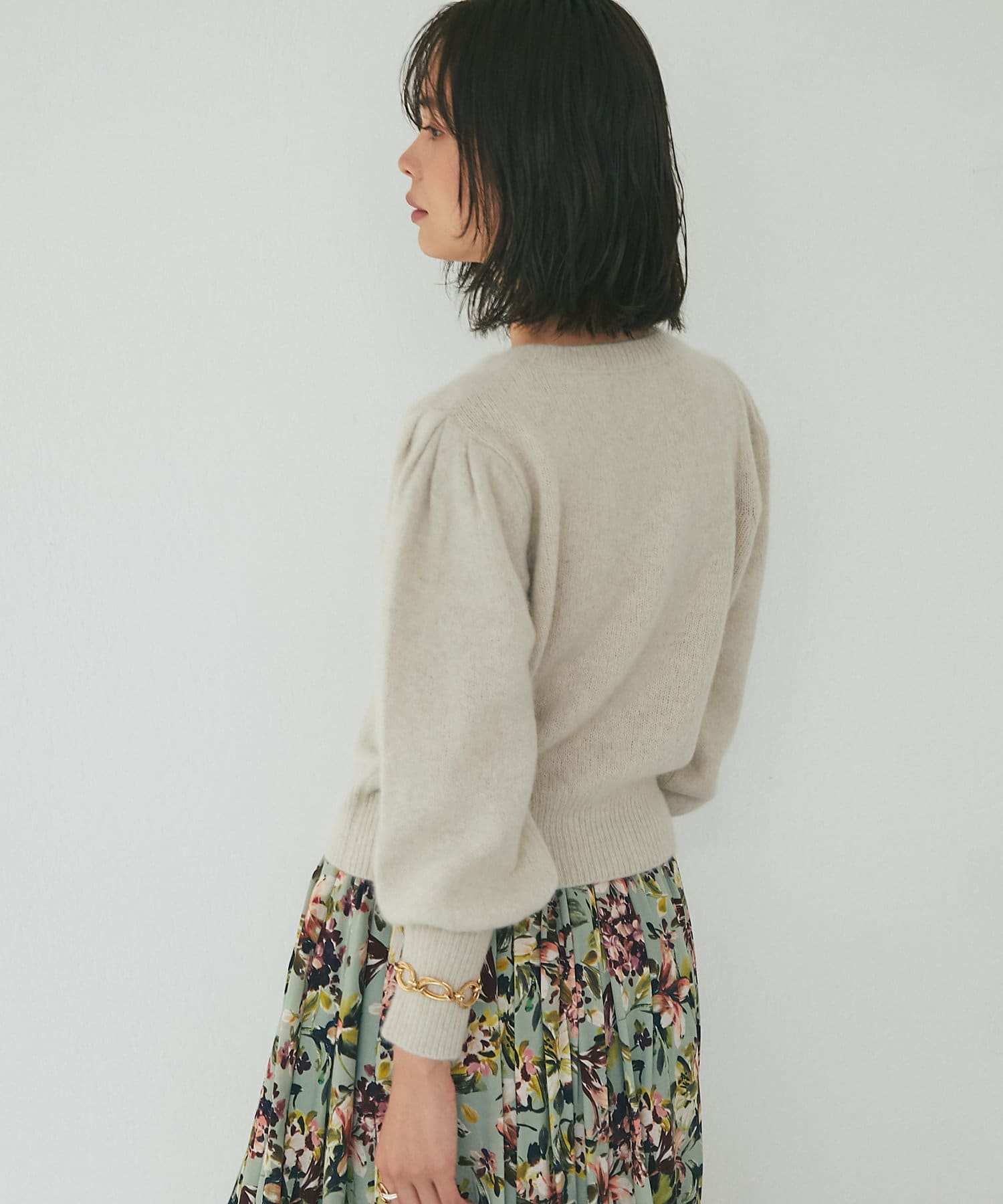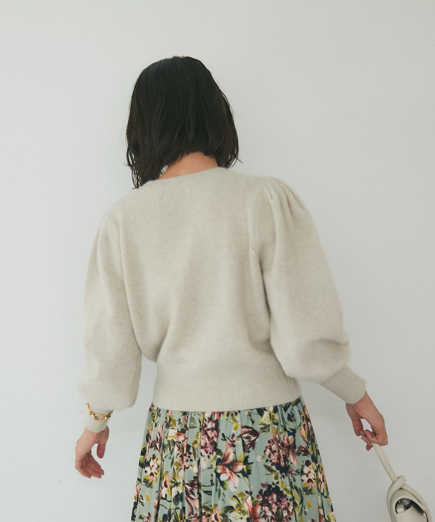 袖山にタックを入れ、袖にボリュームを持たせたボリュームスリーブニットです。