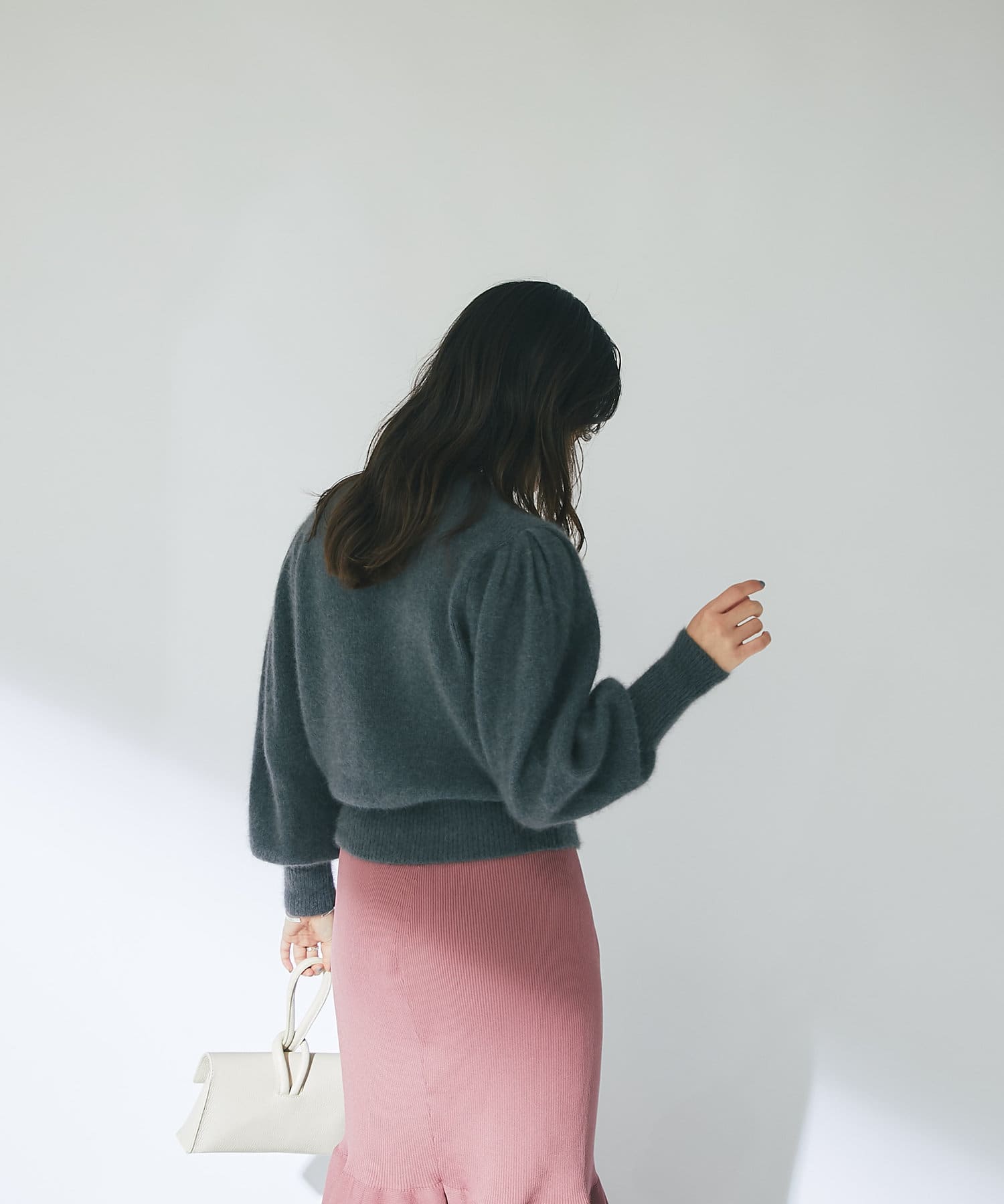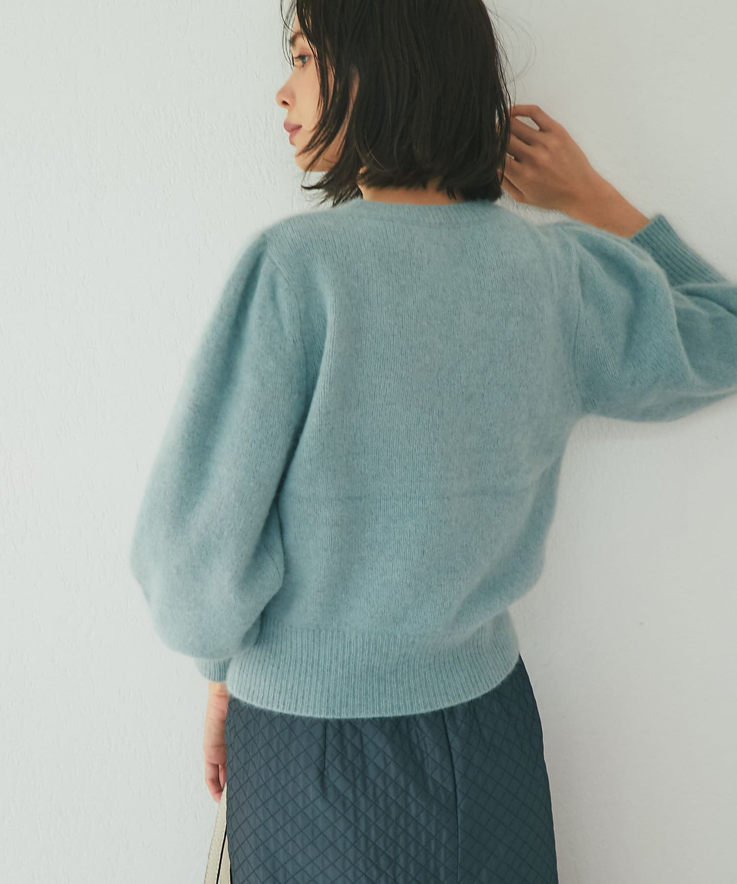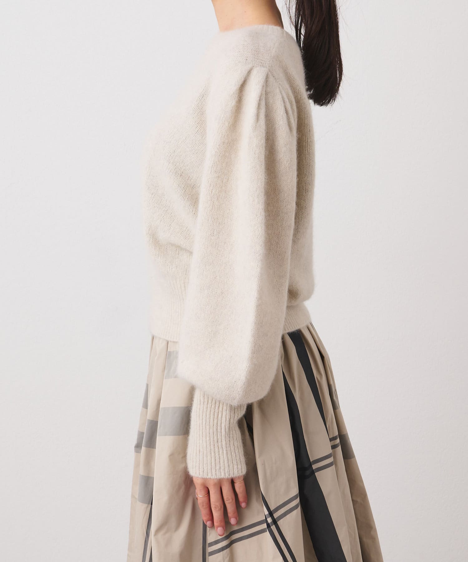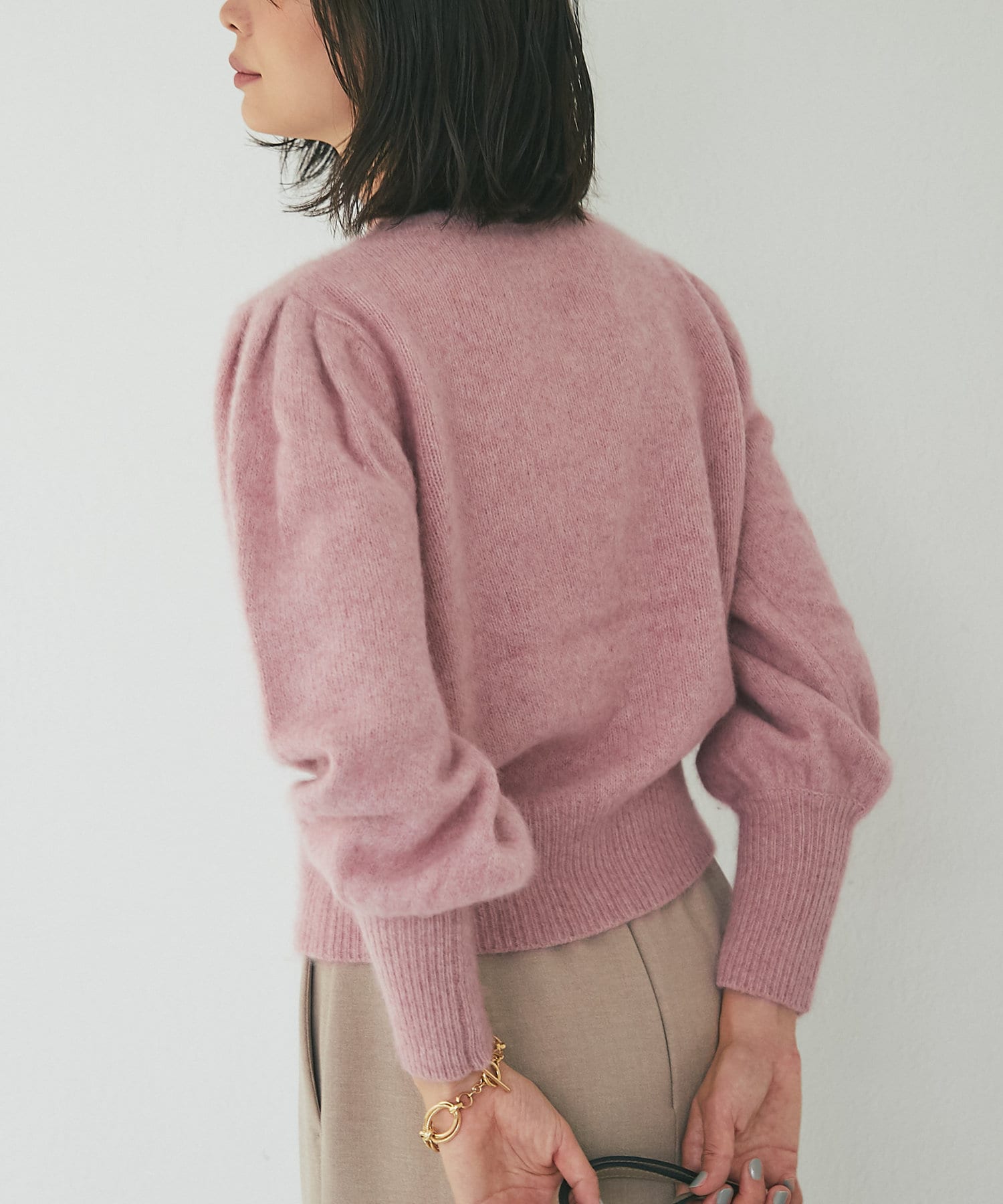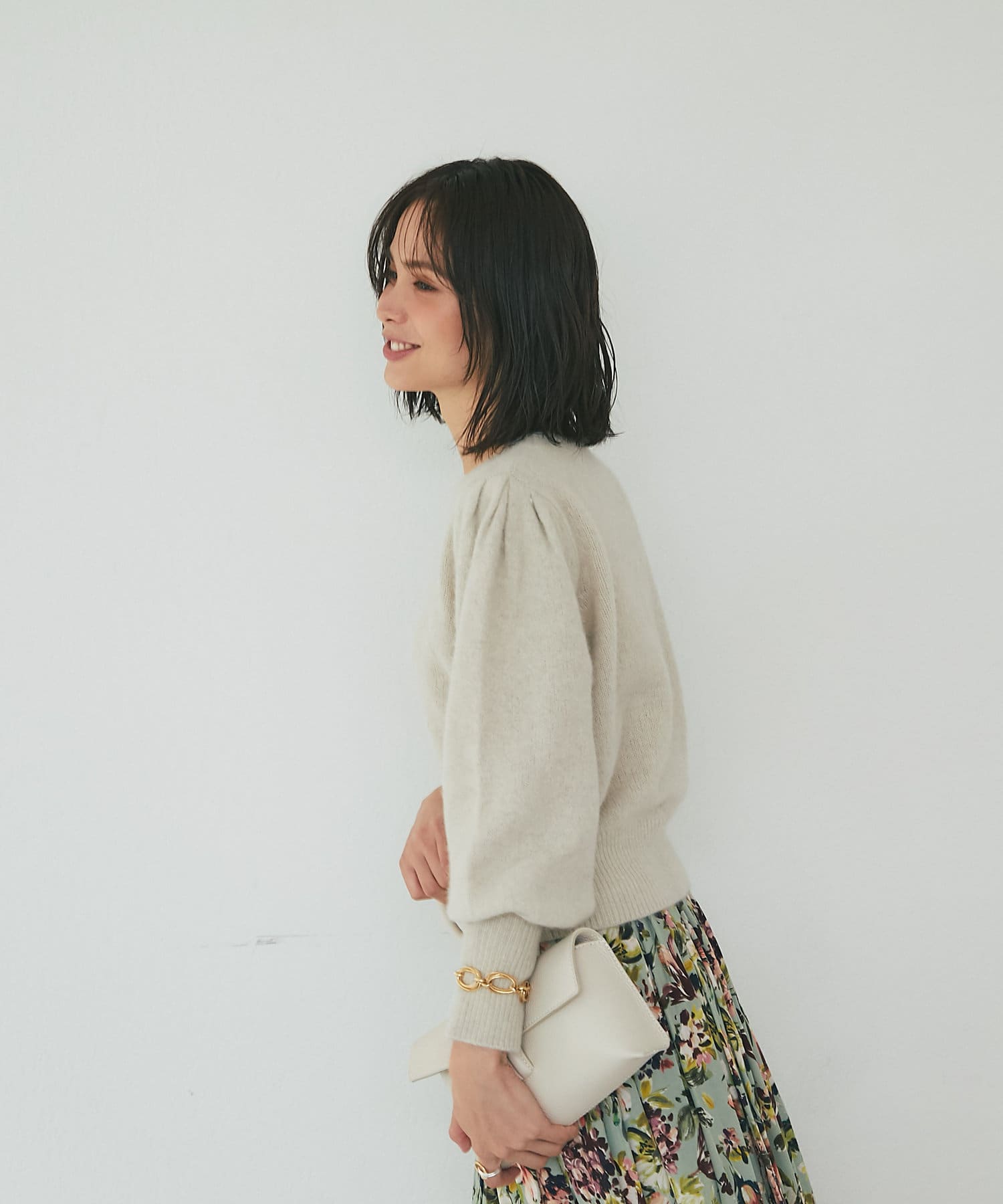 袖山にタックを入れ、袖にボリュームを持たせたボリュームスリーブニットです。