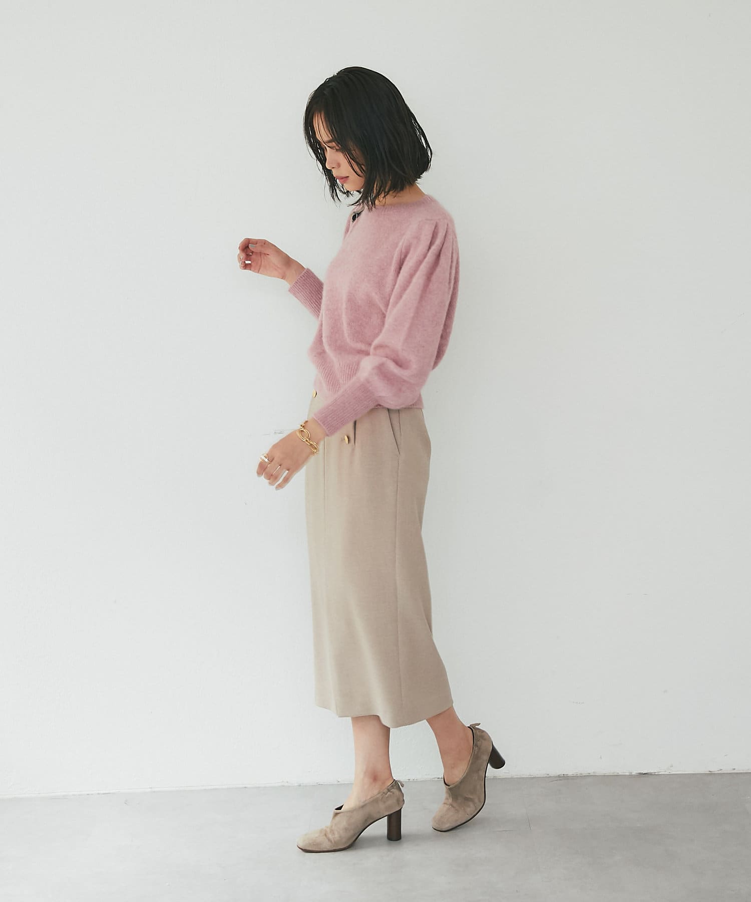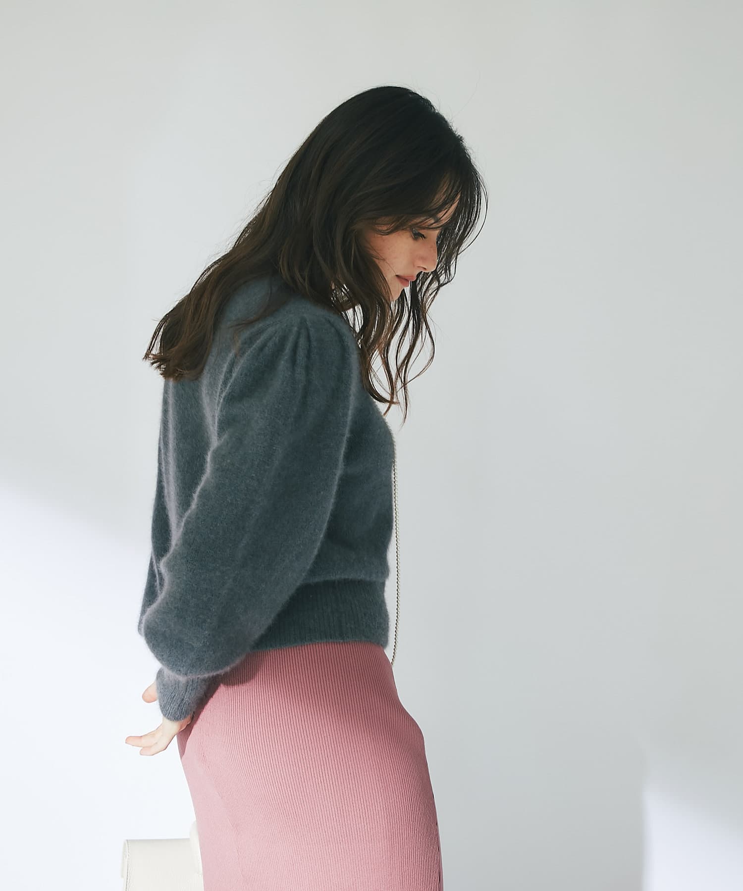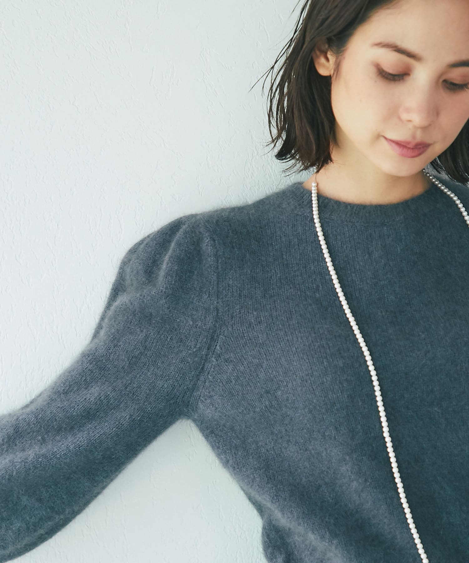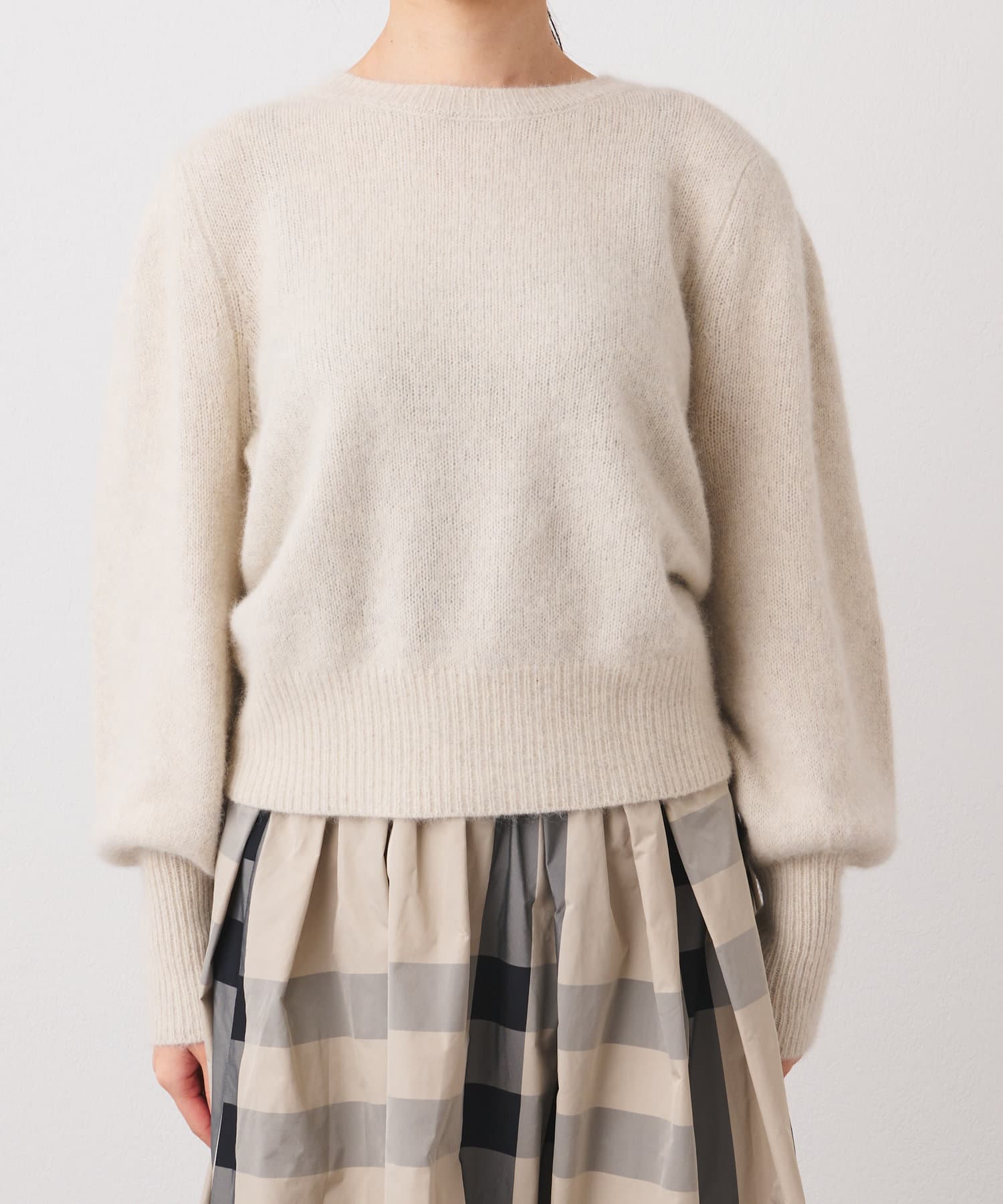 袖山にタックを入れ、袖にボリュームを持たせたボリュームスリーブニットです。