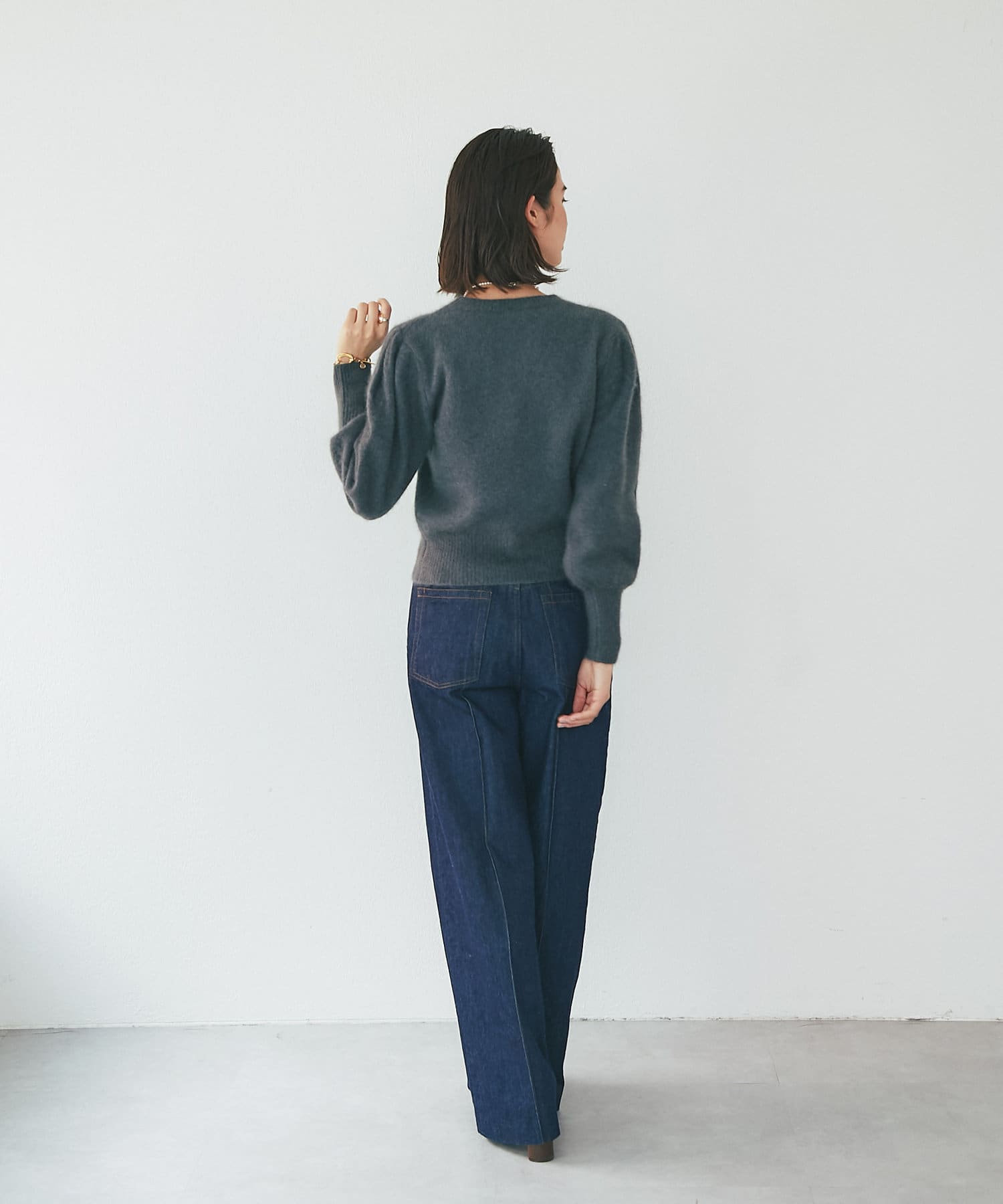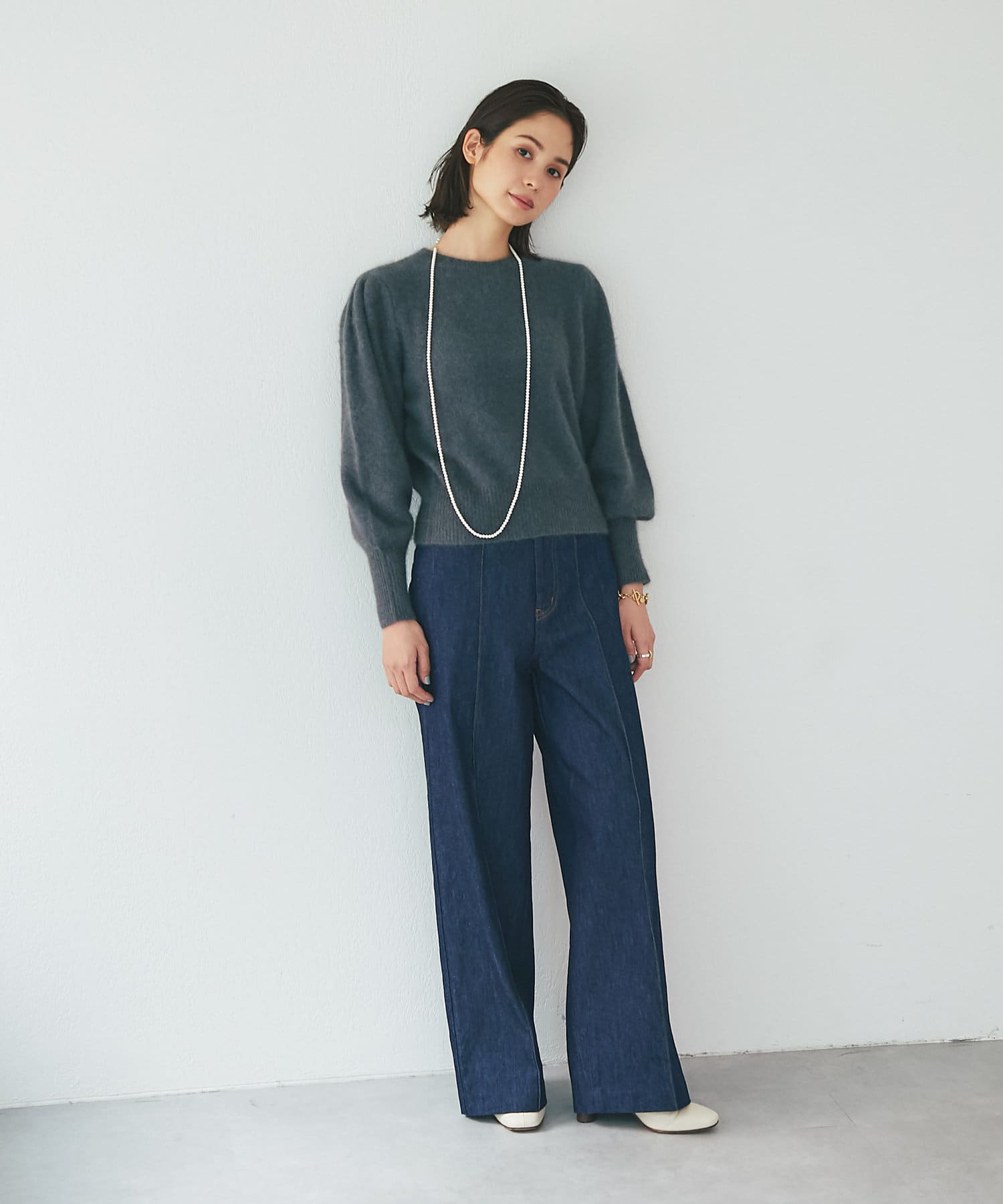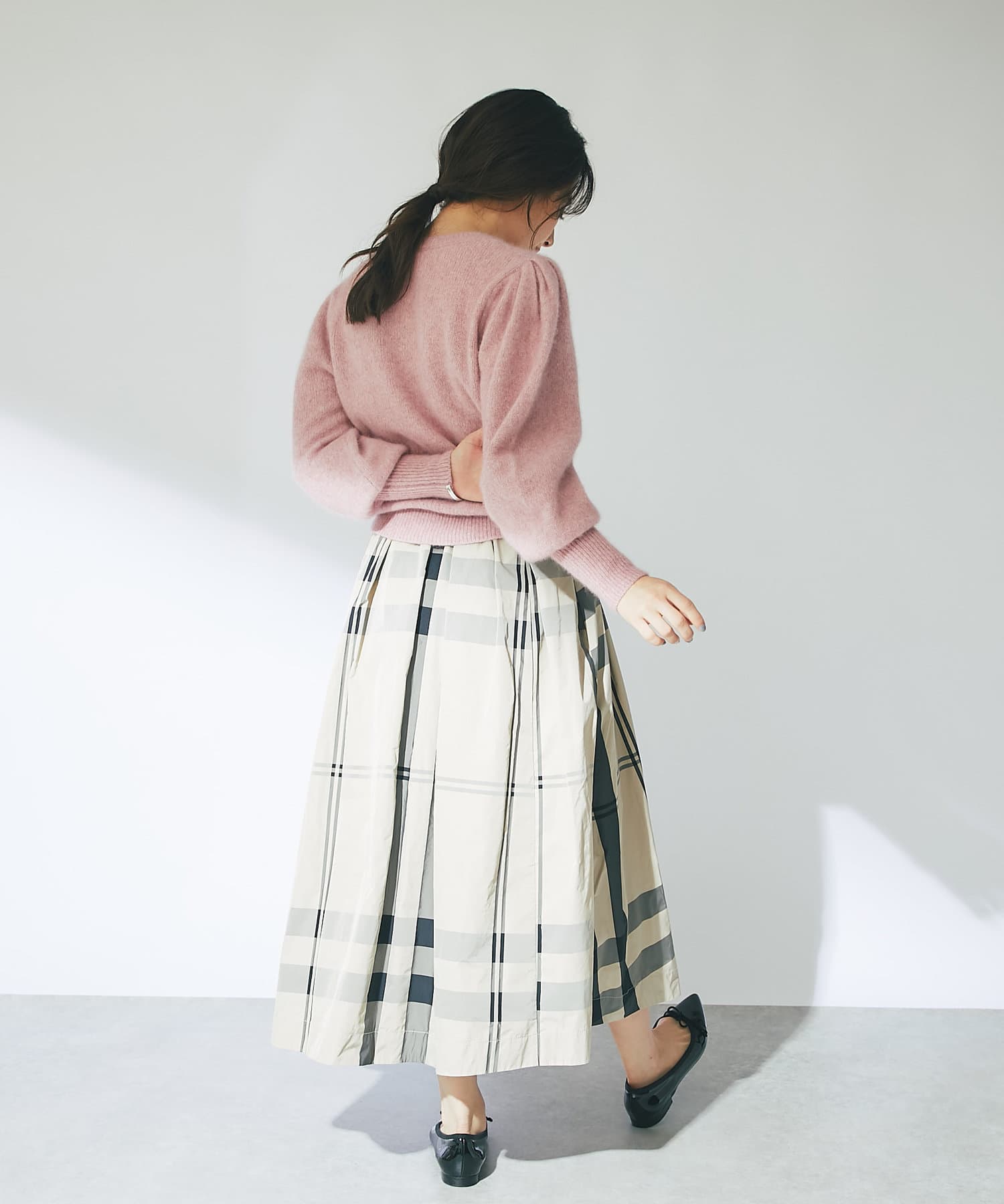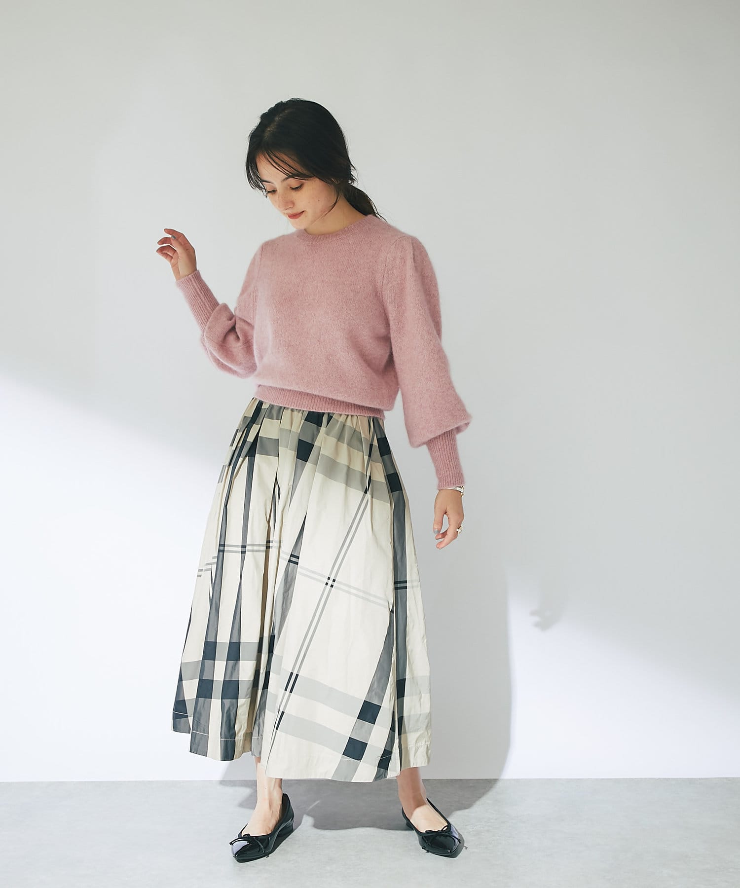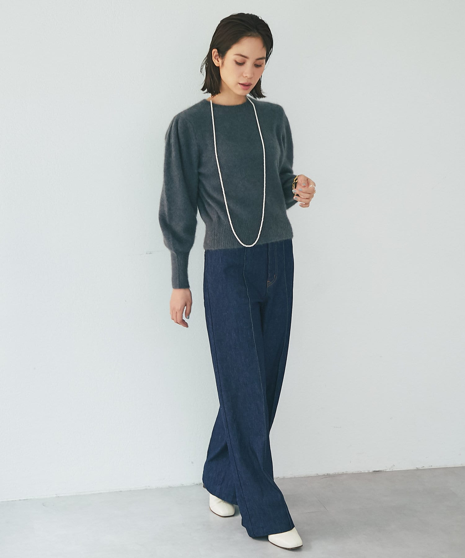 袖山にタックを入れ、袖にボリュームを持たせたボリュームスリーブニットです。