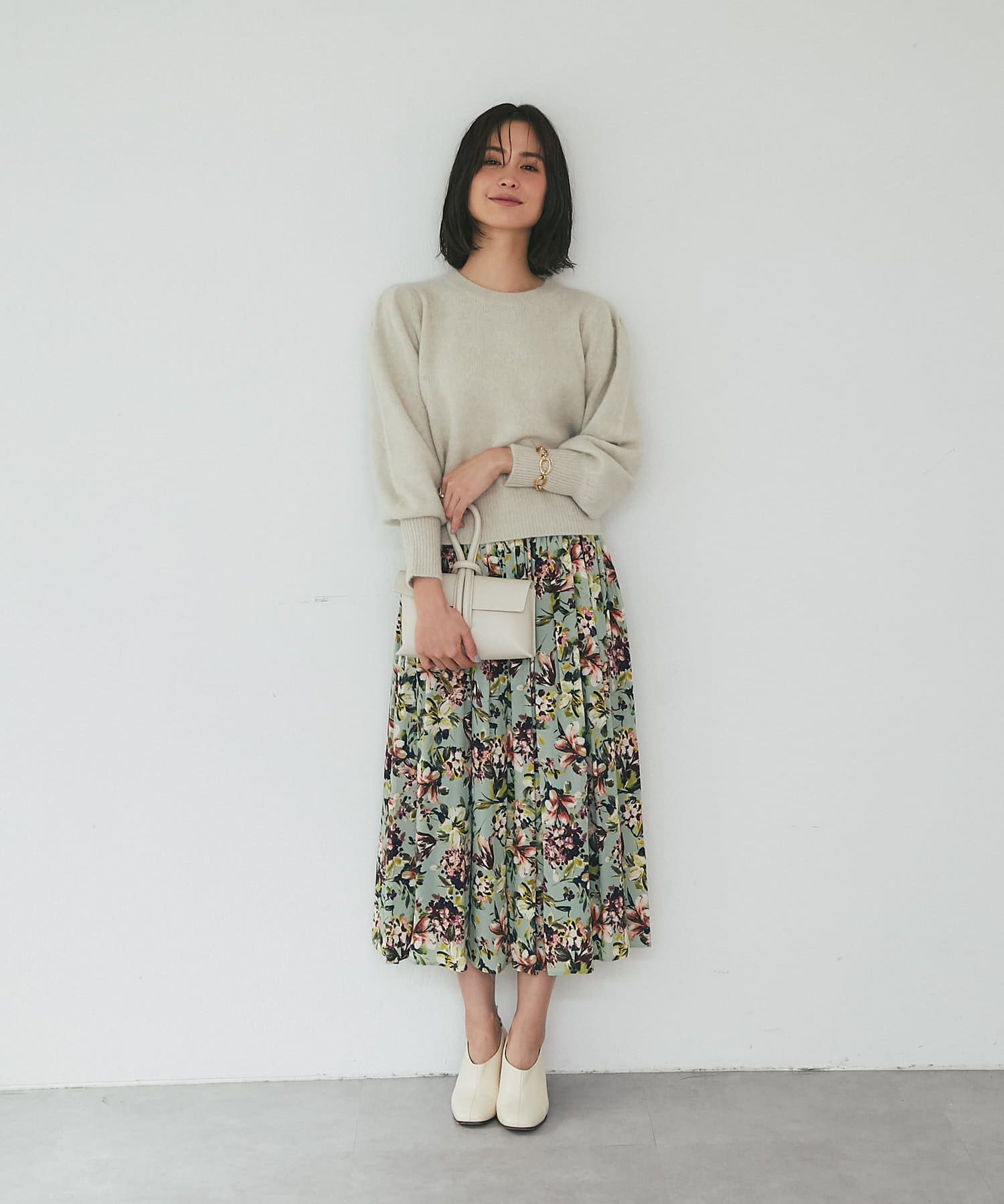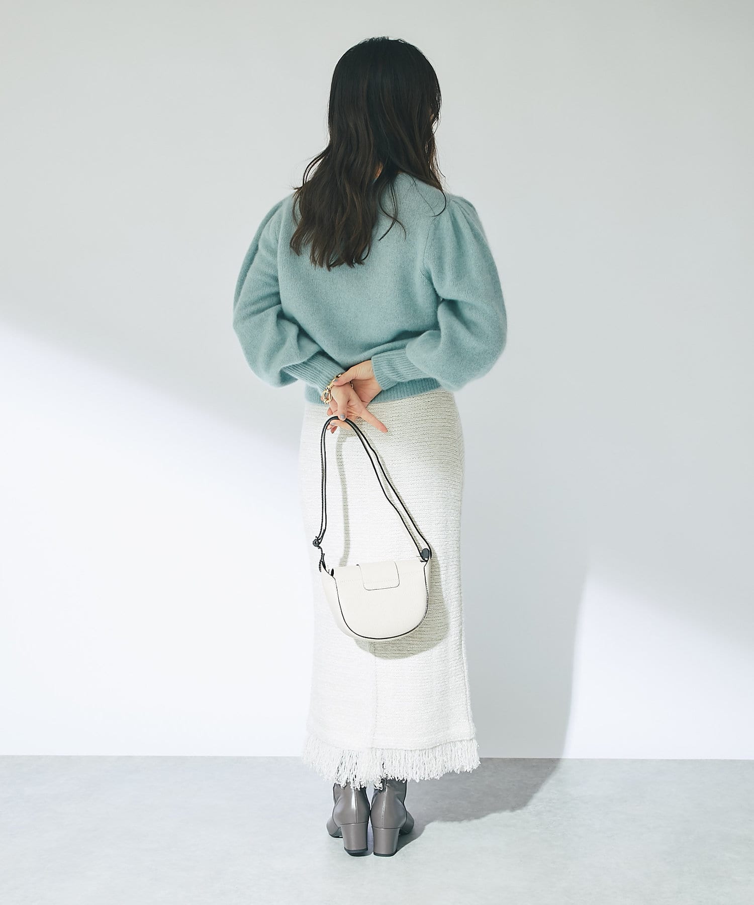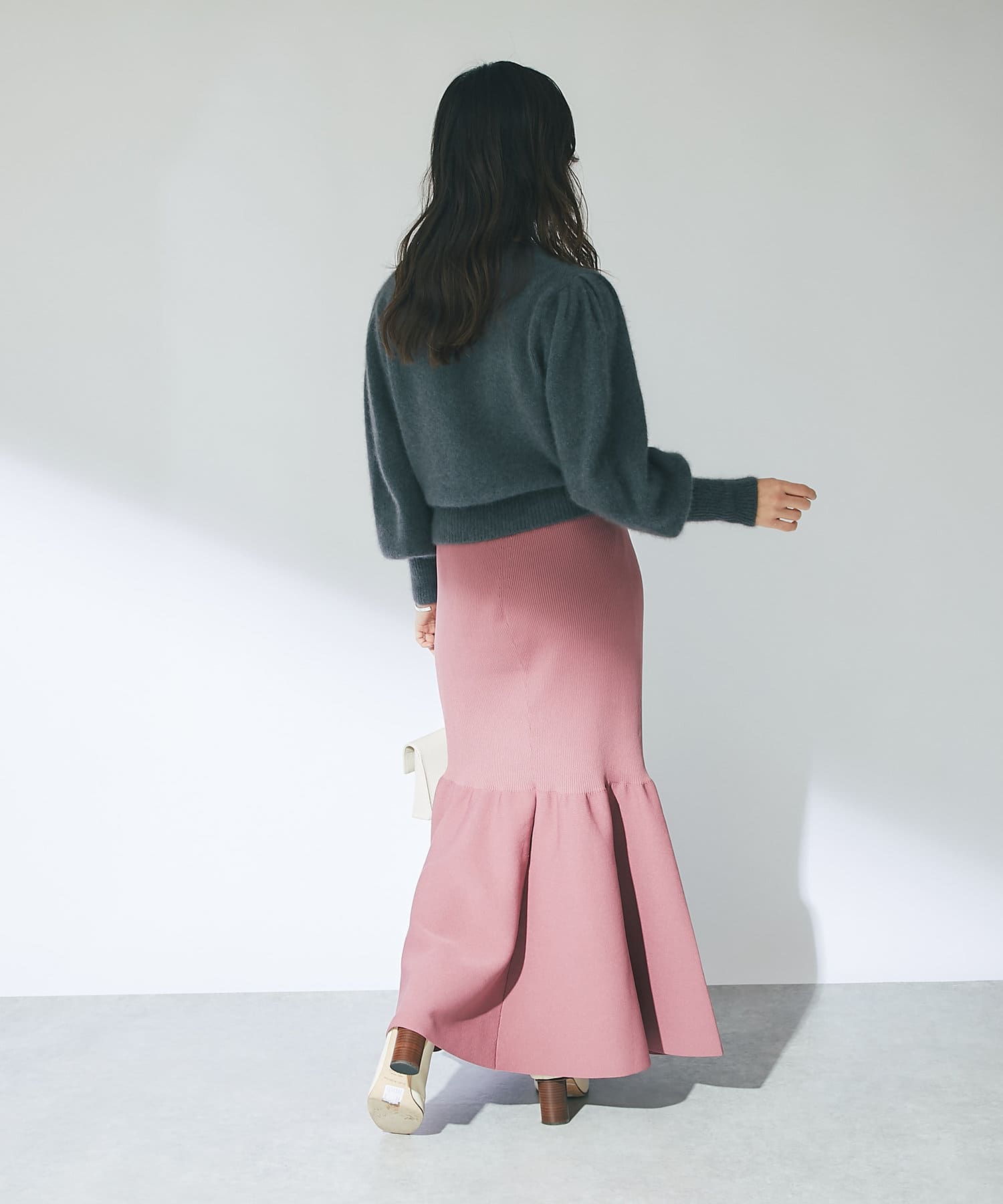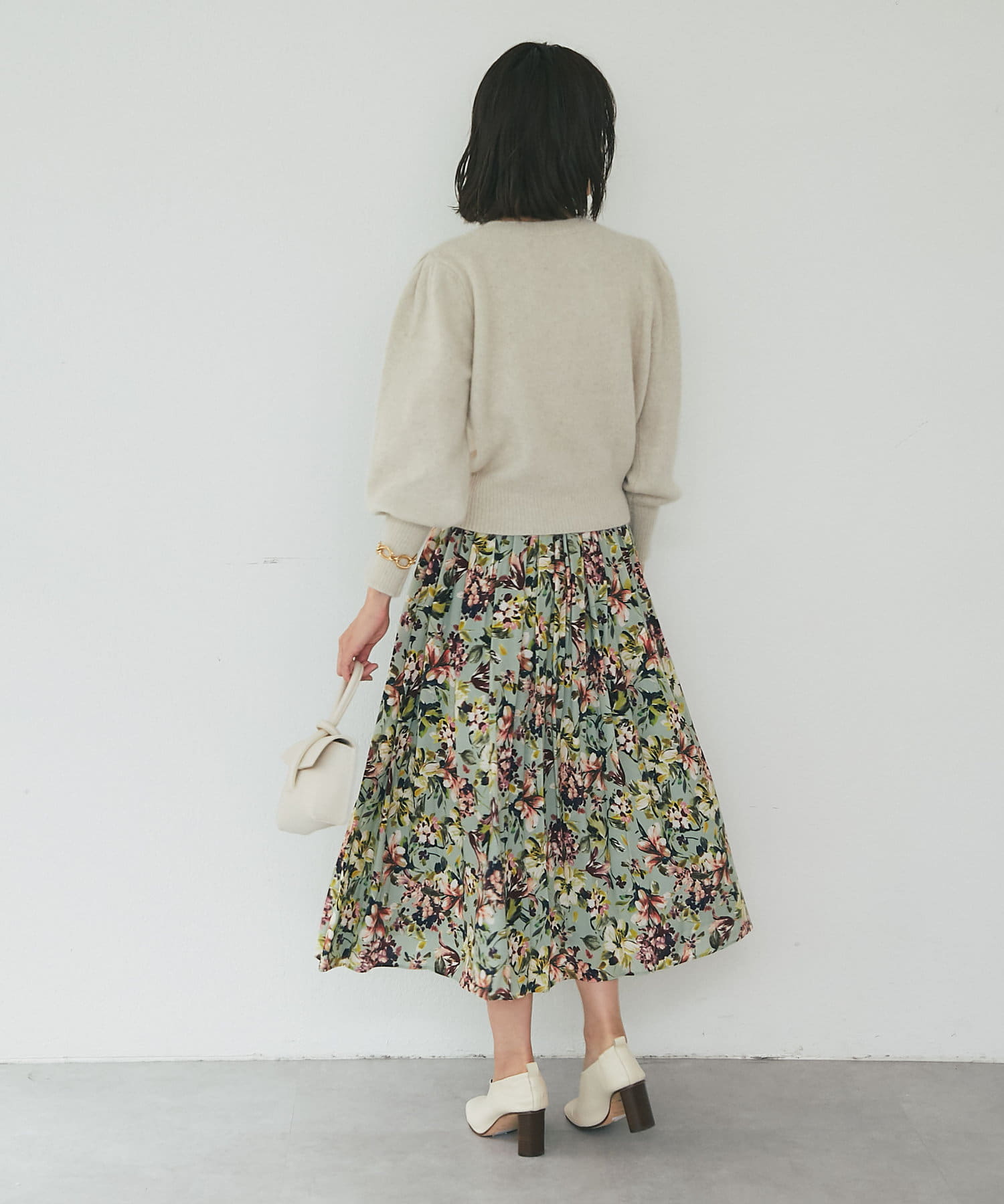 袖山にタックを入れ、袖にボリュームを持たせたボリュームスリーブニットです。