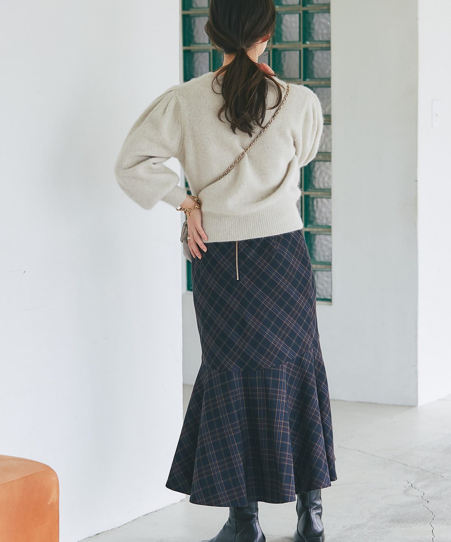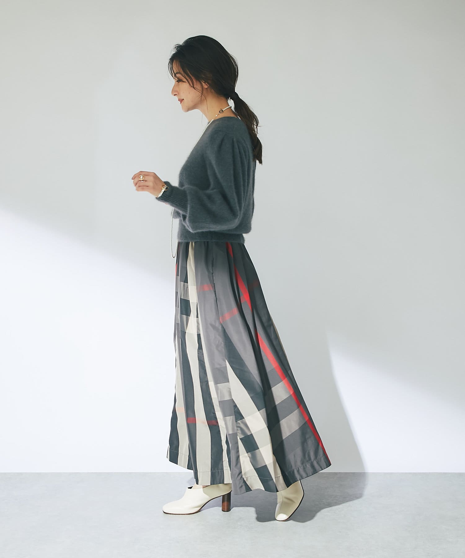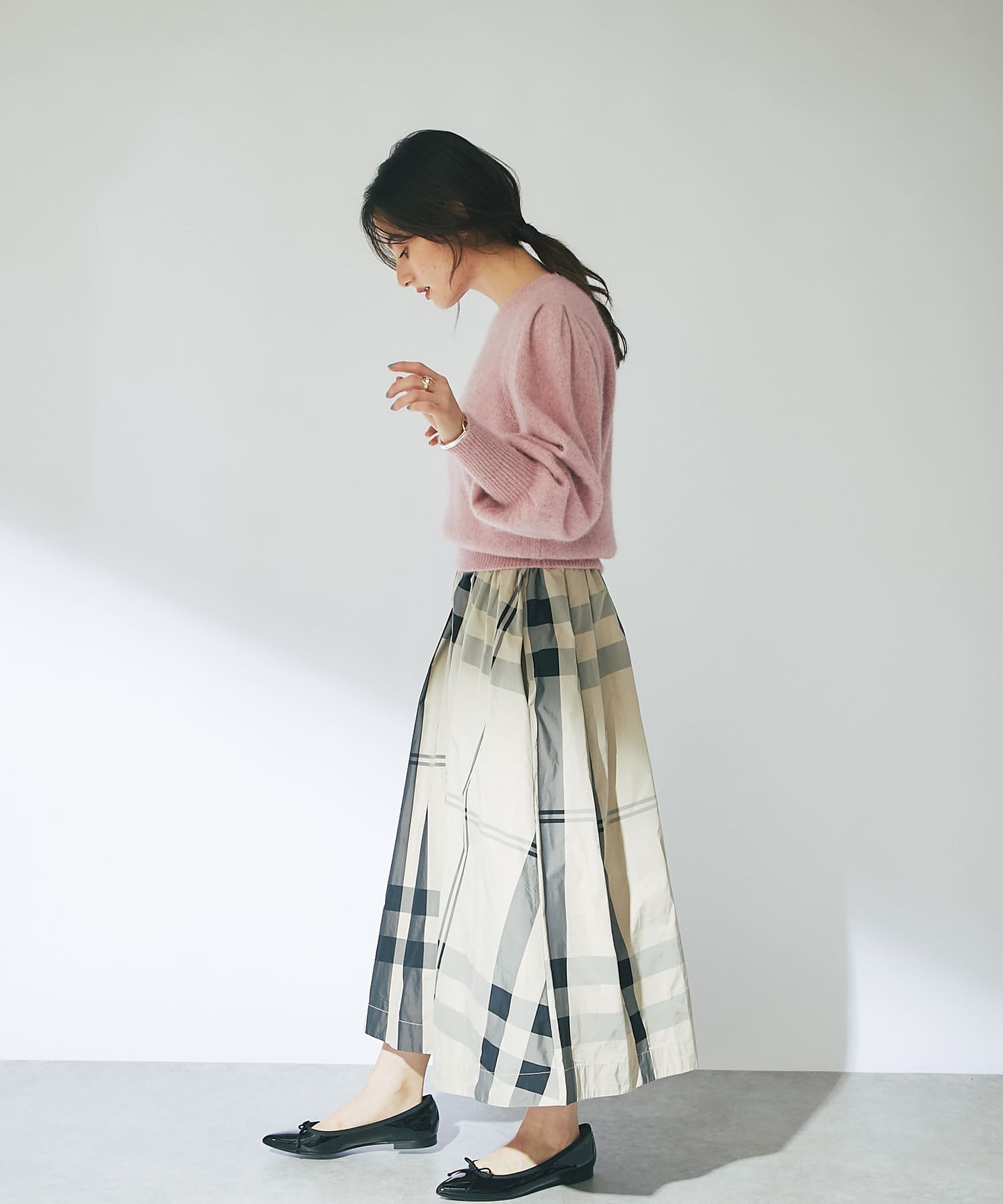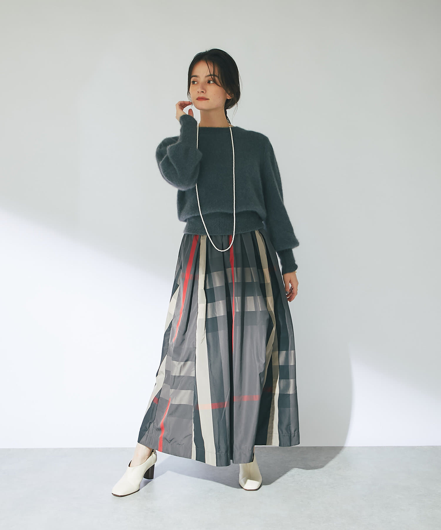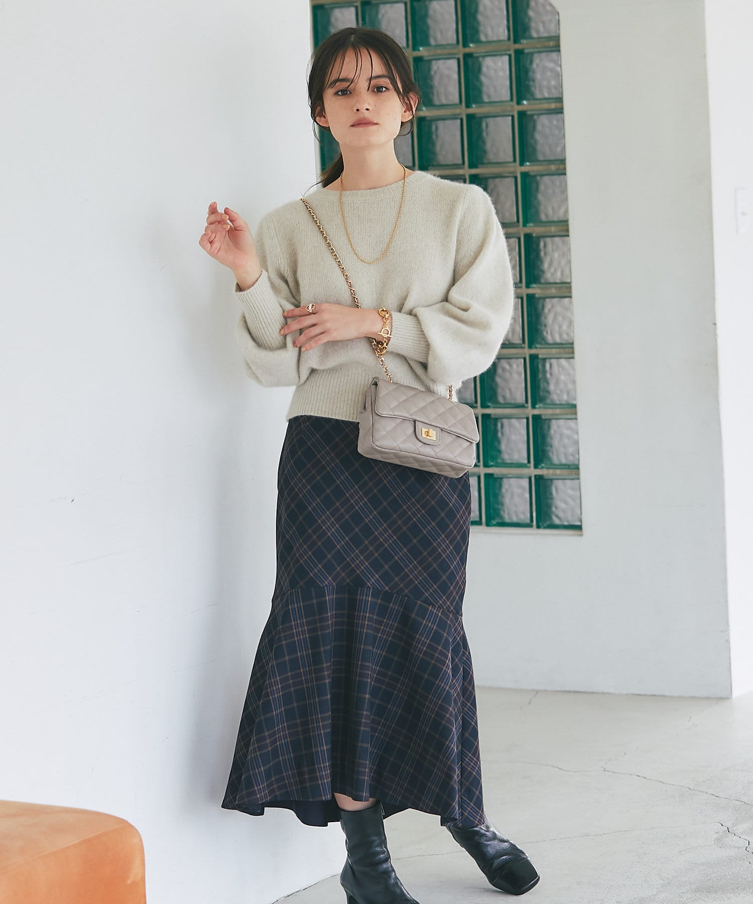 グレーのチェックスカートと合わせれば大人かわいい秋コーデの完成です。
