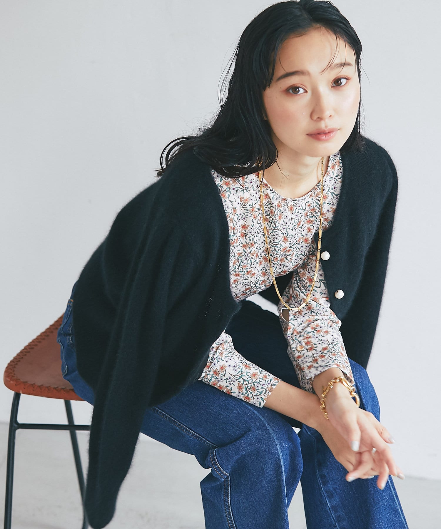 前を留めてプルオーバー風に着こなしたり、羽織りとしてもおすすめ。