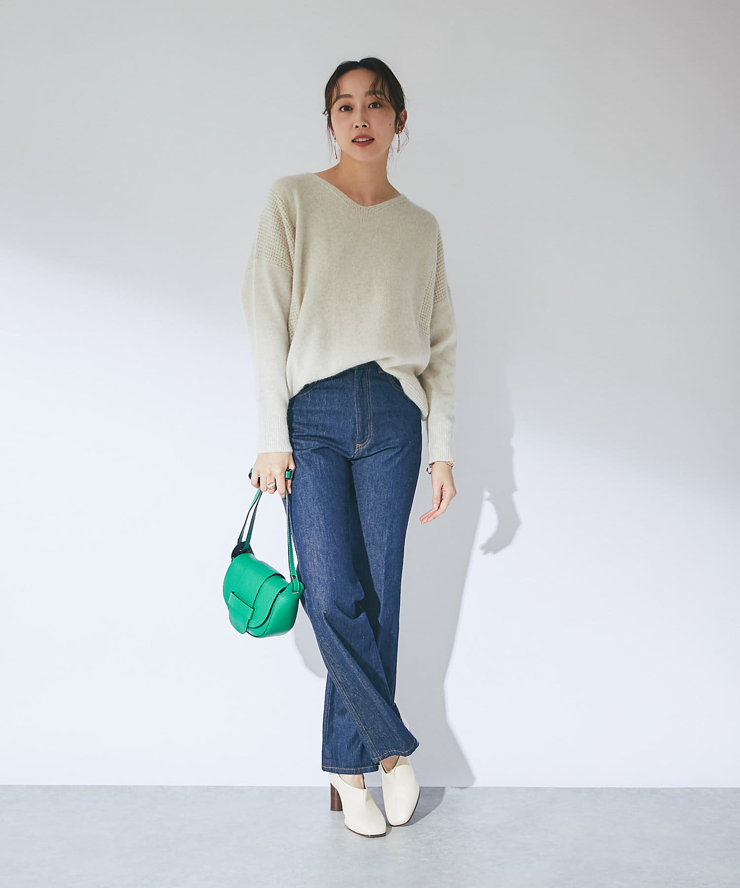 デニムに合わせるだけで大人っぽいワンツーコーデが完成。