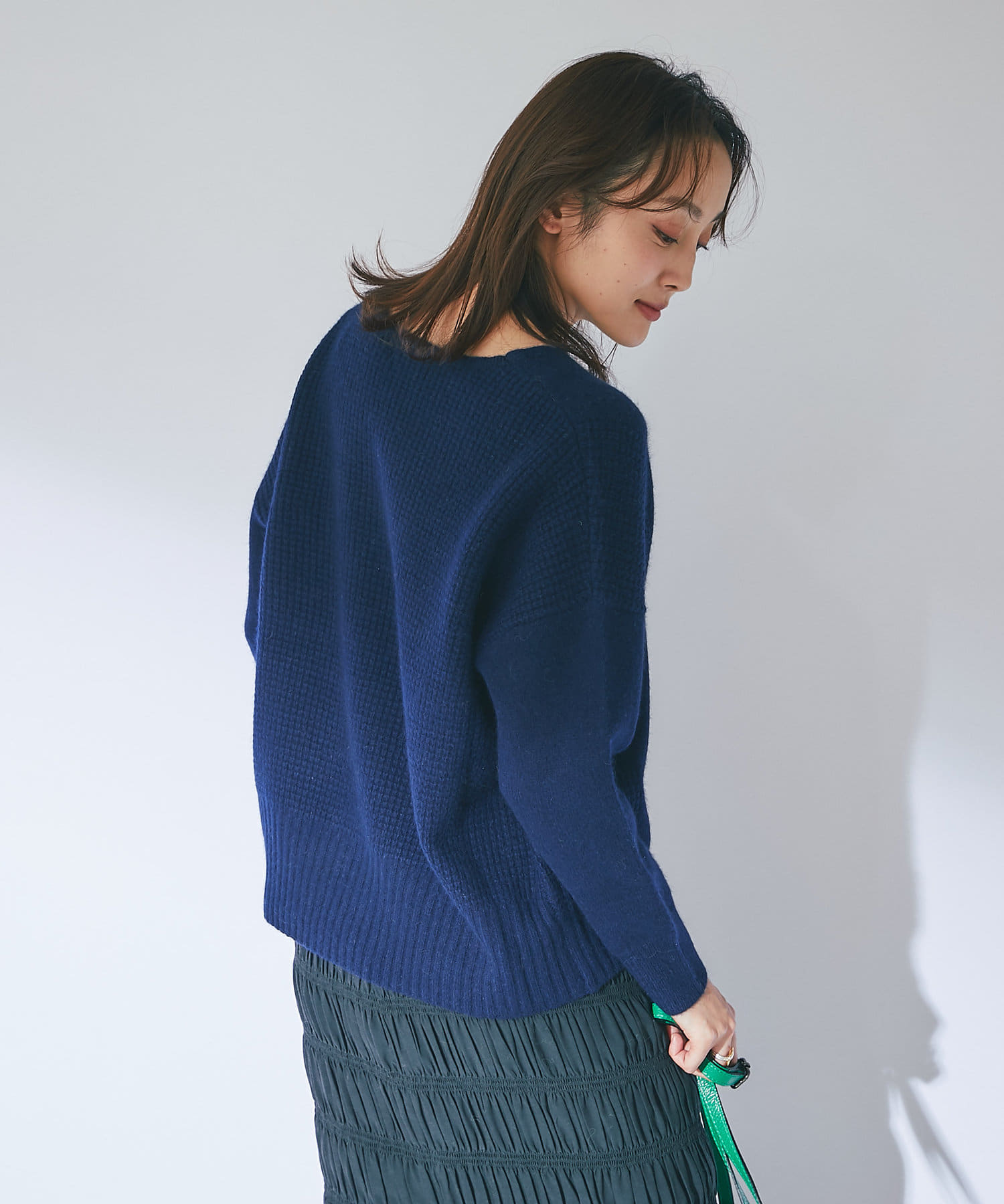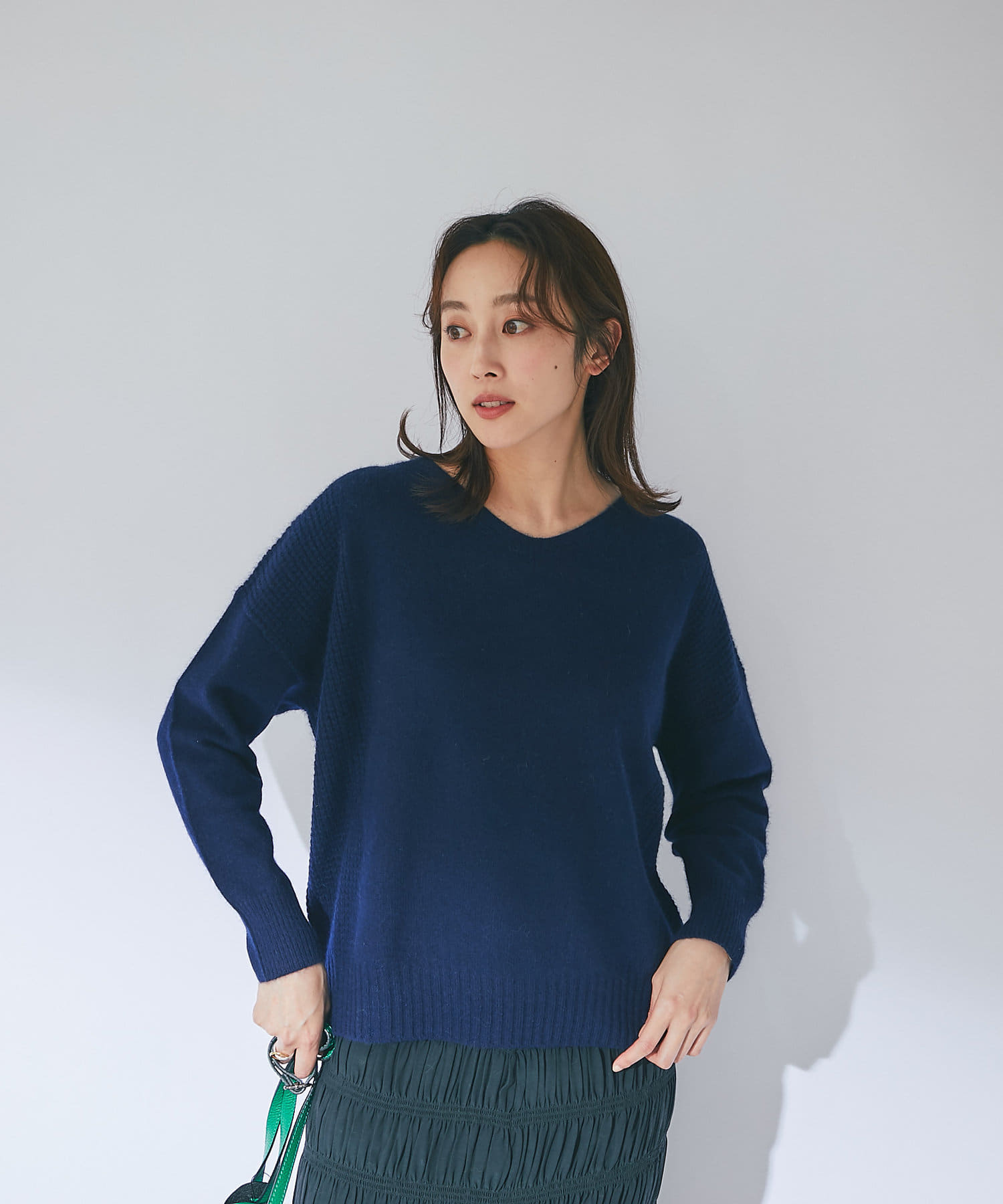 深すぎないVネックでデコルテラインを美しく演出し、カジュアルに着られますがカジュアルなだけではない、女性らしさを感じさせてくれます。
