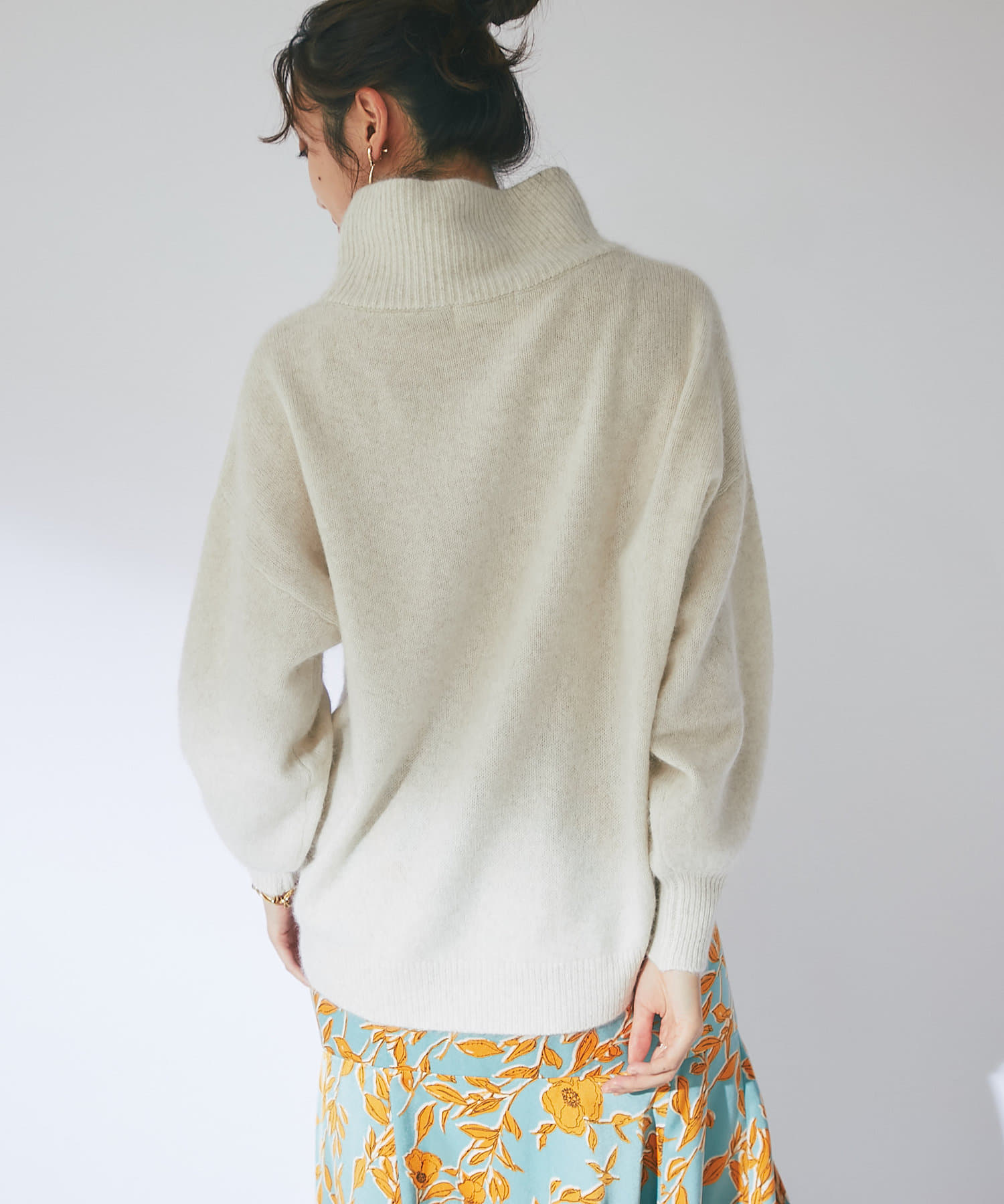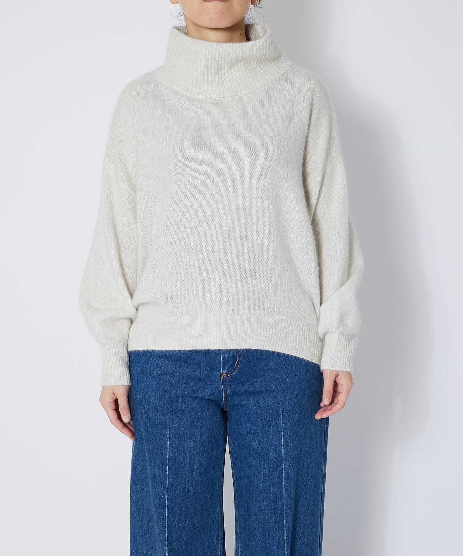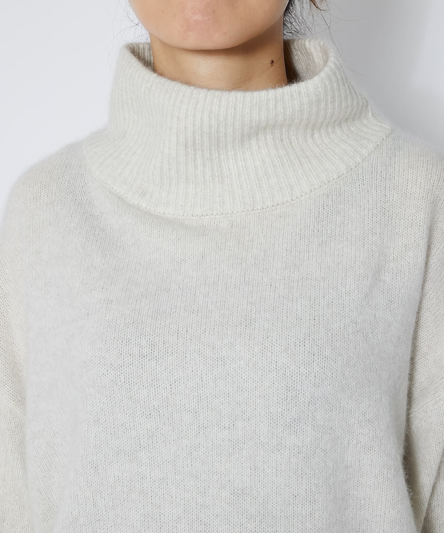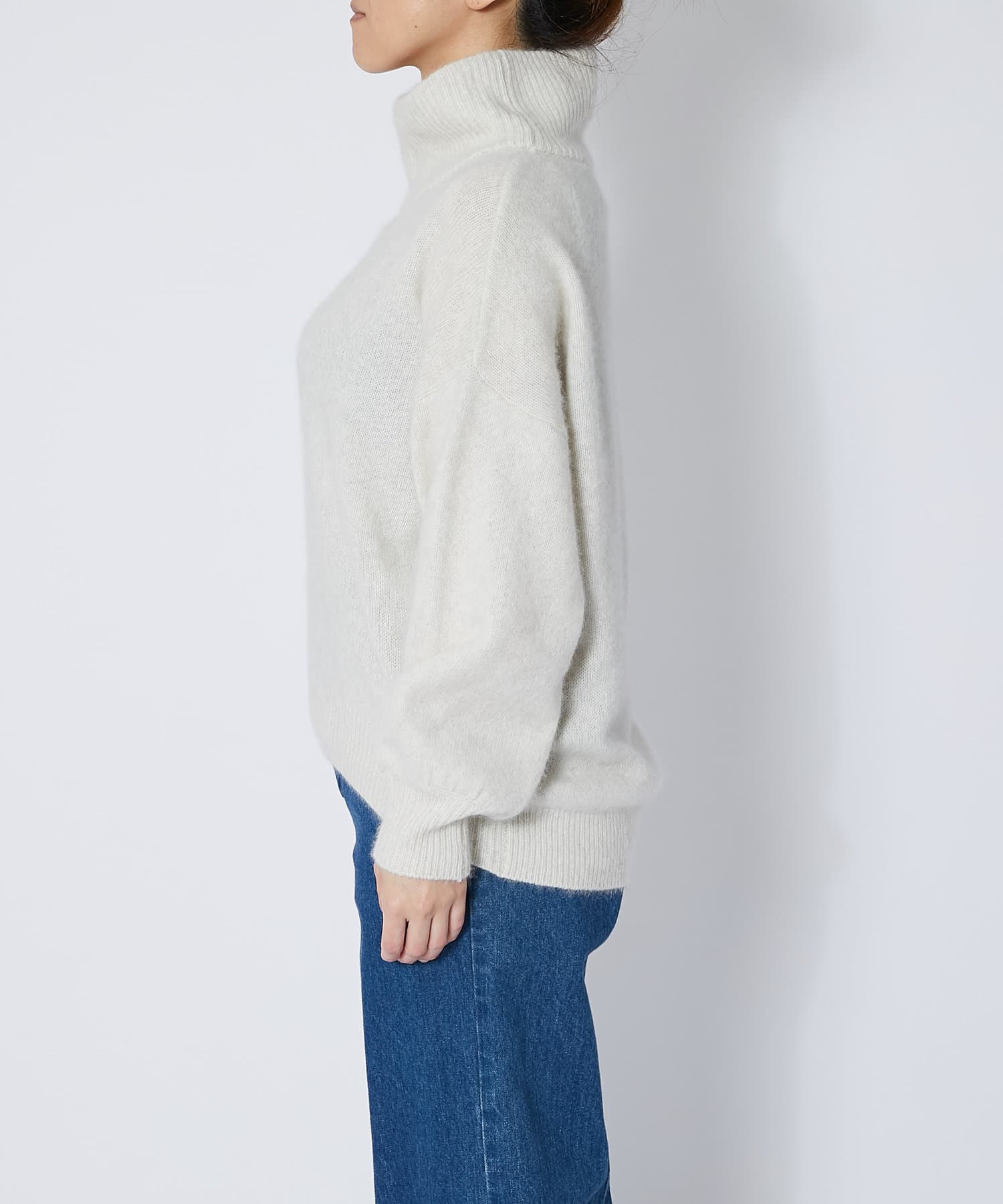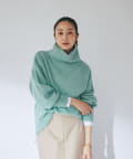 ネック部分はゆとりのあるオフタートルで、ルーズなフィット感。