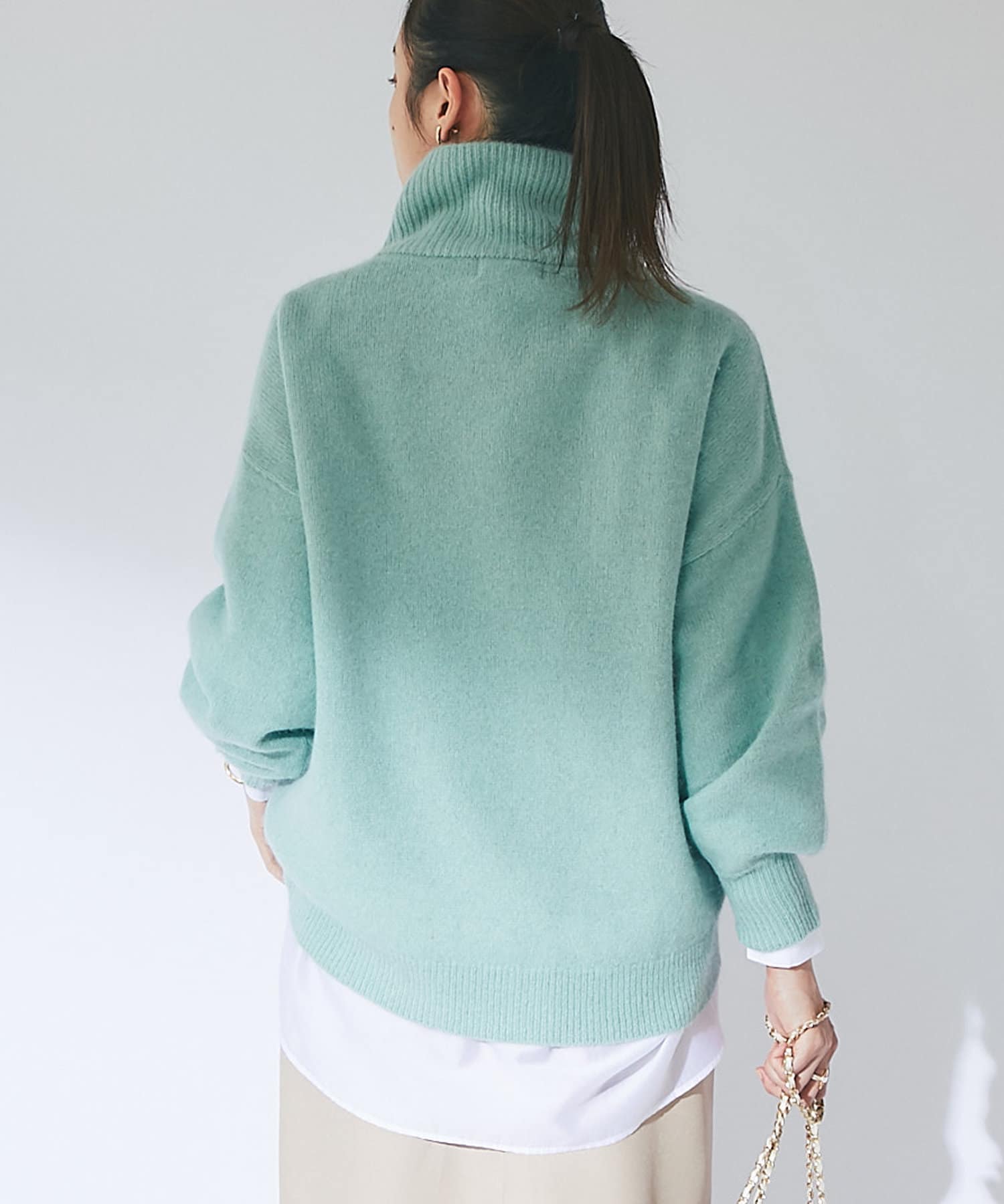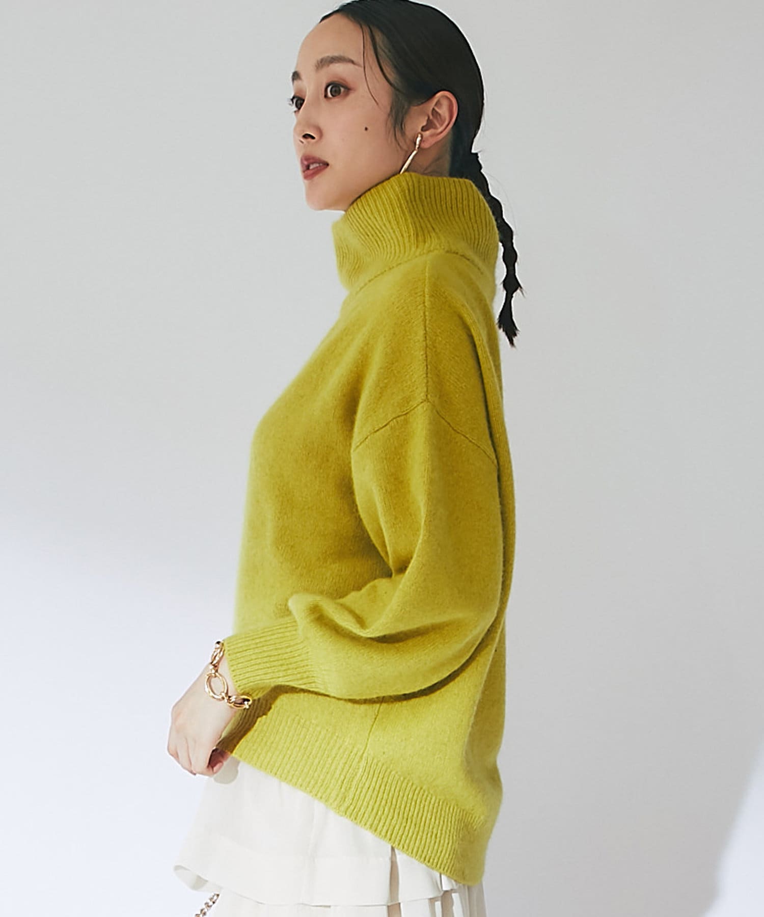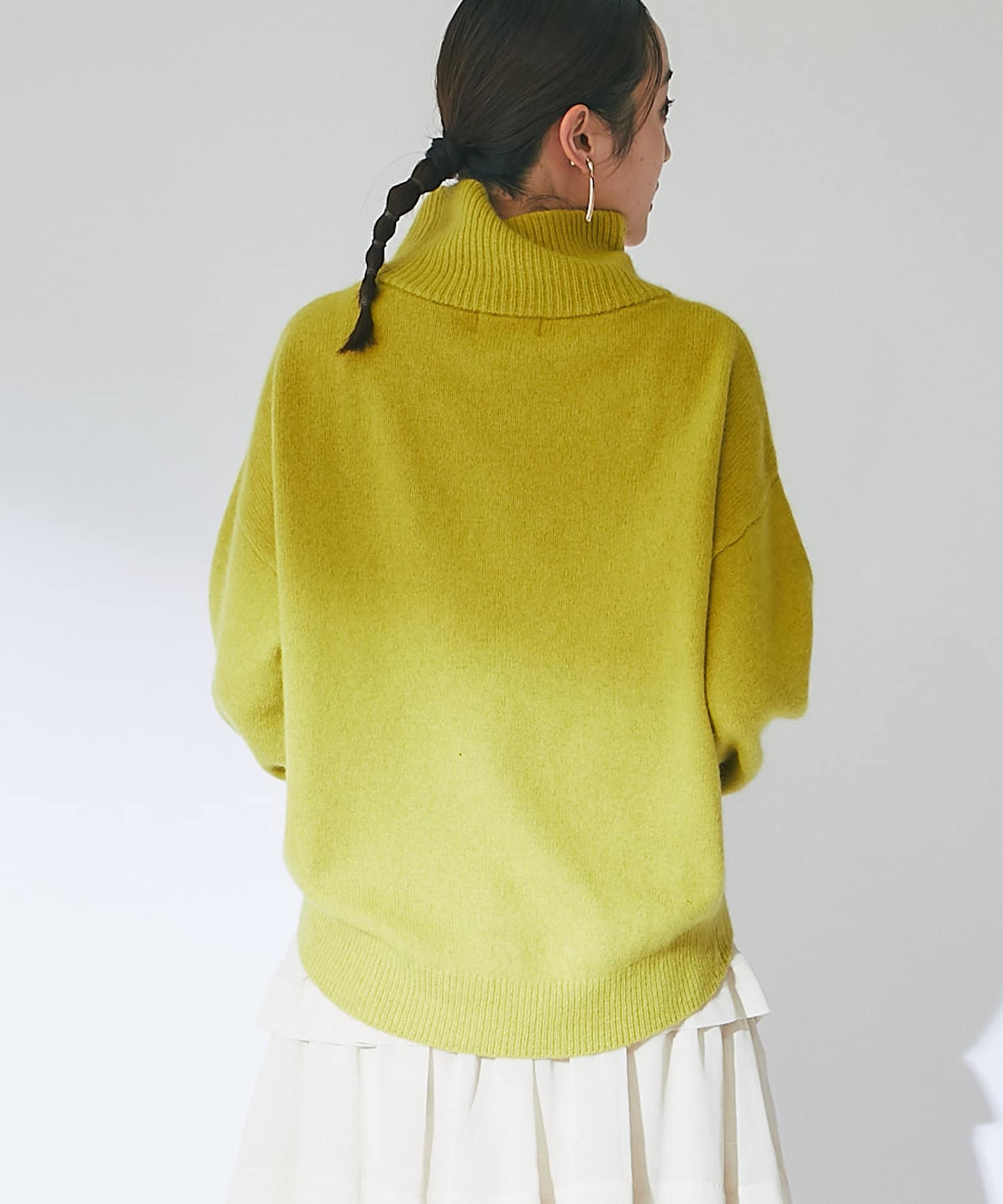 ネック部分はゆとりのあるオフタートルで、ルーズなフィット感。