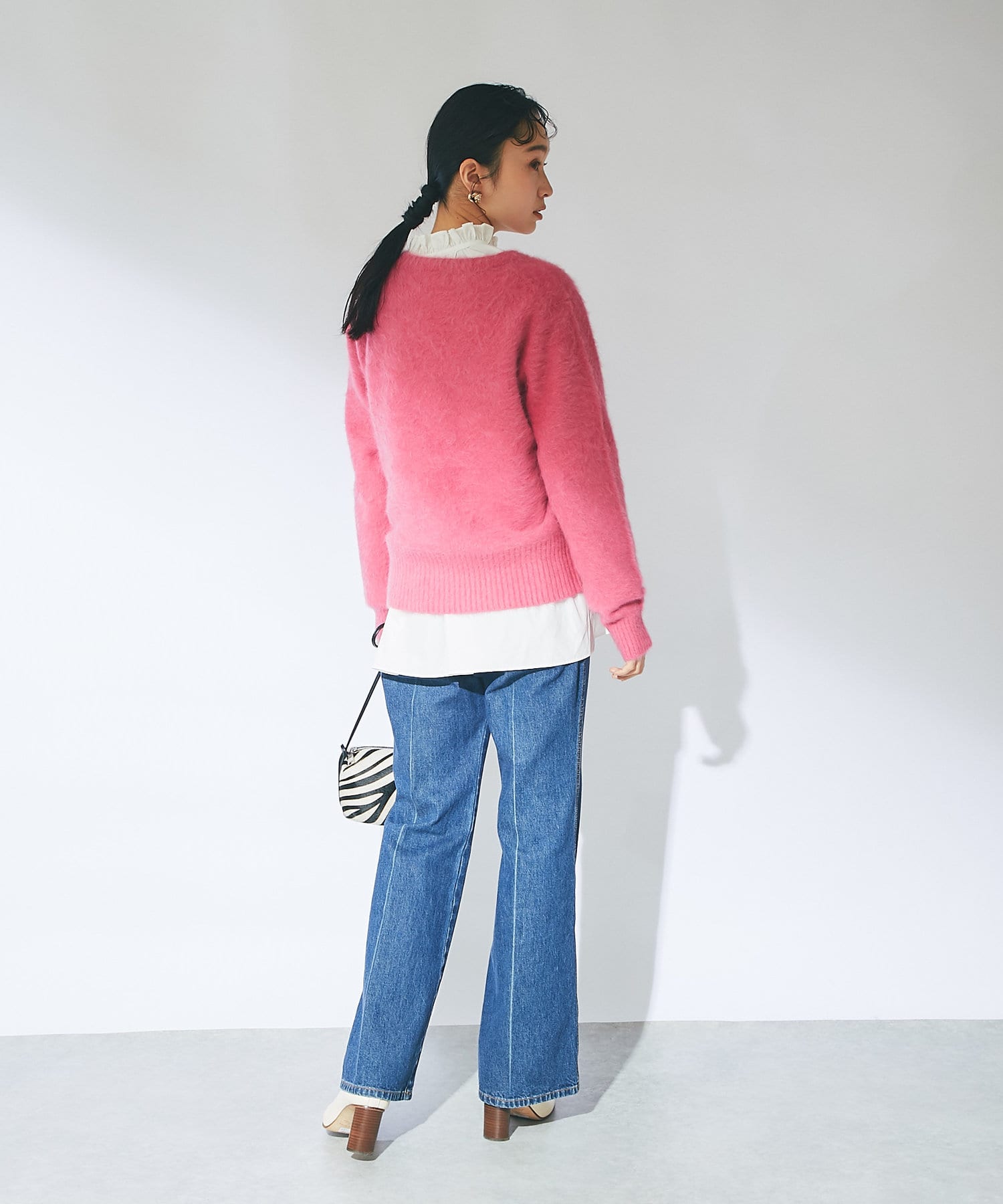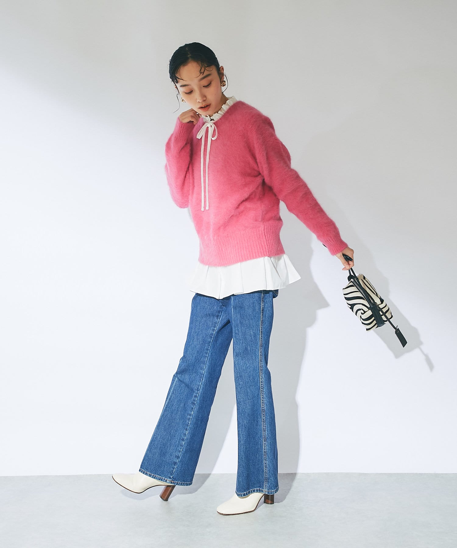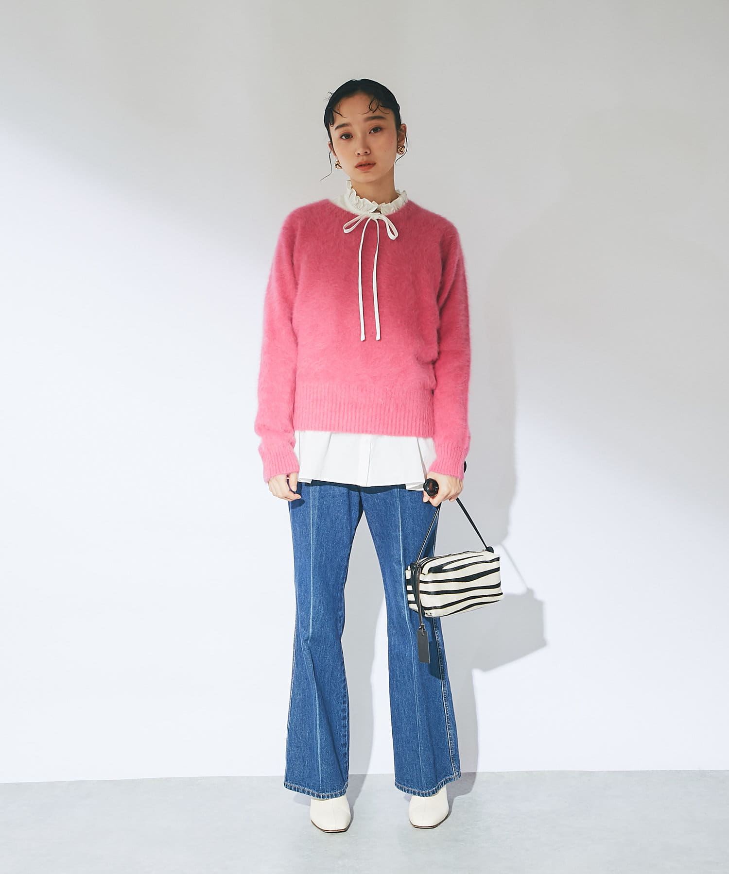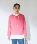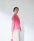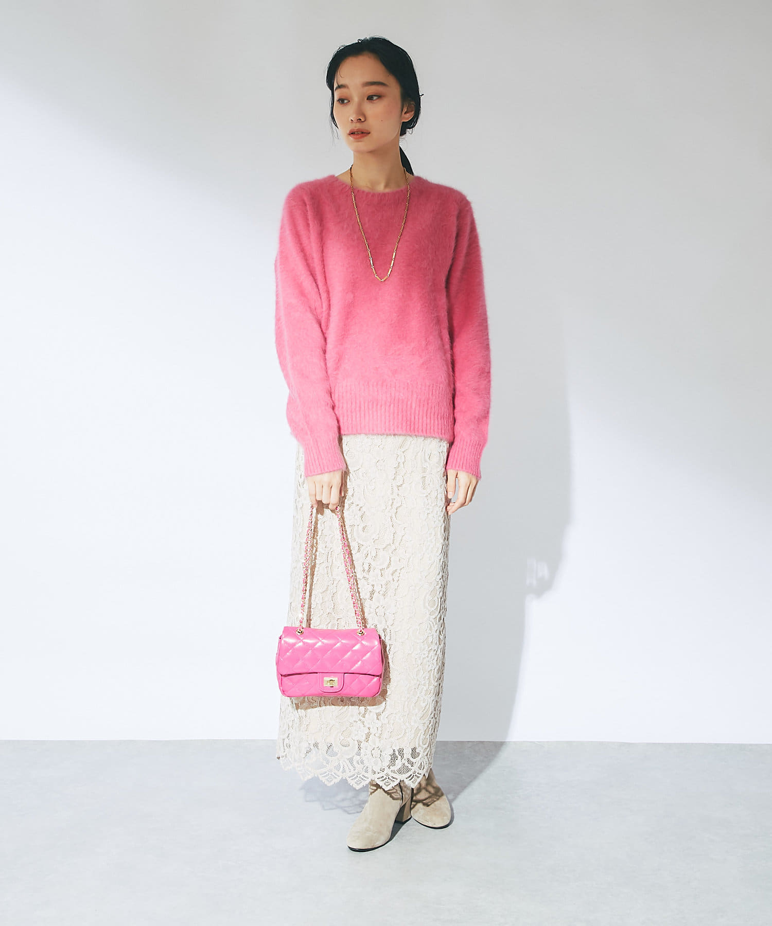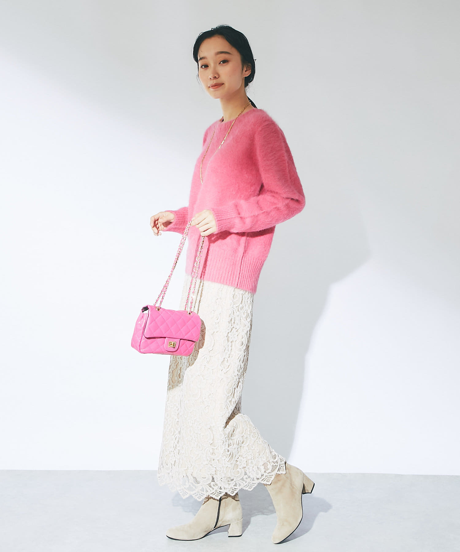 ニットは鮮やかなピンクで華やかな印象に。