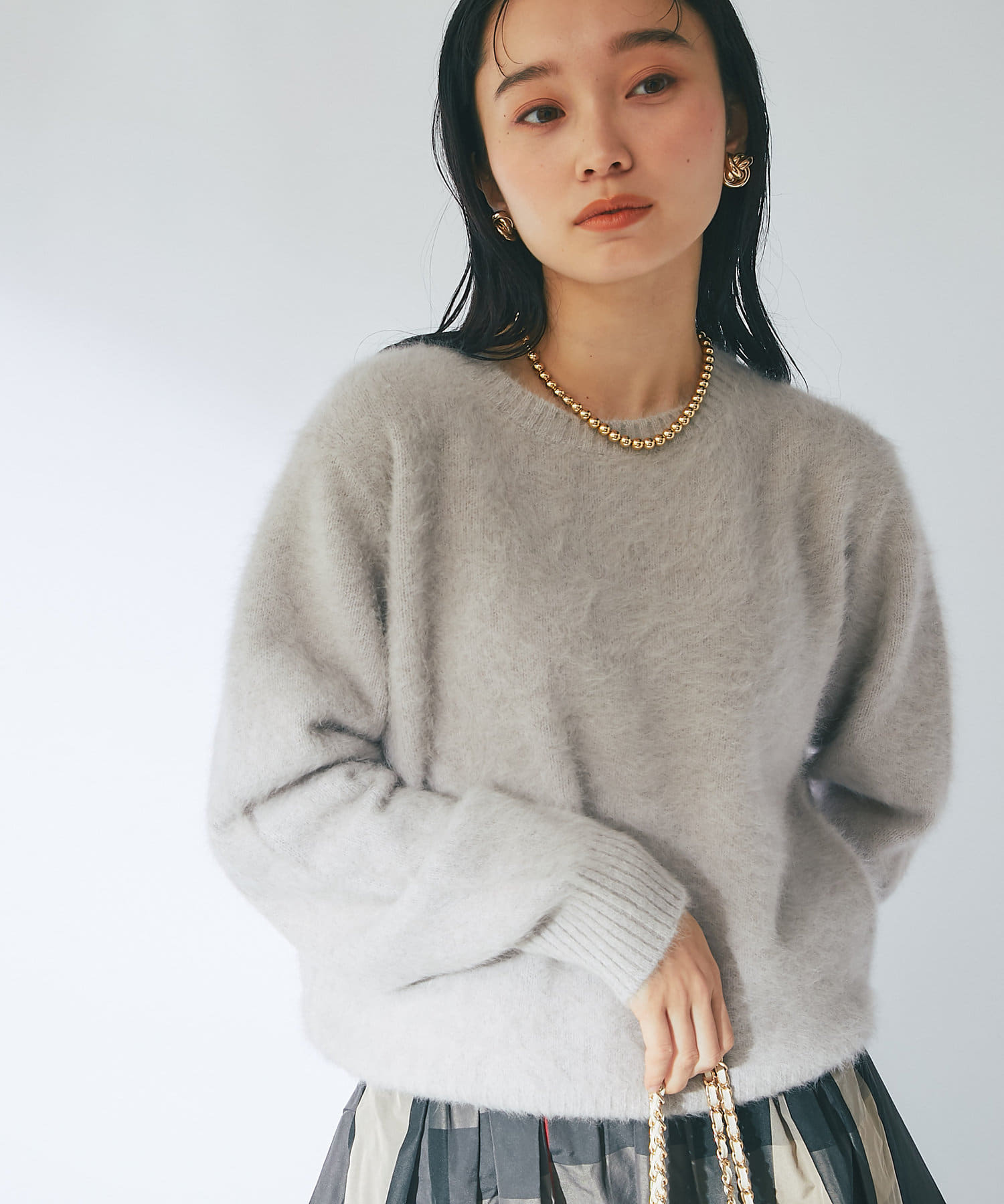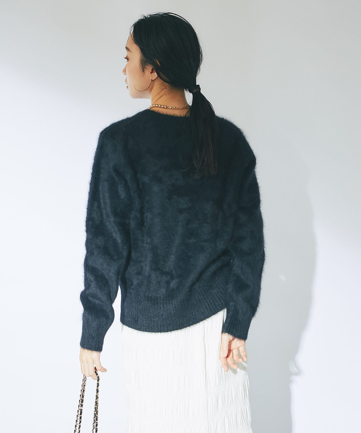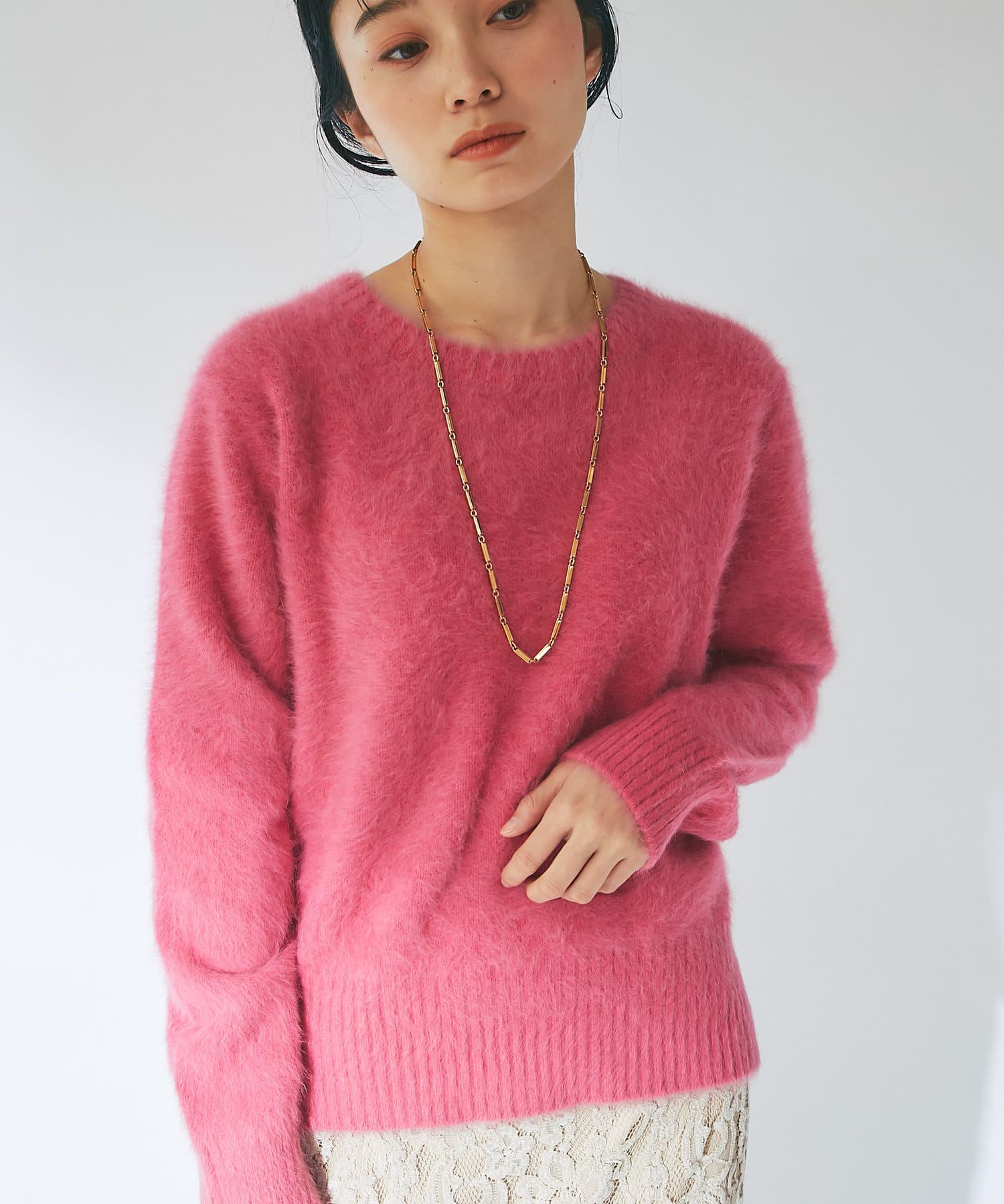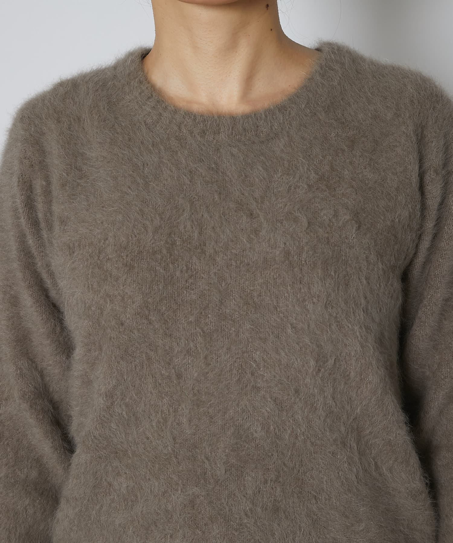 ふわふわとしたヘアリーなカシミヤ混フォックス素材で贅沢&シーズンムードたっぷりに仕上げたニット。